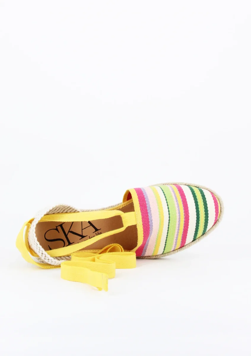 MORENA è una espadrillas in tessuto con punta chiusa e fettuccia dal dorso alla caviglia da annodare.