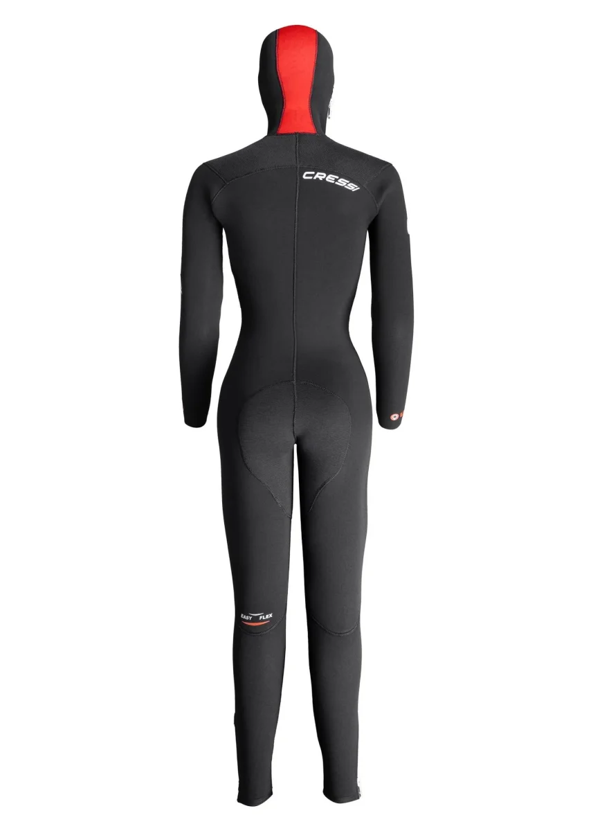 Molto facile e veloce da indossare, studiata per offrire una grande libertร di movimenti. Le gambe sono preformate per consentire la naturale, tipica flessione degli arti durante la pinneggiata. La cerniera frontale si estende dalla vita alla guancia destra. Una guarnizione in neoprene lisco corre lungo il profilo facciale del cappuccio, limitando le infiltrazione dโacqua e aumentando il comfort. Alle ginocchia sono applicati rinforzi antiusura. Ai polsi la tenuta รจ garantita da manicotti bifoderati, stessa soluzione adottata alle caviglie, in questo caso perรฒ abbinata a delle comode cerniere per agevolare lโindossamento.