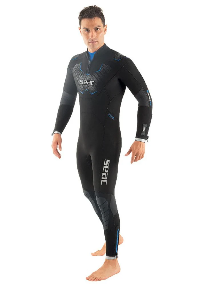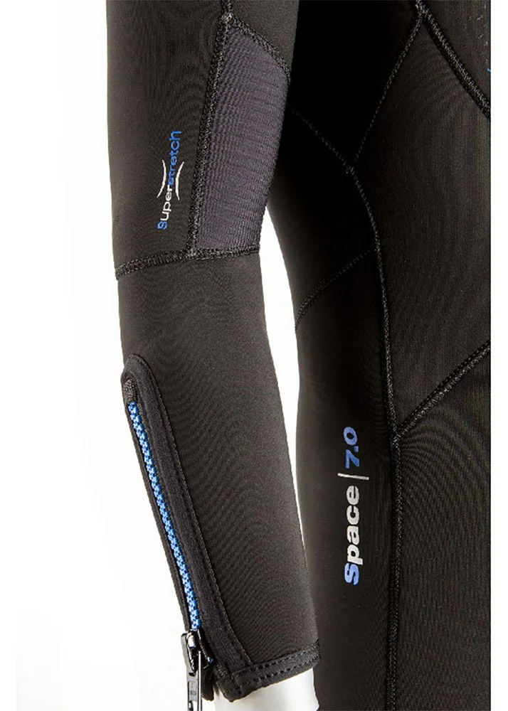 Su polsini e caviglie il sistema Aquastop è a doppio cono di neoprene con cerniera. Seac Space consente ampia libertà di movimento, grazie anche agli inserti goffrati in corrispondenza dell’interno dei gomiti e dietro le ginocchia.