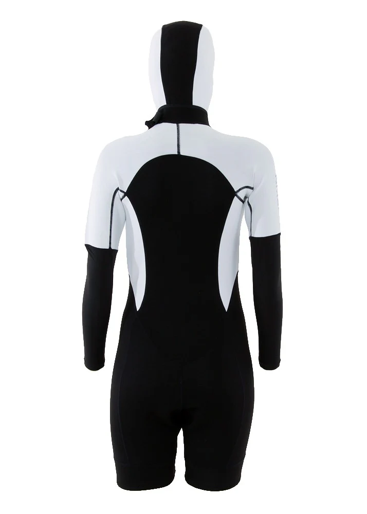 - Le estremità in glide skin sulle gambe, insieme alla chiusura del collo ergonomica e al cappuccio da 0,5 mm creano una shorty estremamente resistente all’acqua