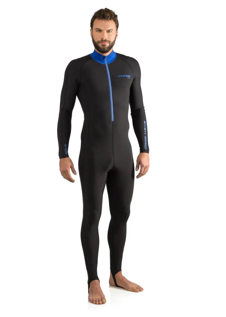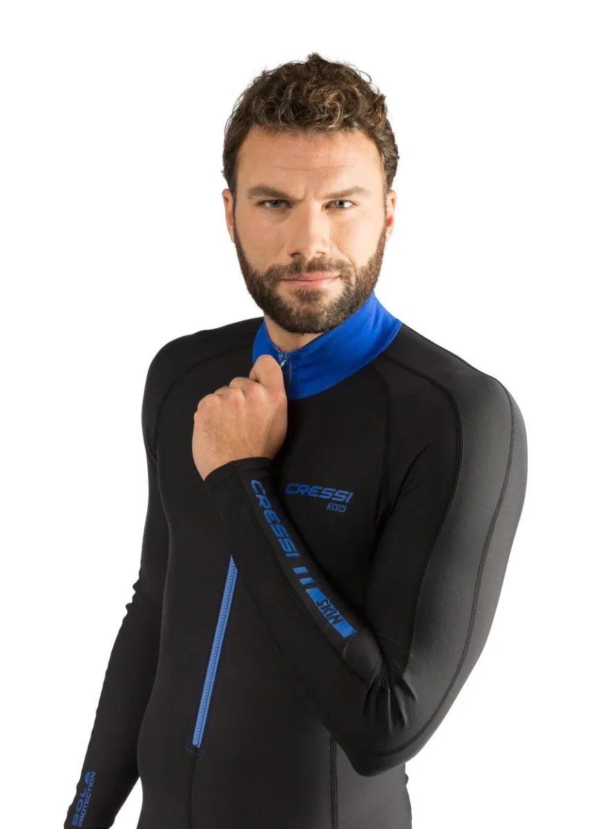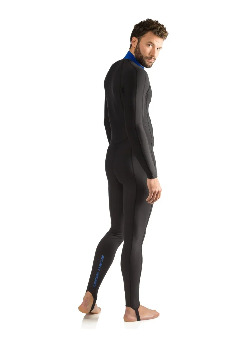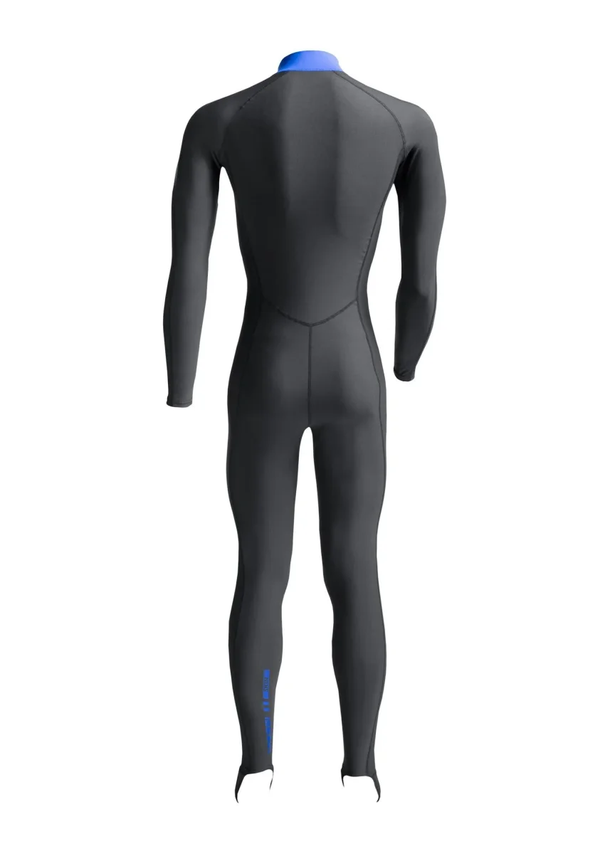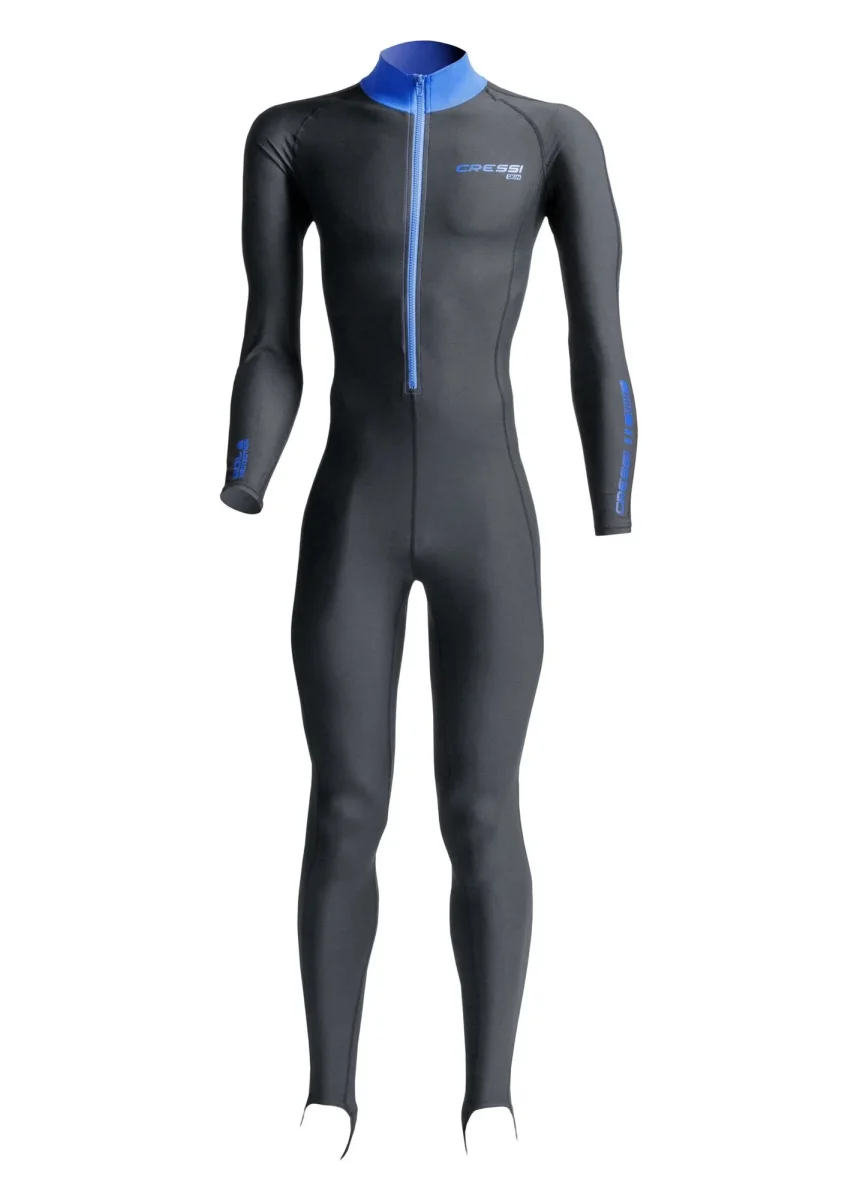 La skin fornisce protezione dai raggi uv sulla superficie e il calore necessario per lunghe sessioni di snorkeling o immersioni in acque tropicali. Una lunga cerniera anteriore rende la skin facile da indossare e il completo si può tranquillamente mettere sotto a una muta più spessa