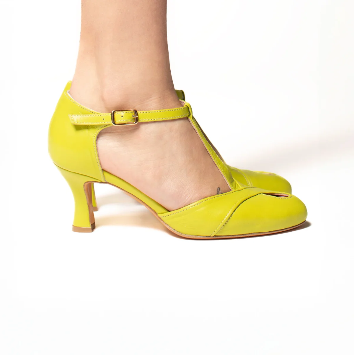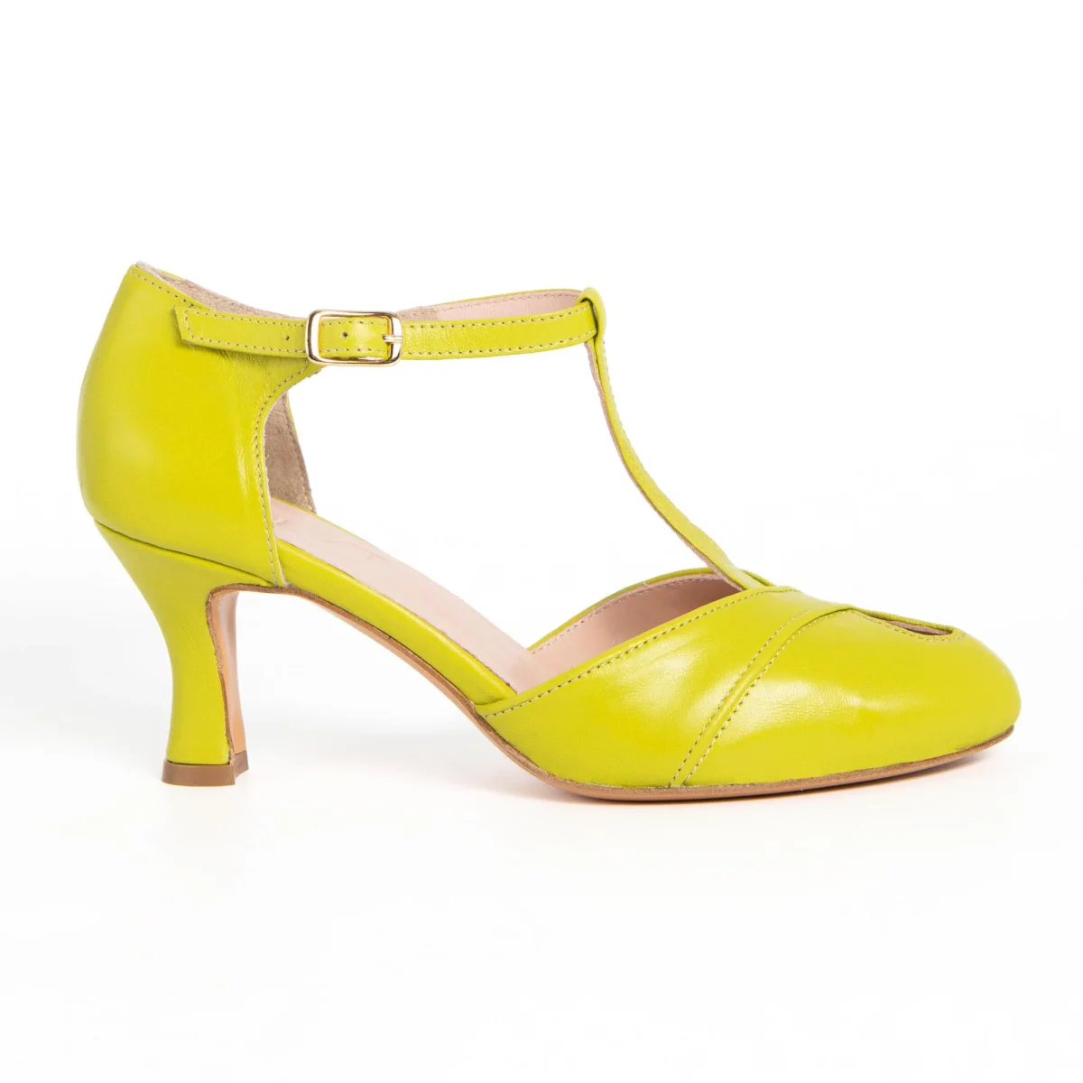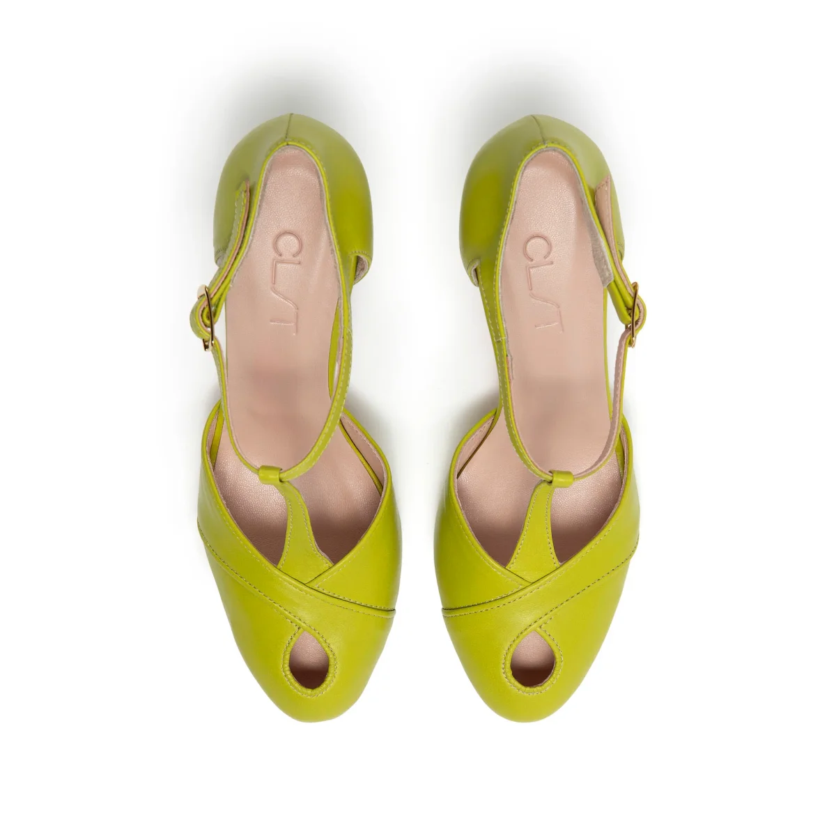 Scarpa in pelle a punta tonda con T-strap e cinturino raccordato e regolabile alla caviglia. Sottopiede in pelle, suolo in cuoio e tacco rivestito di 7cm