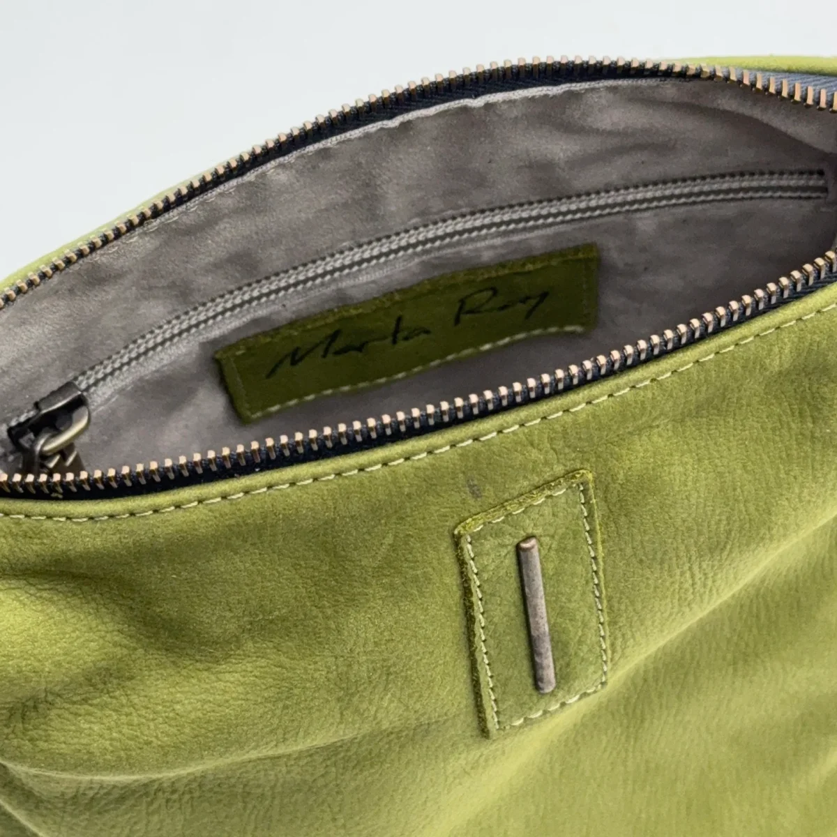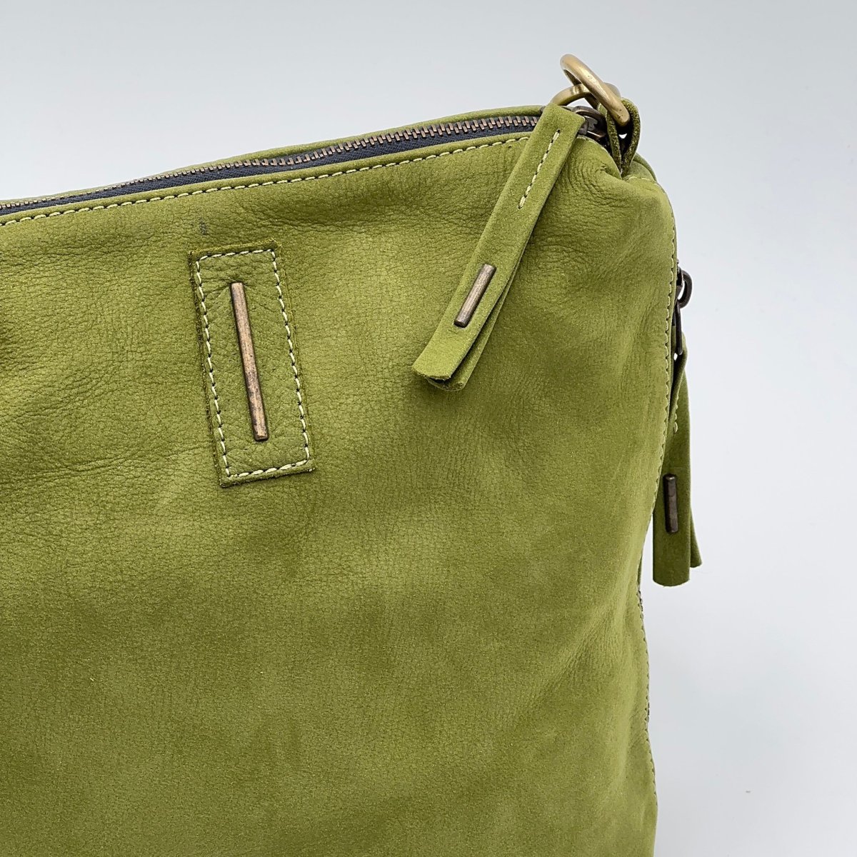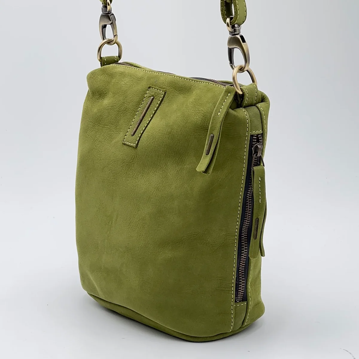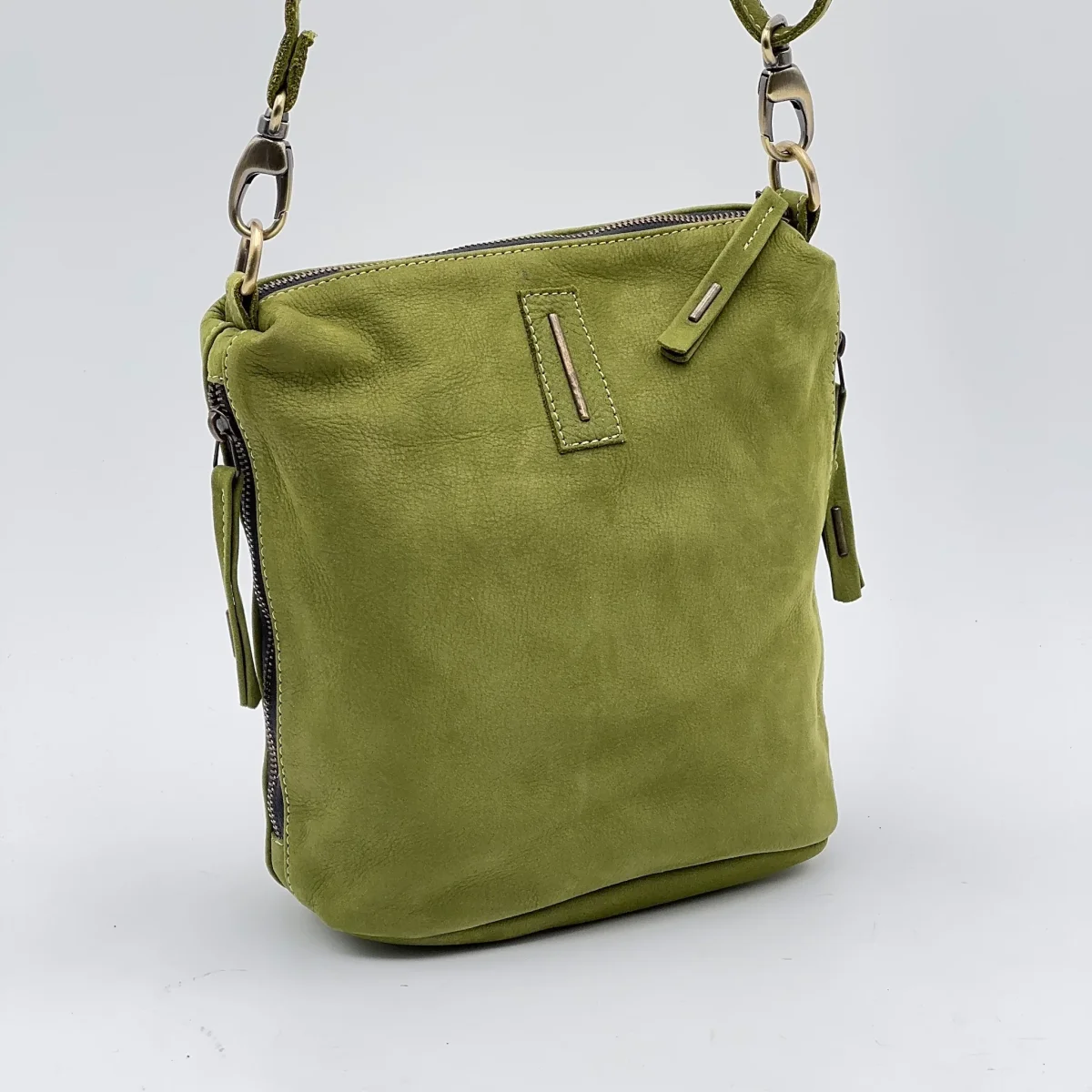 Piccola borsa in pelle Long Beach verde chiaro “Mosstone”.Chiusura con zip in ottone, e tasca interna con zip. Due tasche laterali, con zip, e tracolla regolabile per uso a spalla o crossbody. Fodera in microfibra. Dimensioni: Larghezza 20cm, Altezza 19cm, Profondità 6cm, Tracolla regolabile 120cm