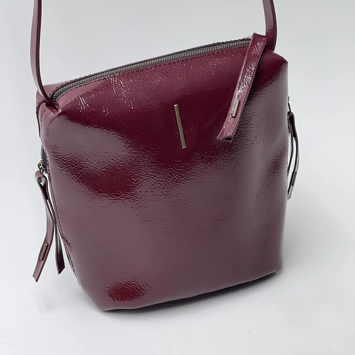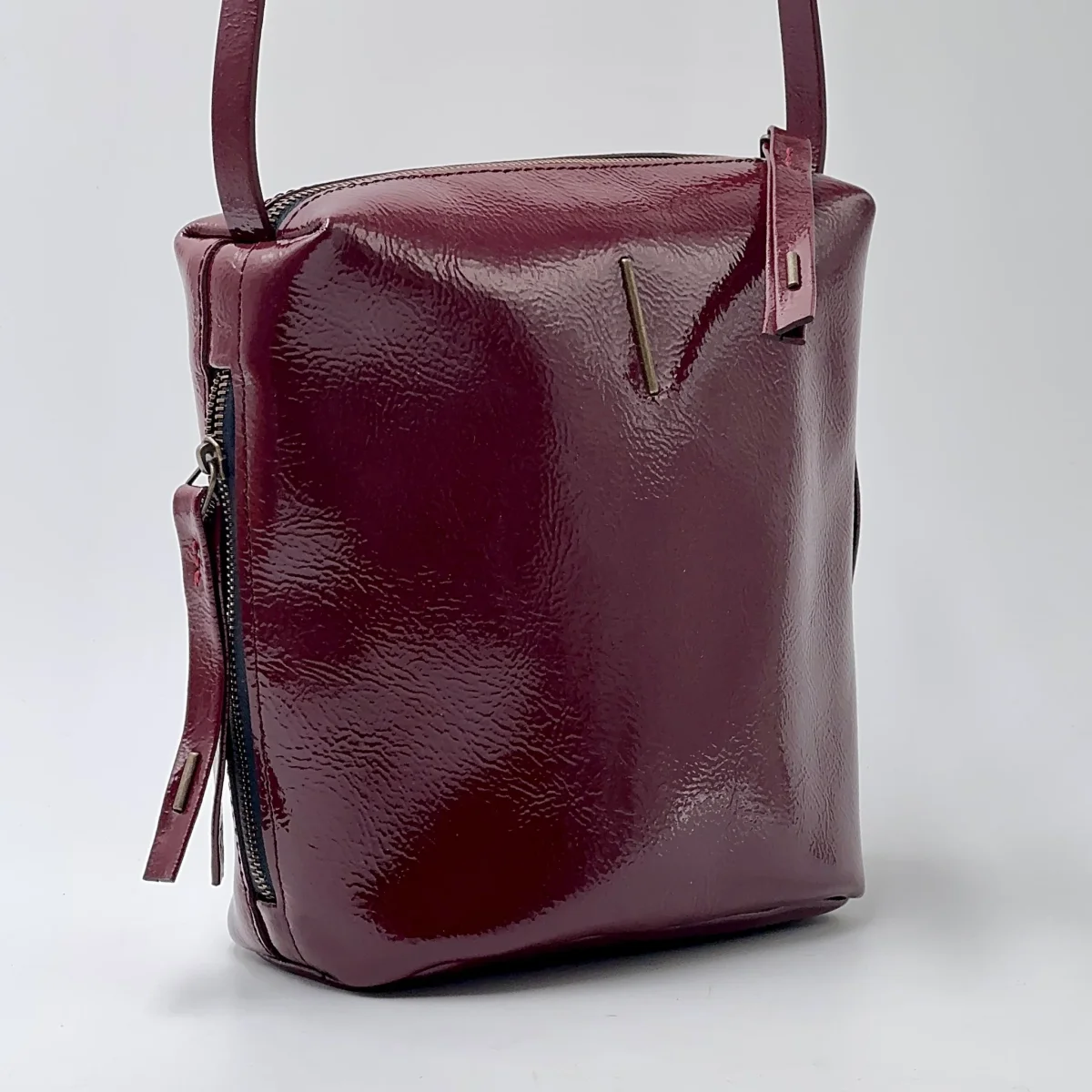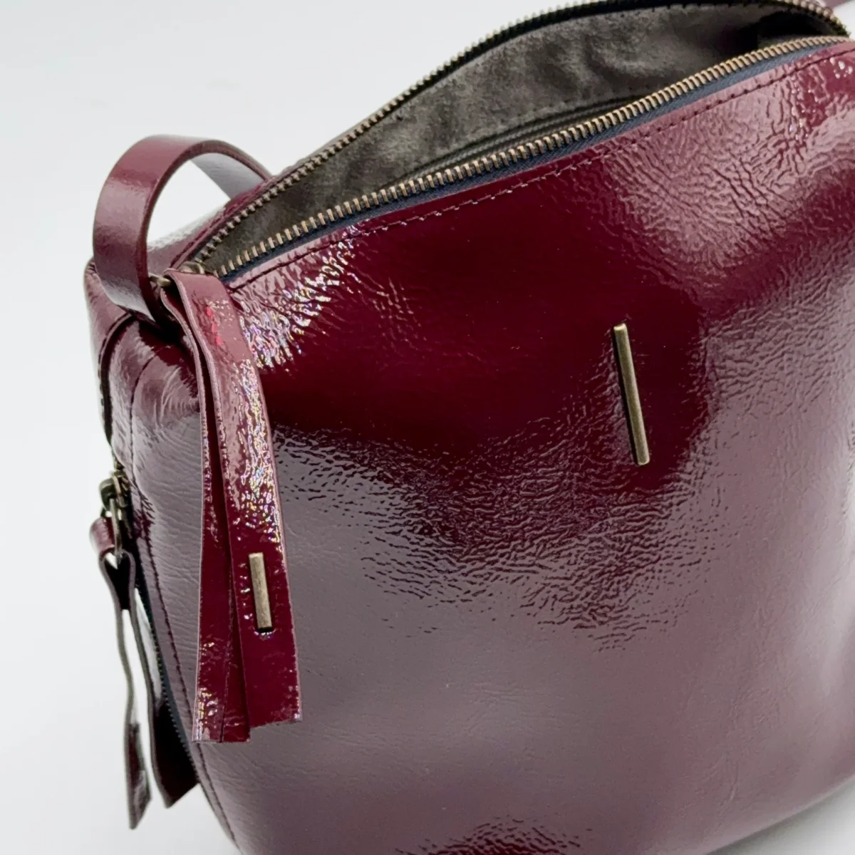 Piccola borsa in pelle glossy color rubio.Chiusura con zip in ottone, e tasca interna con zip. Due tasche laterali, con zip, e tracolla regolabile per uso a spalla o crossbody. Fodera in microfibra.