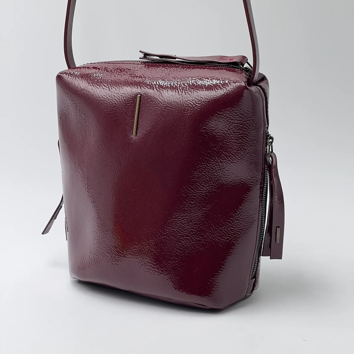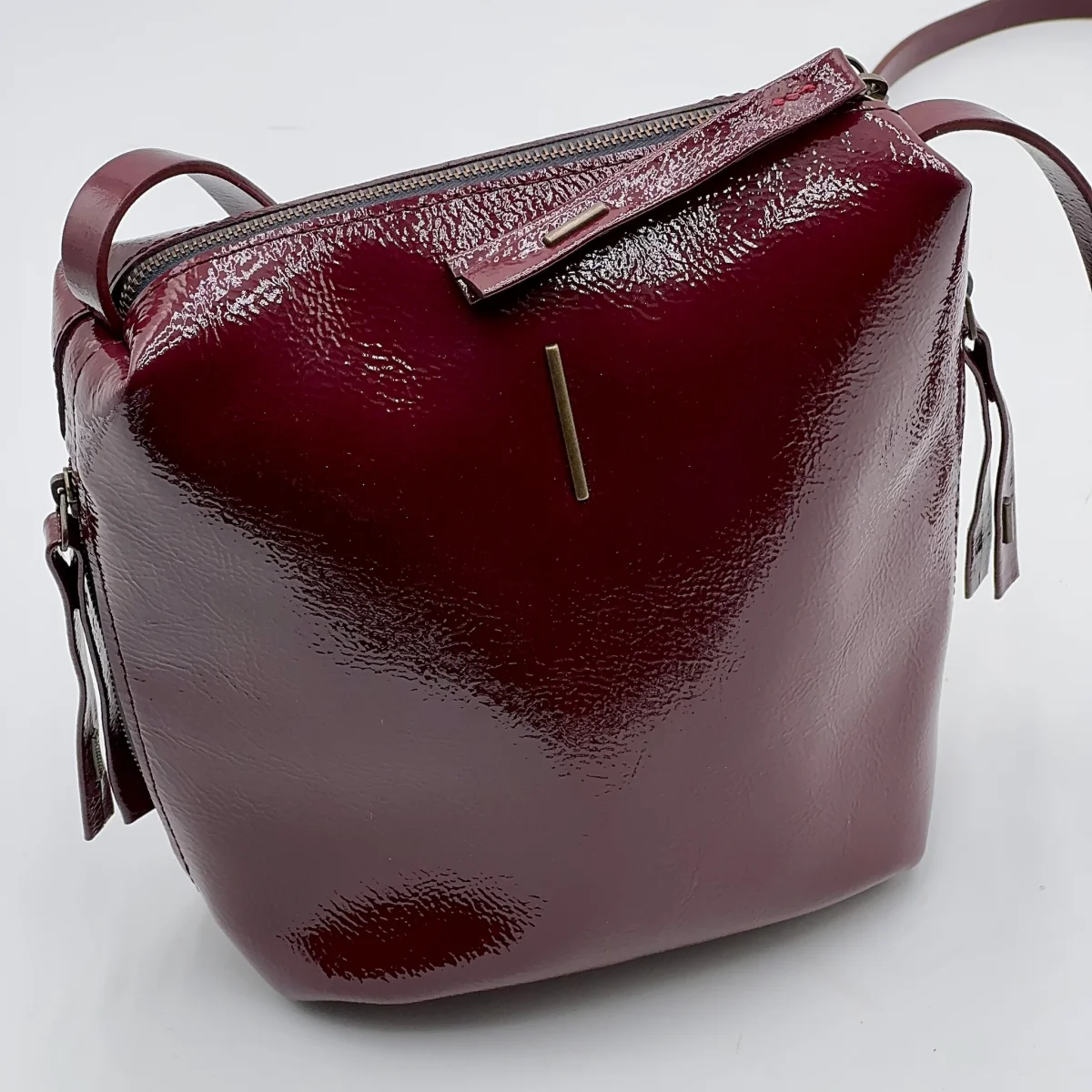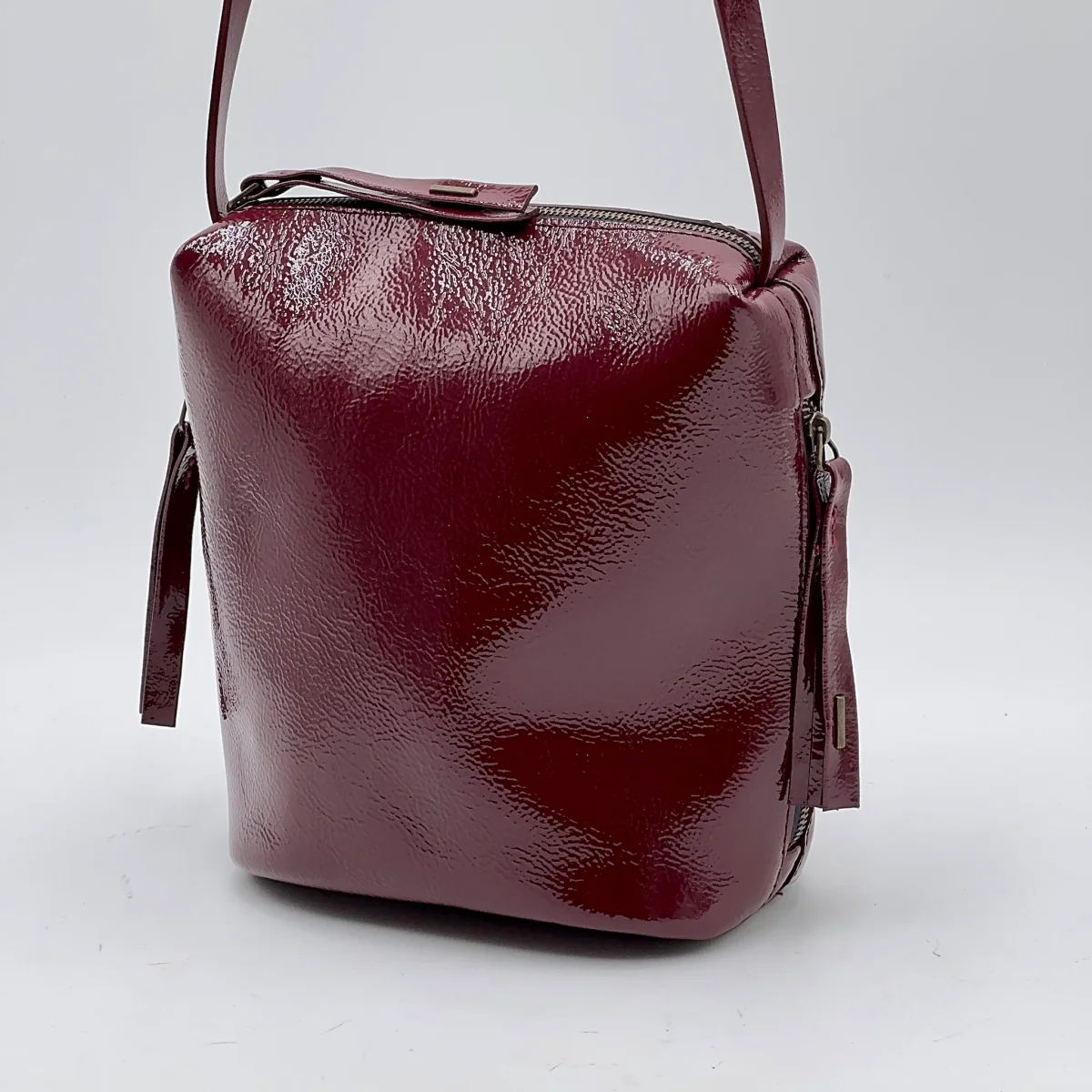 Piccola borsa in pelle glossy color rubio.Chiusura con zip in ottone, e tasca interna con zip. Due tasche laterali, con zip, e tracolla regolabile per uso a spalla o crossbody. Fodera in microfibra.