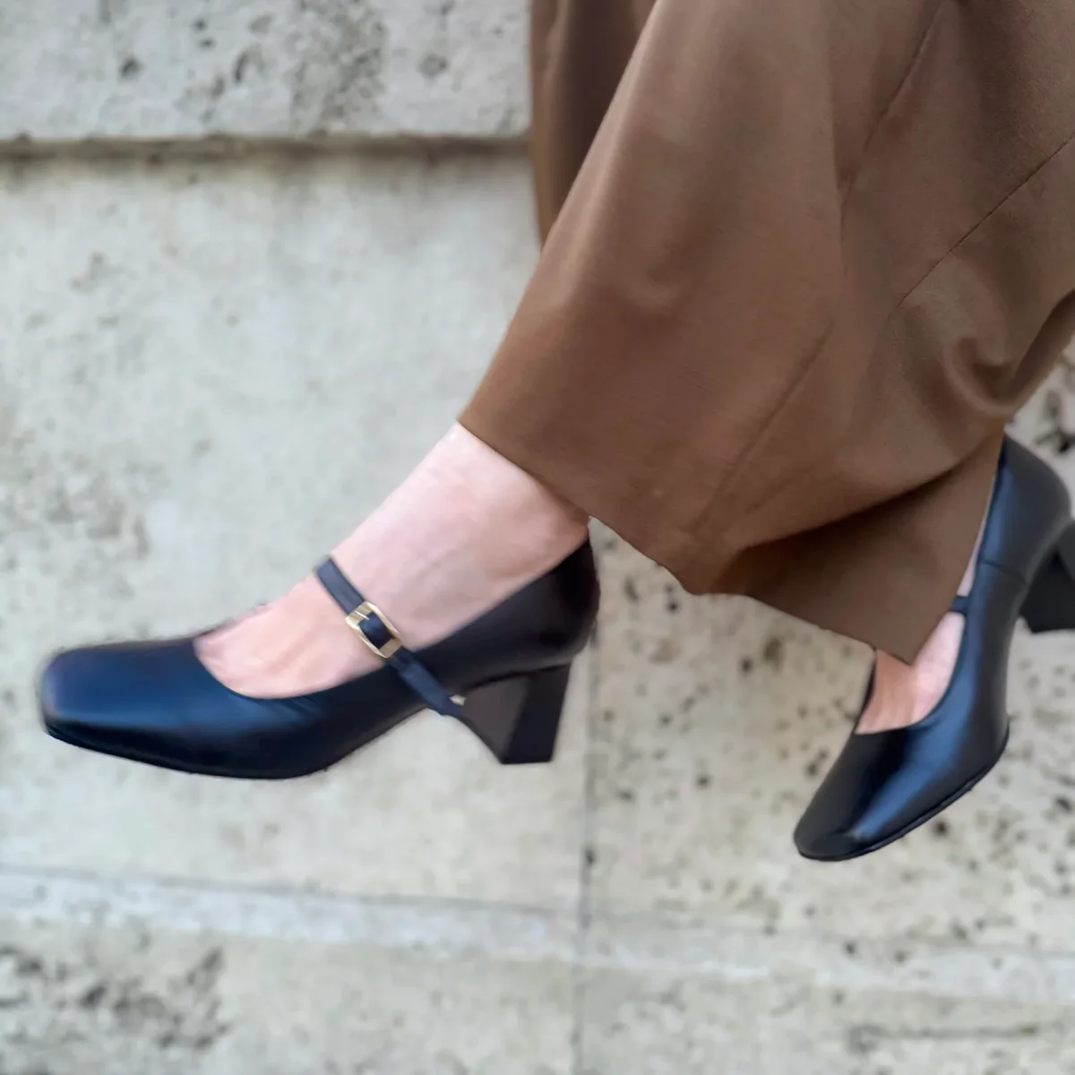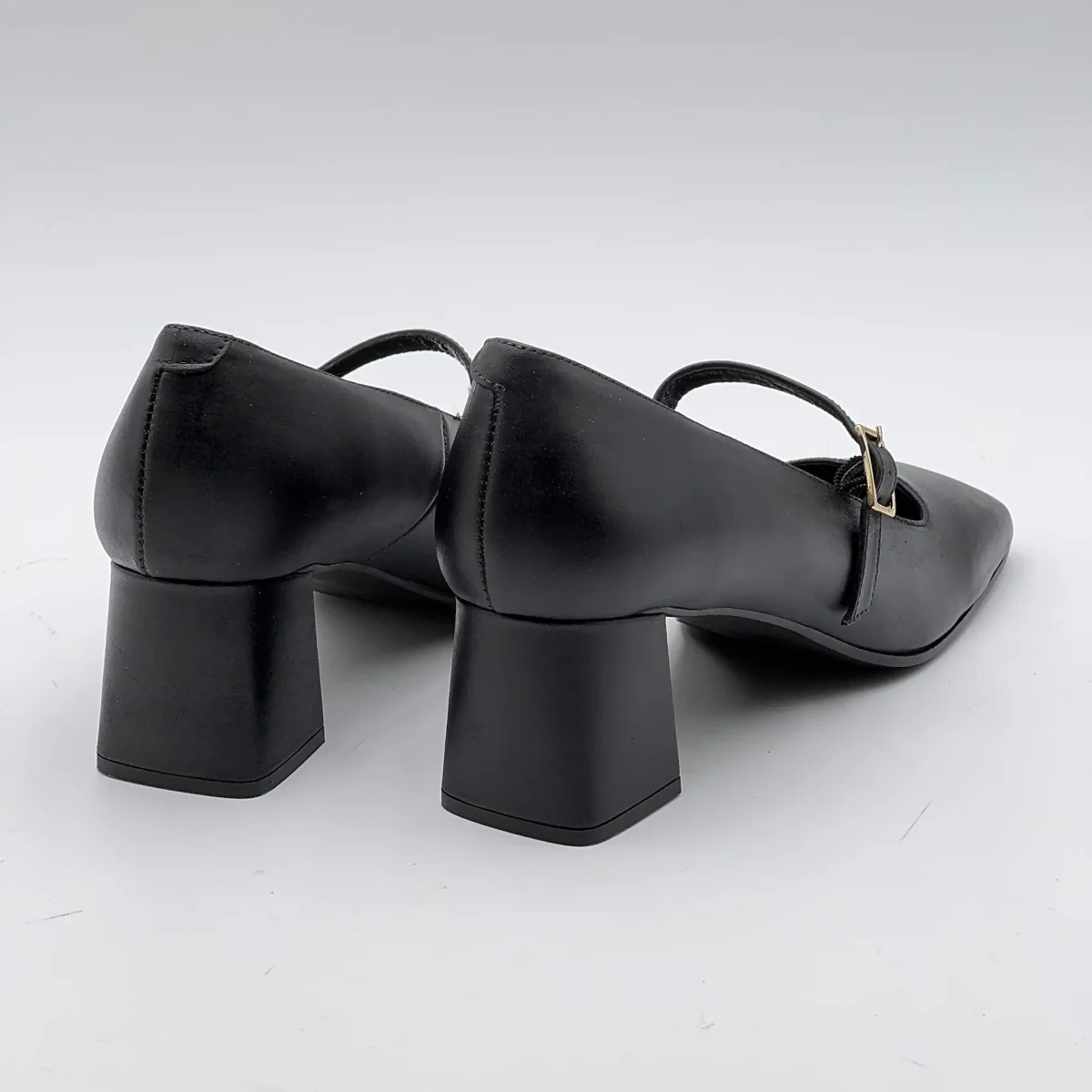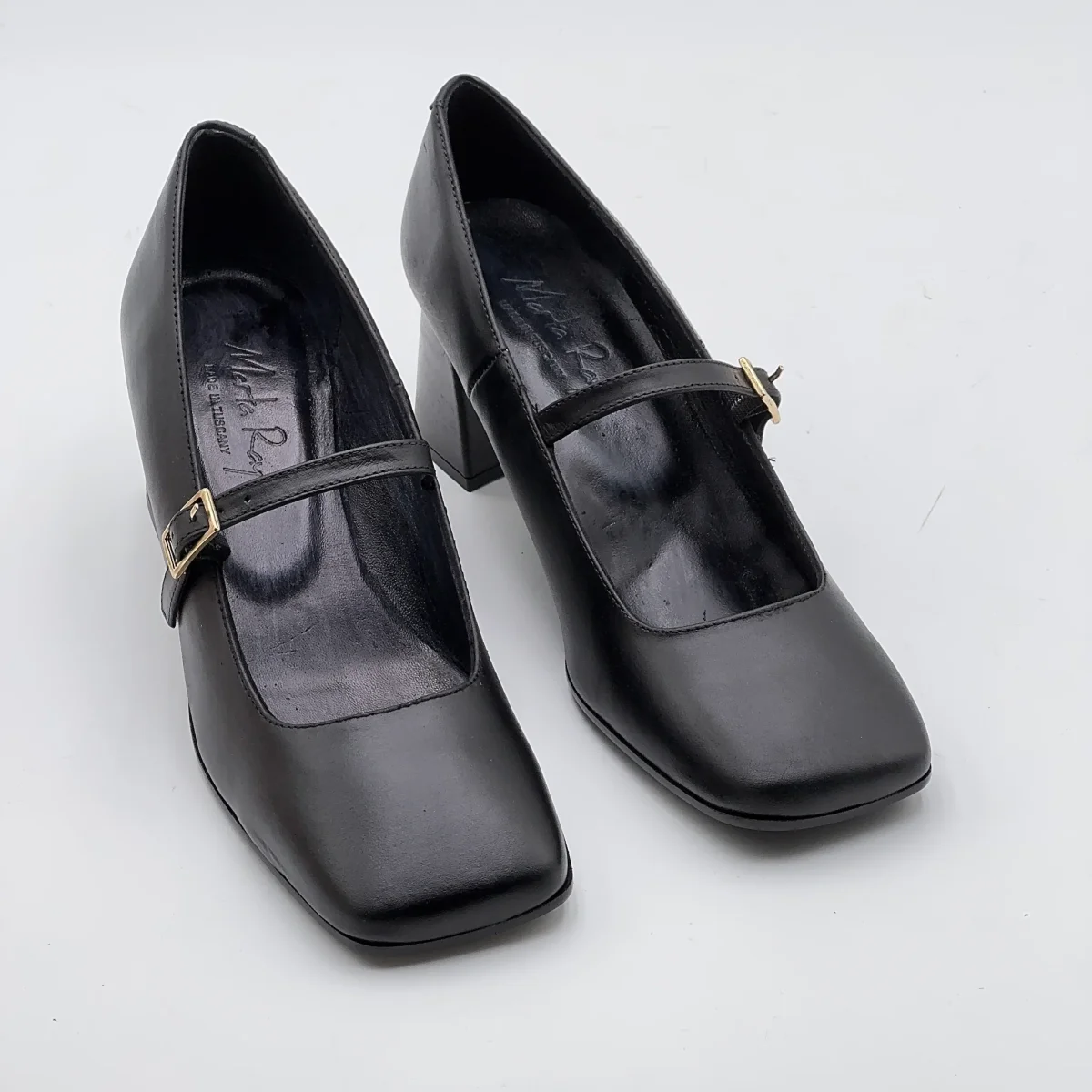 Una Mary Jane artigianale, con tacco e punta squadrata, dallo stile raffinato e senza tempo, realizzata in pelle morbida effetto invecchiato nero, si distingue per il suo carattere naturale e autentico, capace di valorizzare qualsiasi look con discreta eleganza.