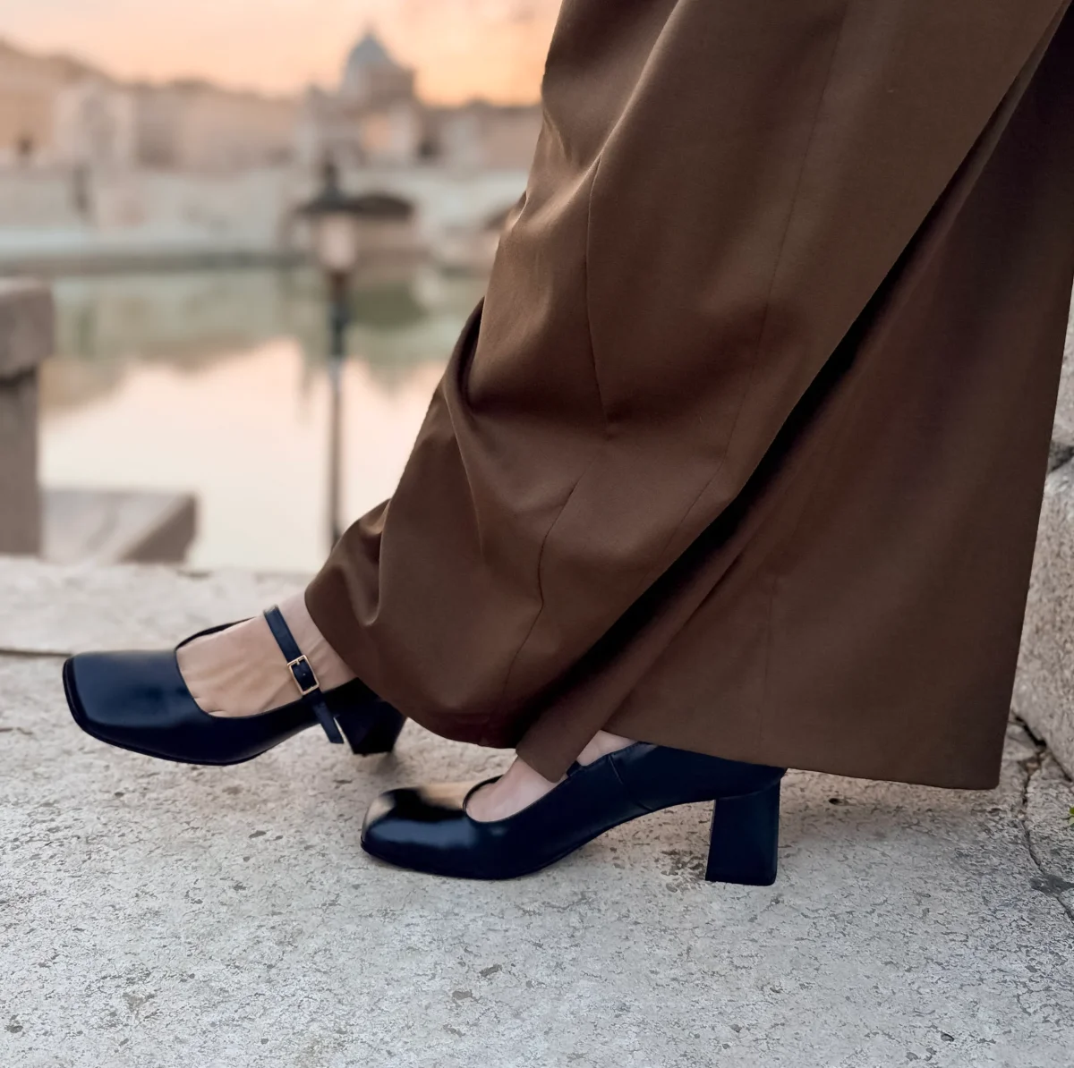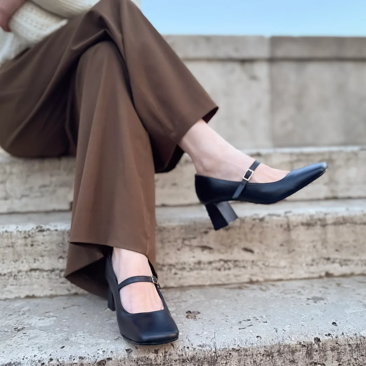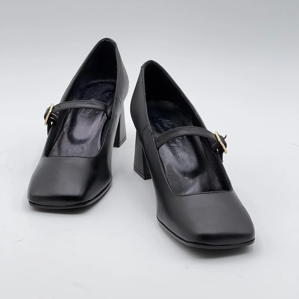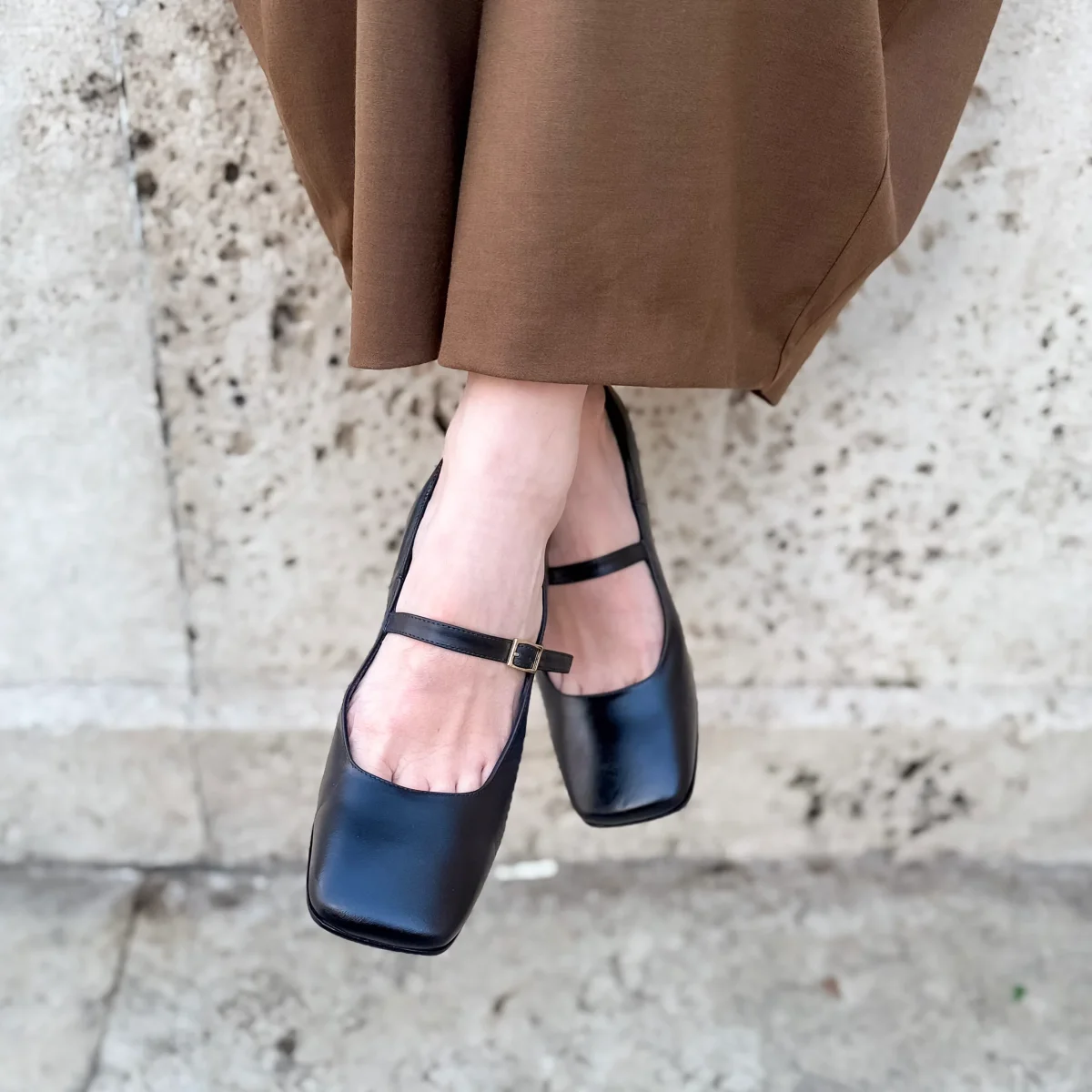 Una Mary Jane artigianale, con tacco e punta squadrata, dallo stile raffinato e senza tempo, realizzata in pelle morbida effetto invecchiato nero, si distingue per il suo carattere naturale e autentico, capace di valorizzare qualsiasi look con discreta eleganza.