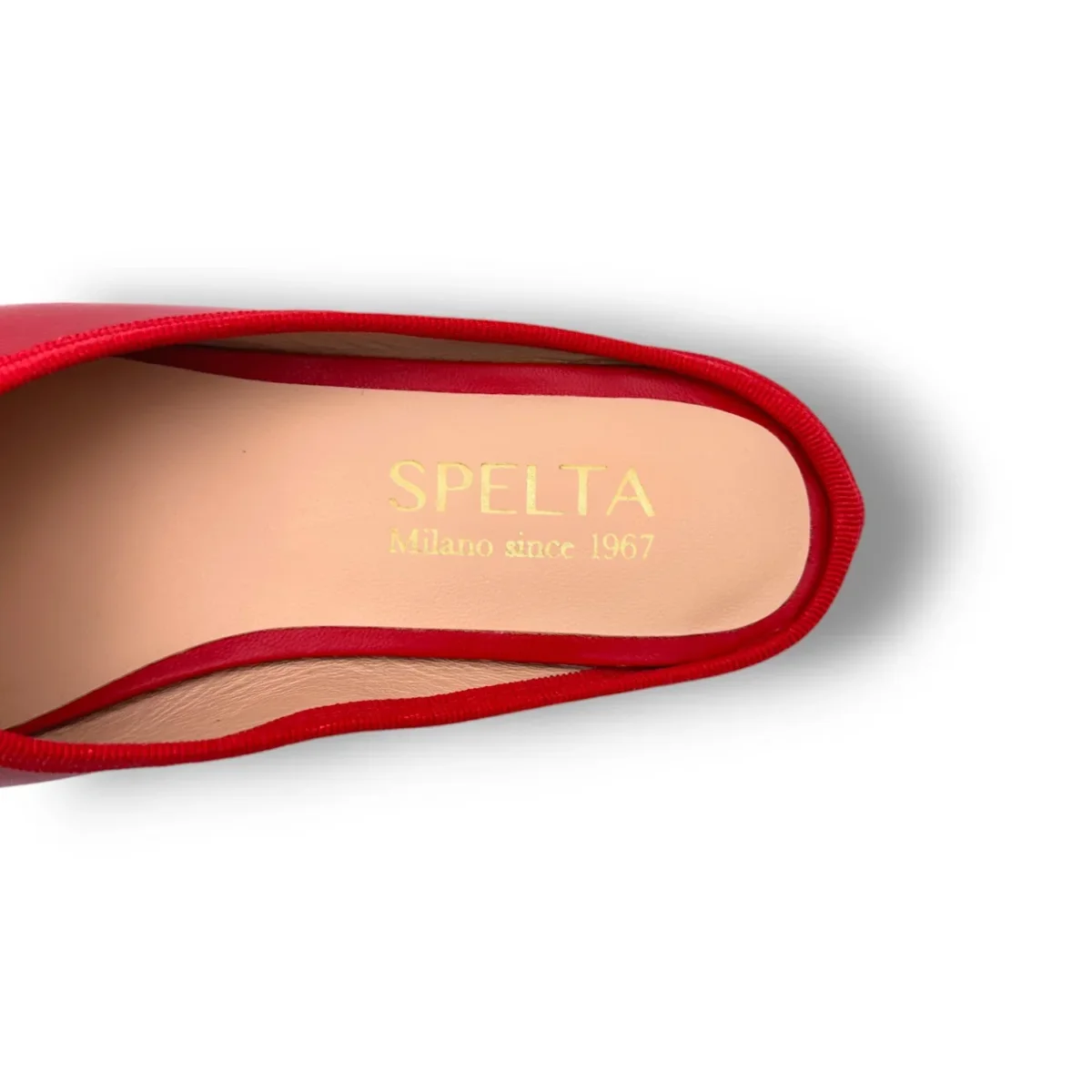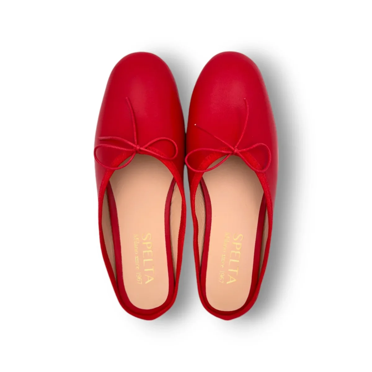 La ballerina accollata Spelta si rinnova nella variante aperta dietro, ispirata al classico modello Mule. Olga Mule presenta una punta arrotondata, tacco da 5 mm in autentico cuoio italiano, con suola e interno in pelle rosè e bordo in vera pelle italiana. Il bordo in gros grain protegge il cordino colorato in nuance, utilizzabile per ottimizzare la calzata della ballerina su qualsiasi piede.