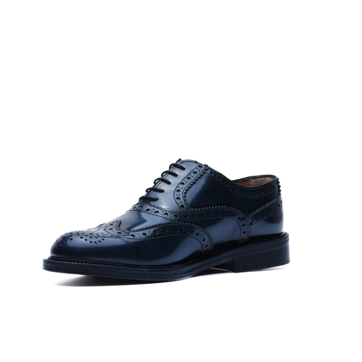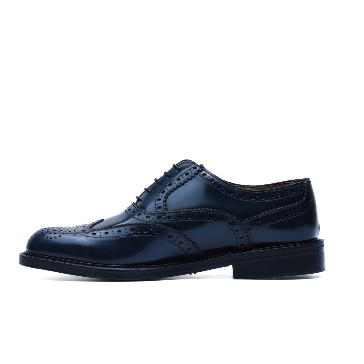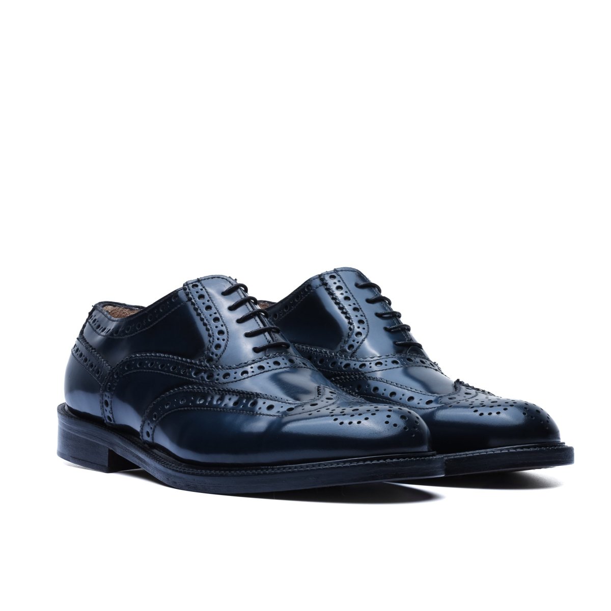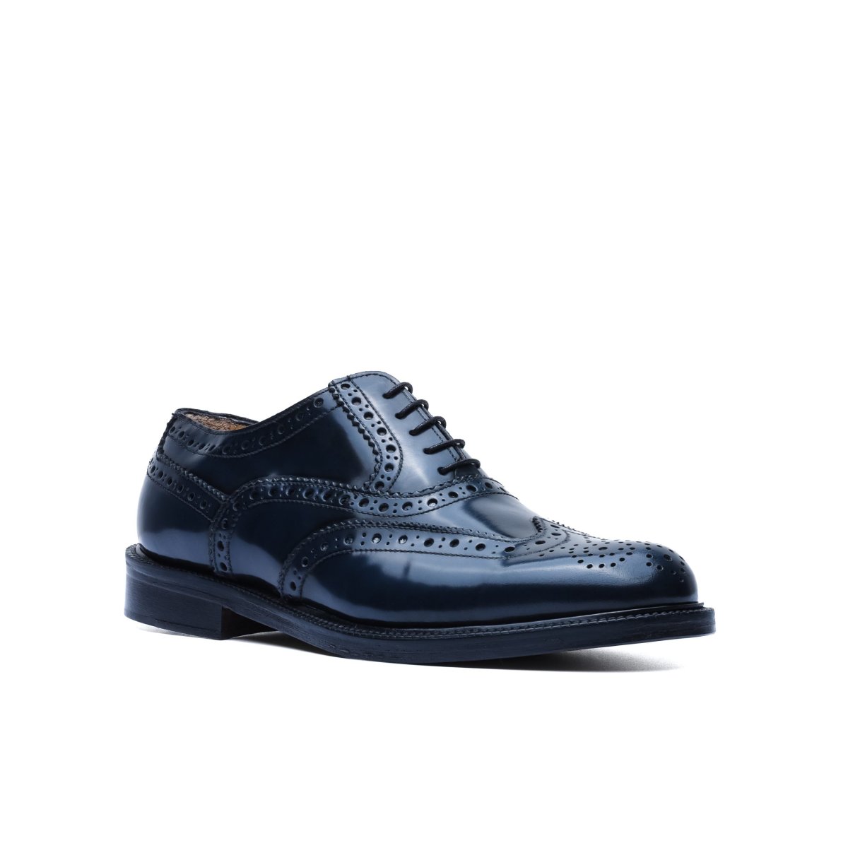 Realizzata in pelle di vitello tinta a mano nel colore blu. La tomaia è resa particolare dalla lavorazione full-brogue, sulla punta presenta la foratura all’inglese sulla coda di rondine e interno rivestito in pelle.