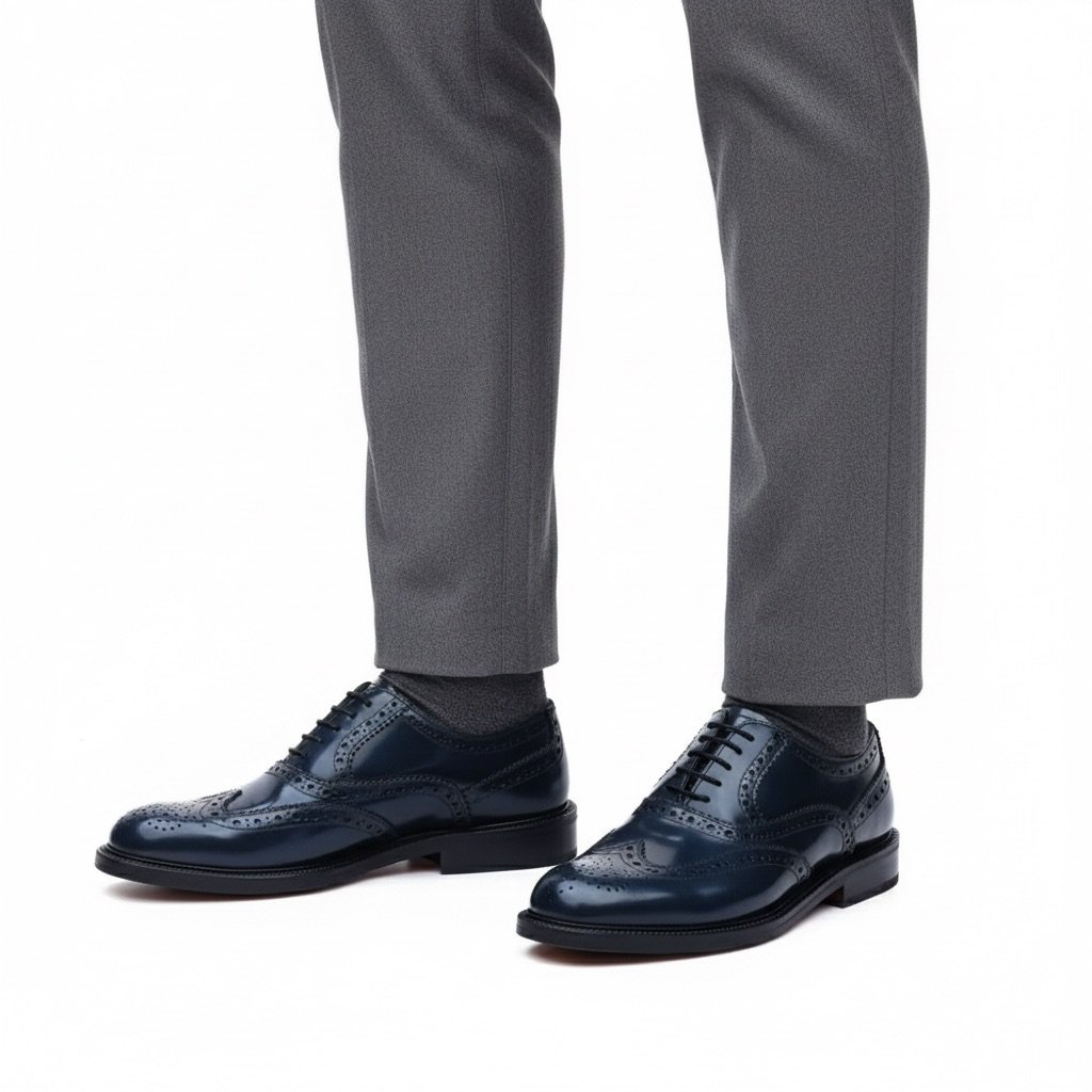 Calzatura artigianale made in Italy modello Oxford stringata, conosciuta anche come “Francesina”. Realizzata in pelle di vitello tinta a mano nel colore blu. La tomaia è resa particolare dalla lavorazione full-brogue, sulla punta presenta la foratura all’inglese sulla coda di rondine e interno rivestito in pelle. La finitura “a specchio” della pelle che rende questa scarpa unica è ottenuta con un lungo processo di spazzolatura effettuato da artigiani esperti. Interno foderato in pelle nel colore beige con logo stampato nel colore oro. Suola in cuoio con lavorazione blake, tinta a mano nel colore beige e logo corsivo inciso. Adatta per…