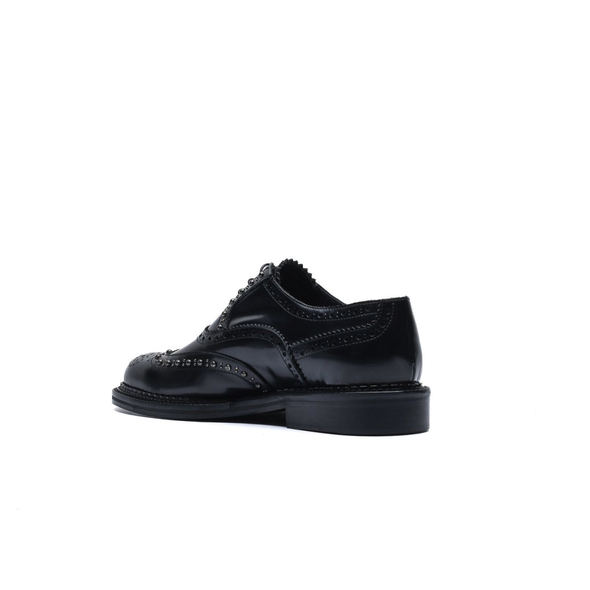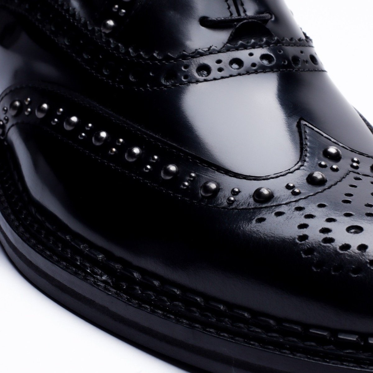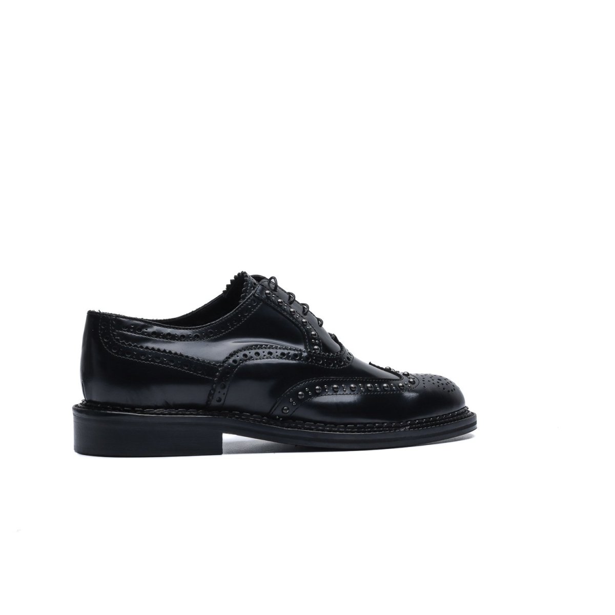 La tomaia è resa particolare dalla lavorazione full-brogue con applicazione di borchie lungo tutta la foratura della coda di rondine e dell’allacciatura.