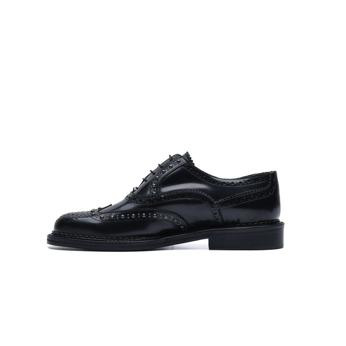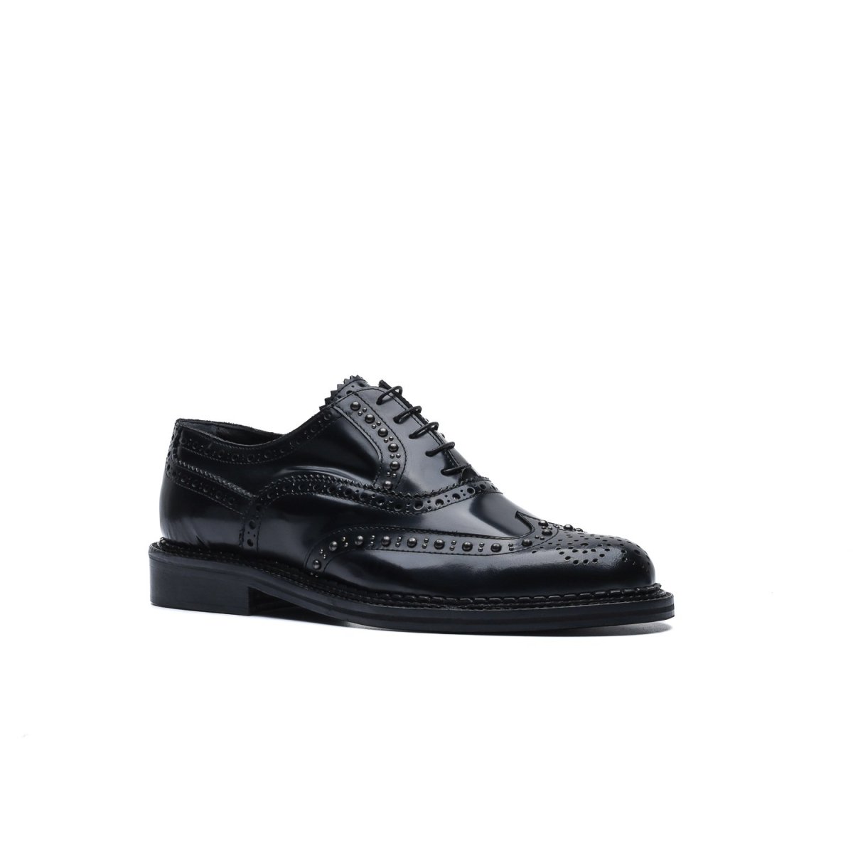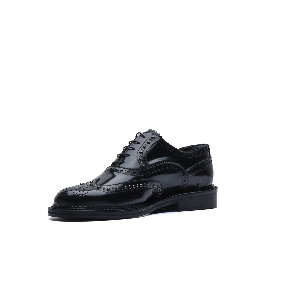 La tomaia è resa particolare dalla lavorazione full-brogue con applicazione di borchie lungo tutta la foratura della coda di rondine e dell’allacciatura.