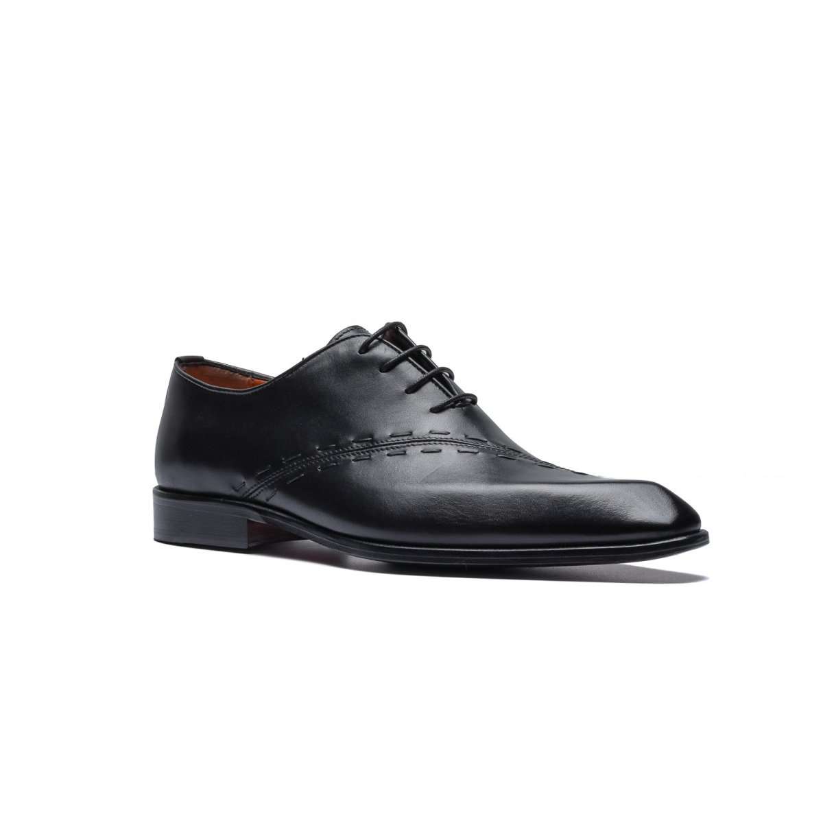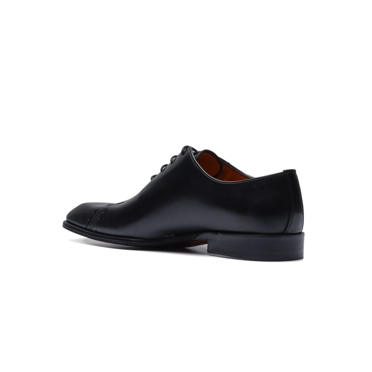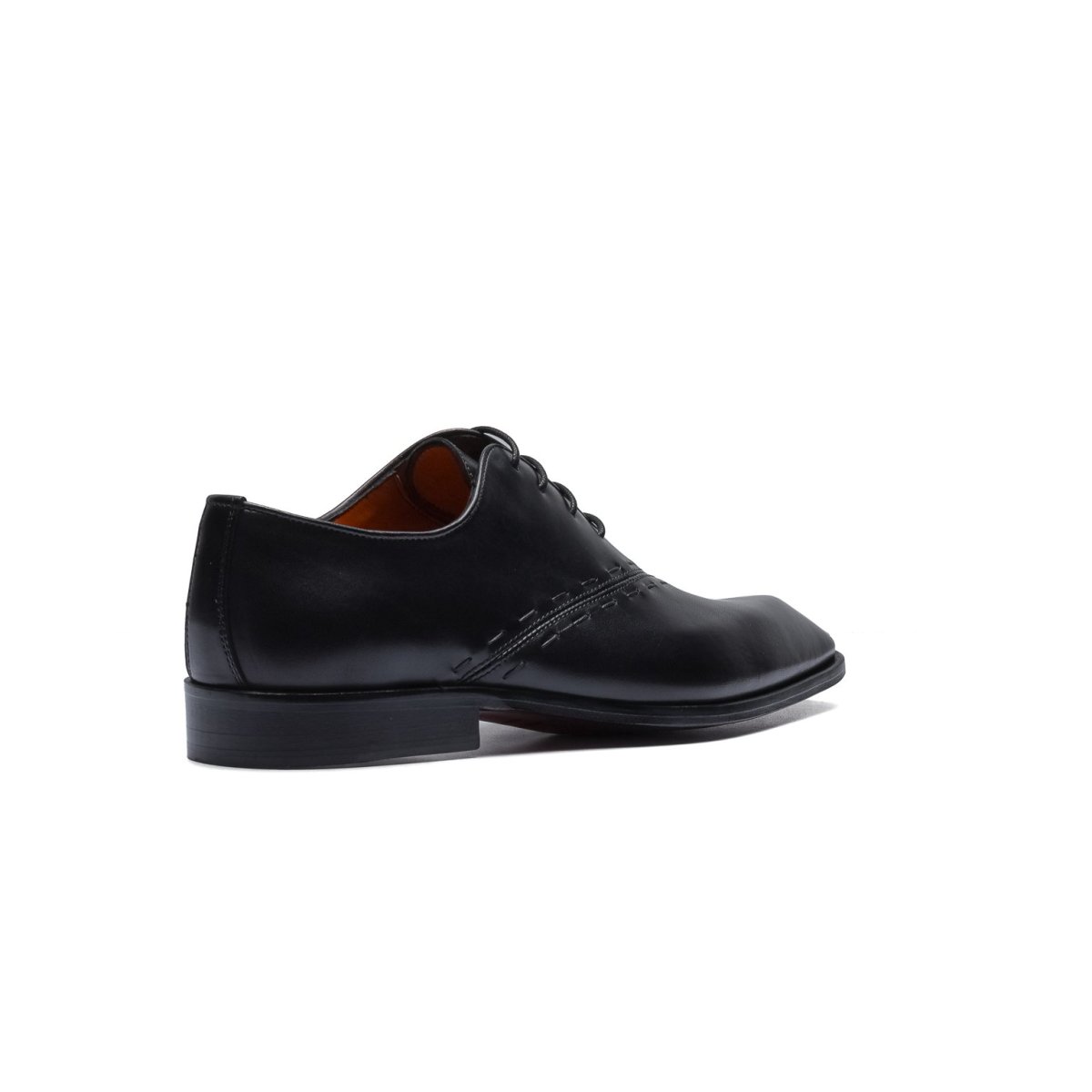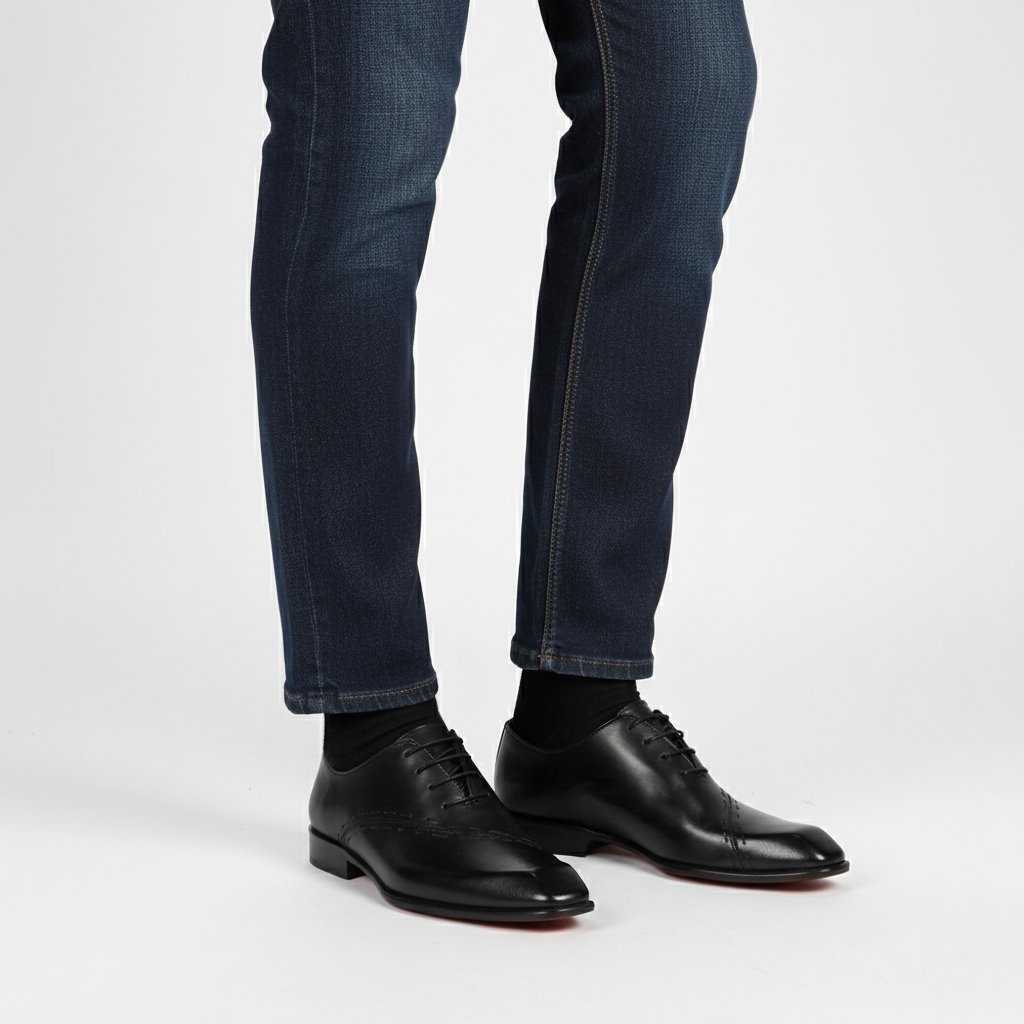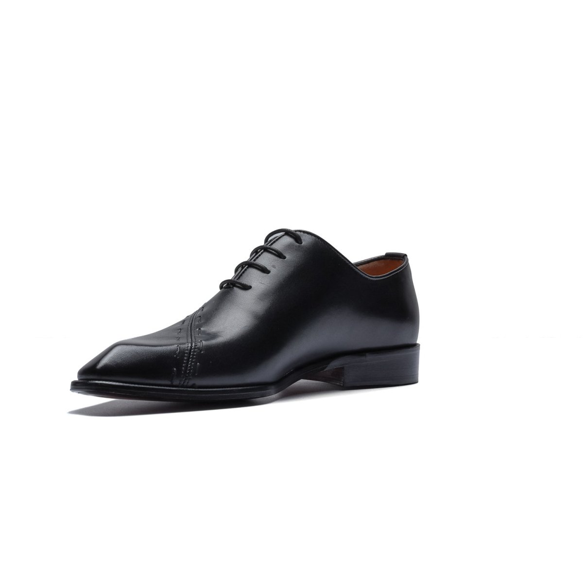 Calzature stringate artigianali Made in Italy modello Oxford o anche denominate “Francesine”. Realizzata in pelle di vitello tinta a mano nel colore nero. Resa unica dall’unione di due pezzi di pelle tramite una cucitura trasversale che ne attraversa la tomaia. Interno foderato in pelle beige con logo stampato nel colore oro. Suola in cuoio con lavorazione a increna, tinta a mano nel colore blood orange con sfumature nere e logo corsivo inciso. Calzatura ideale per outfit formali visti i particolari dettagli che rendono questa scarpa elegantissima e mai scontata. Questa calzatura realizzata a mano unisce storia, eleganza, comfort e robustezza…
