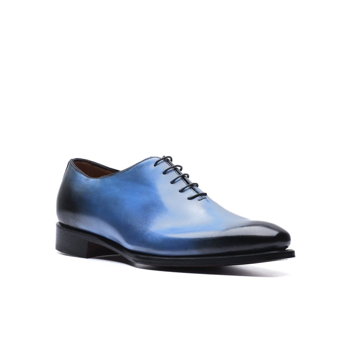 Realizzata in pelle di vitello tinta a mano con base di colore blu e sfumature nere su punta e tallone.
