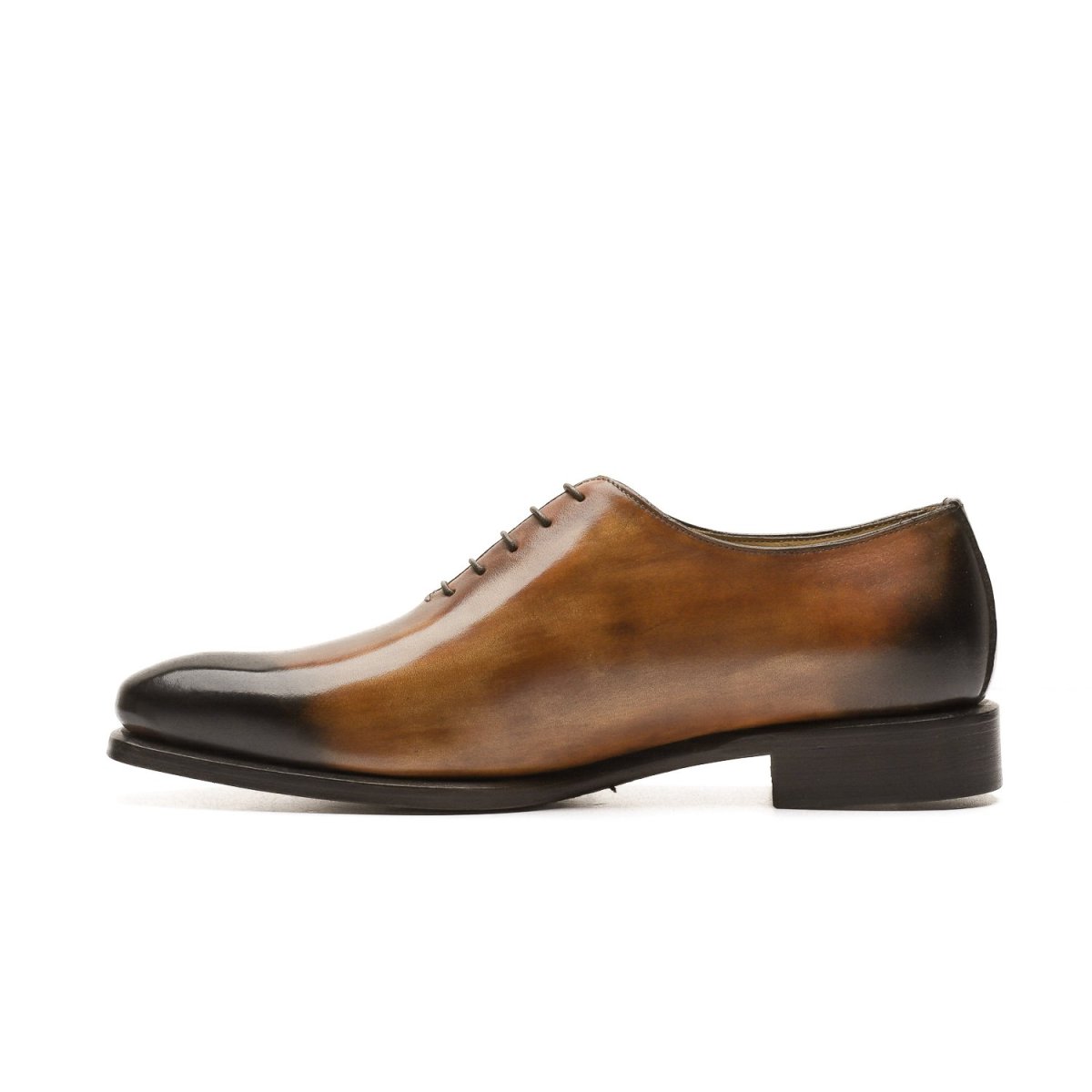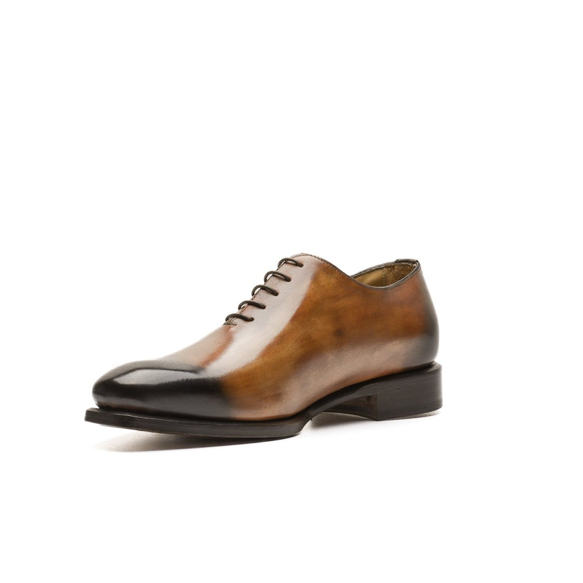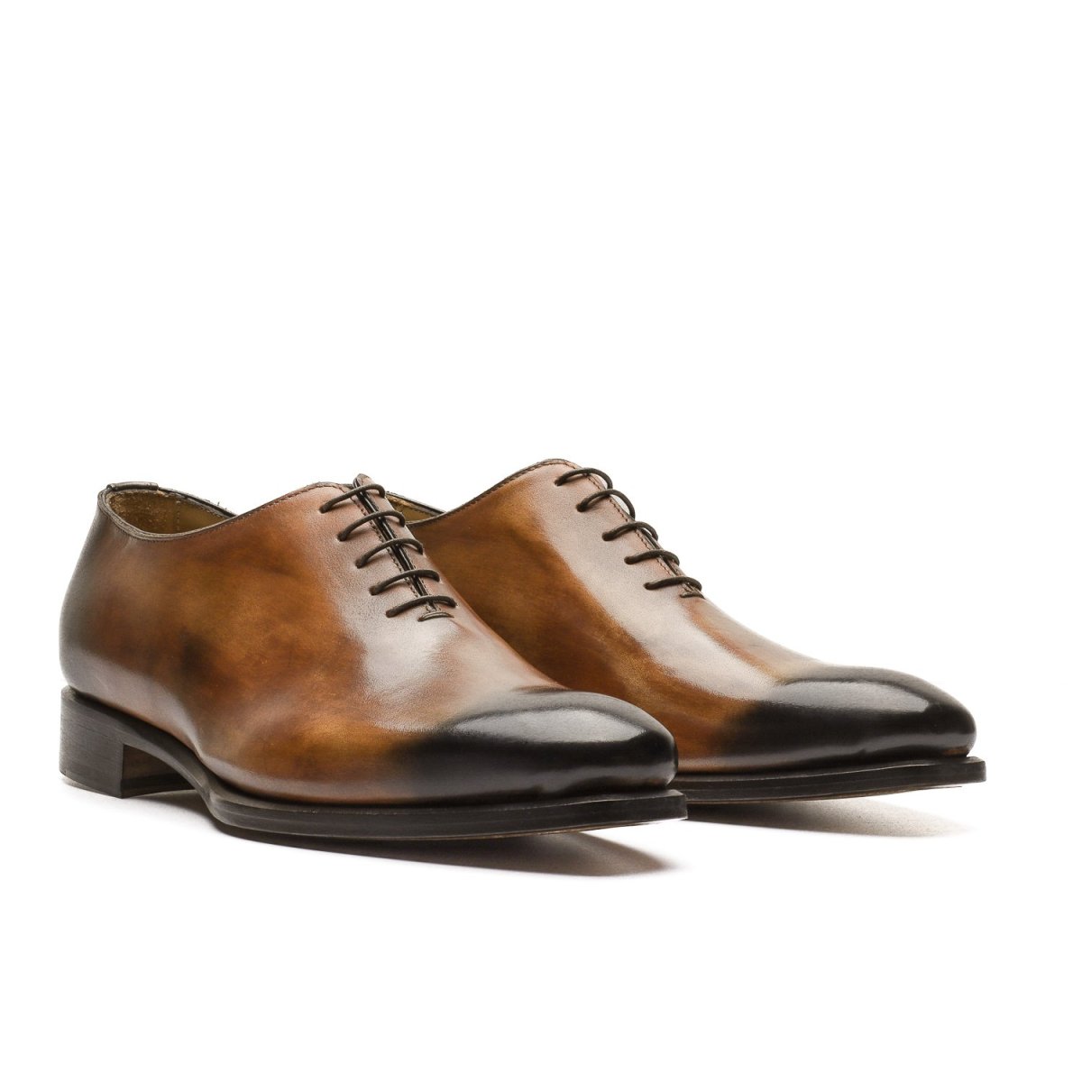 Calzature stringate artigianali Made in Italy modello Oxford o anche denominate “Francesine”. Realizzata in pelle di vitello tinta a mano con base di colore brandy e sfumature nere su punta e tallone. Interno foderato in cuoio con logo stampato nel colore oro. Suola in cuoio con lavorazione a increna, tinta a mano nel colore cuoio con sfumature nere e logo corsivo inciso. Ideale per creare contrasti eleganti e d’effetto sia con un abito scuro in un outfit da serata sia per un look da rockstar con dei jeans grigi oppure neri. Questa calzatura realizzata a mano unisce storia, eleganza, comfort…