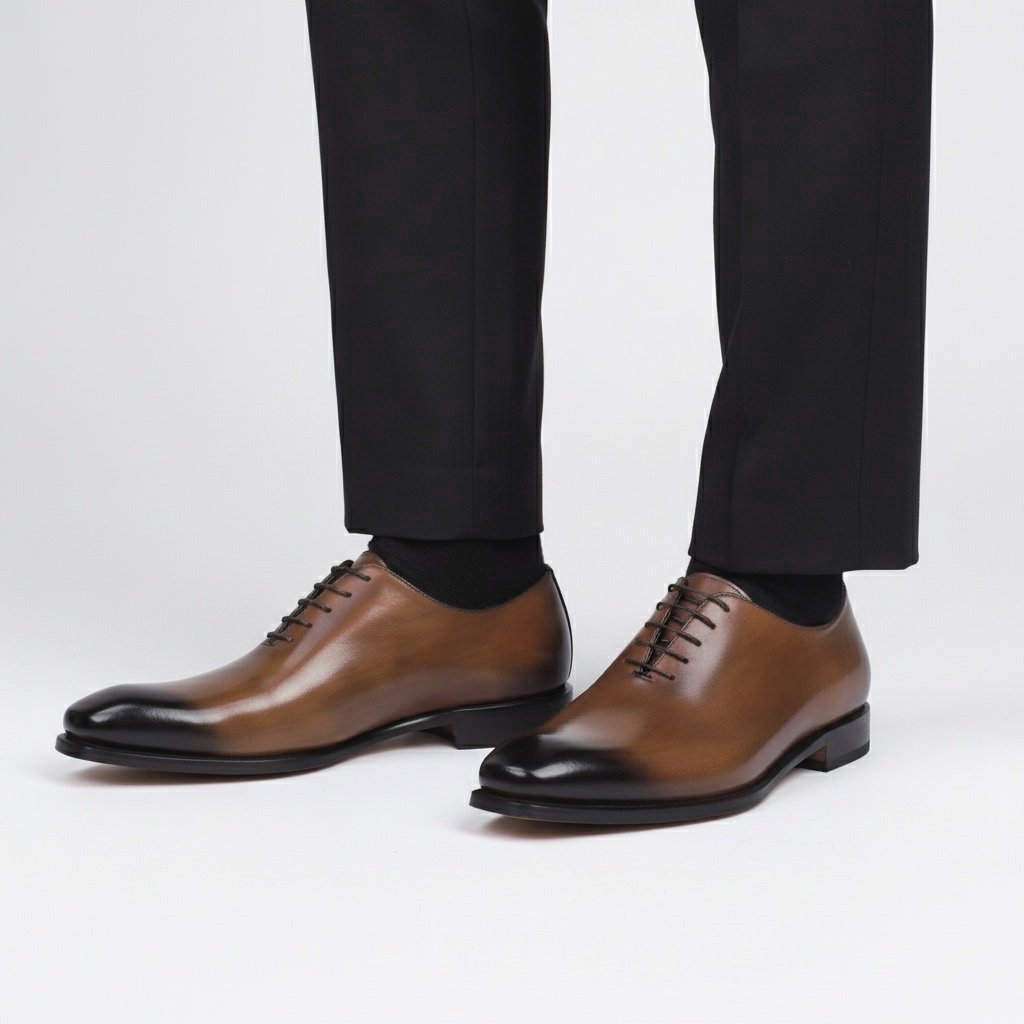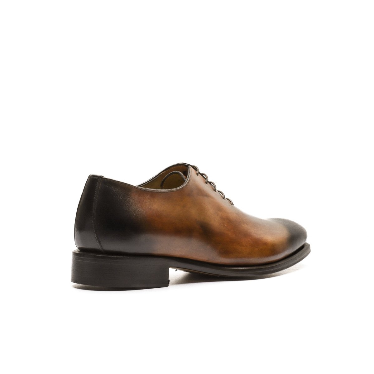 Calzature stringate artigianali Made in Italy modello Oxford o anche denominate “Francesine”. Realizzata in pelle di vitello tinta a mano con base di colore brandy e sfumature nere su punta e tallone. Interno foderato in cuoio con logo stampato nel colore oro. Suola in cuoio con lavorazione a increna, tinta a mano nel colore cuoio con sfumature nere e logo corsivo inciso. Ideale per creare contrasti eleganti e d’effetto sia con un abito scuro in un outfit da serata sia per un look da rockstar con dei jeans grigi oppure neri. Questa calzatura realizzata a mano unisce storia, eleganza, comfort e robustezza tipici dei prodotti Made in Italy con lo stile unico di Andrea Nobile.