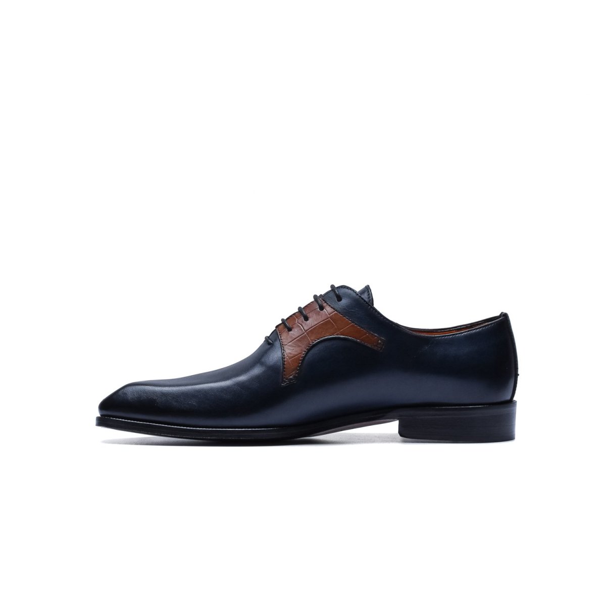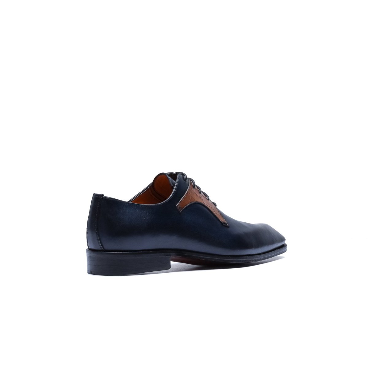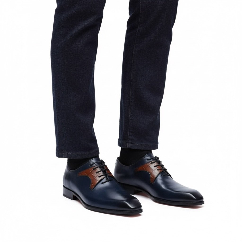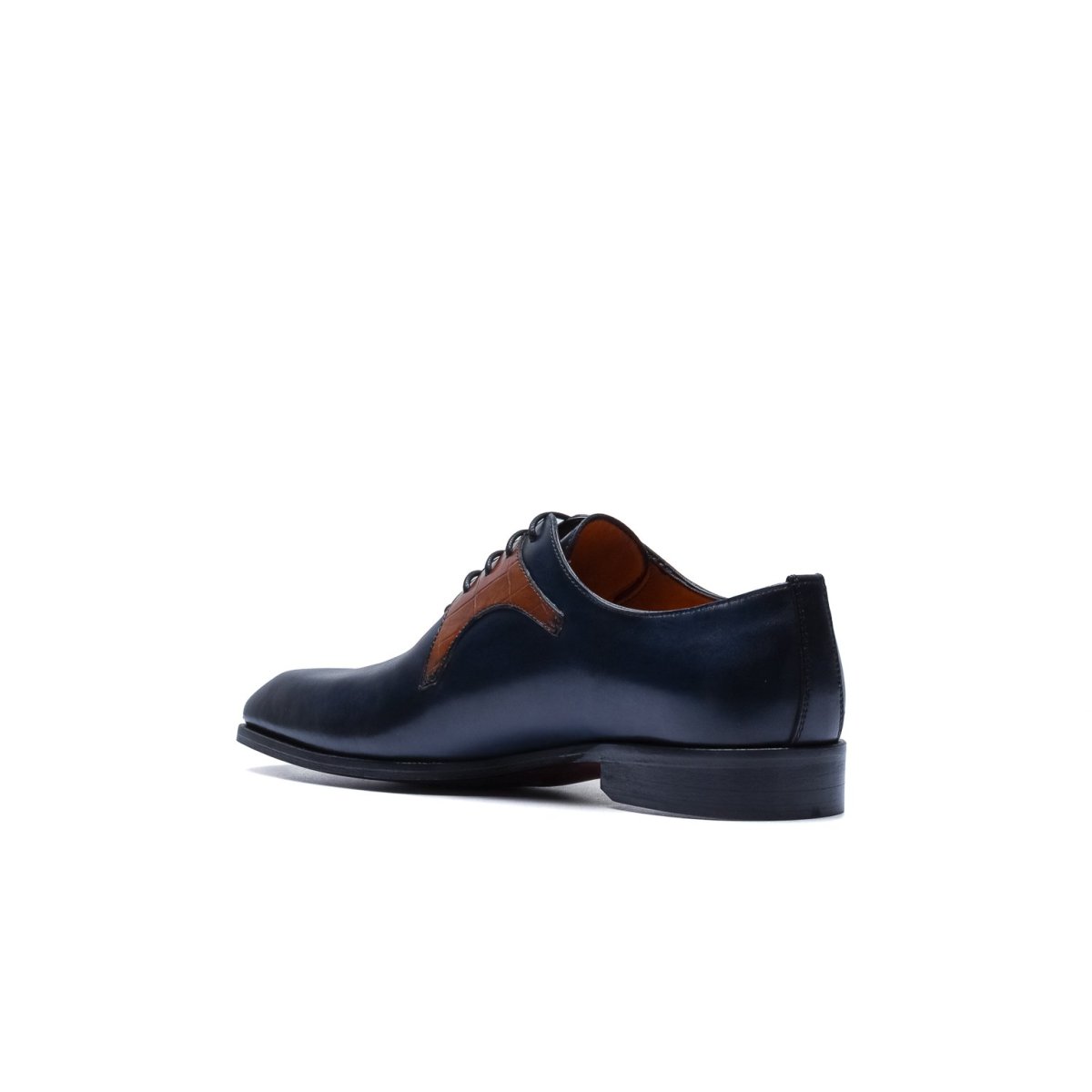 Calzature stringate artigianali Made in Italy modello Oxford o anche denominate “Francesine”. Realizzata in pelle di vitello tinta a mano con base di colore blu. Decorata con mascherina stampa coccodrillo color cuoio. Interno foderato in pelle beige con logo stampato nel colore oro. Suola in cuoio con lavorazione a increna, tinta a mano nel colore blood orange con sfumature nere e logo corsivo inciso. Calzatura ideale per outfit formali visti i particolari micro dettagli che rendono questa scarpa elegantissima e mai scontata. Questa calzatura realizzata a mano unisce storia, eleganza, comfort e robustezza tipici dei prodotti Made in Italy con…