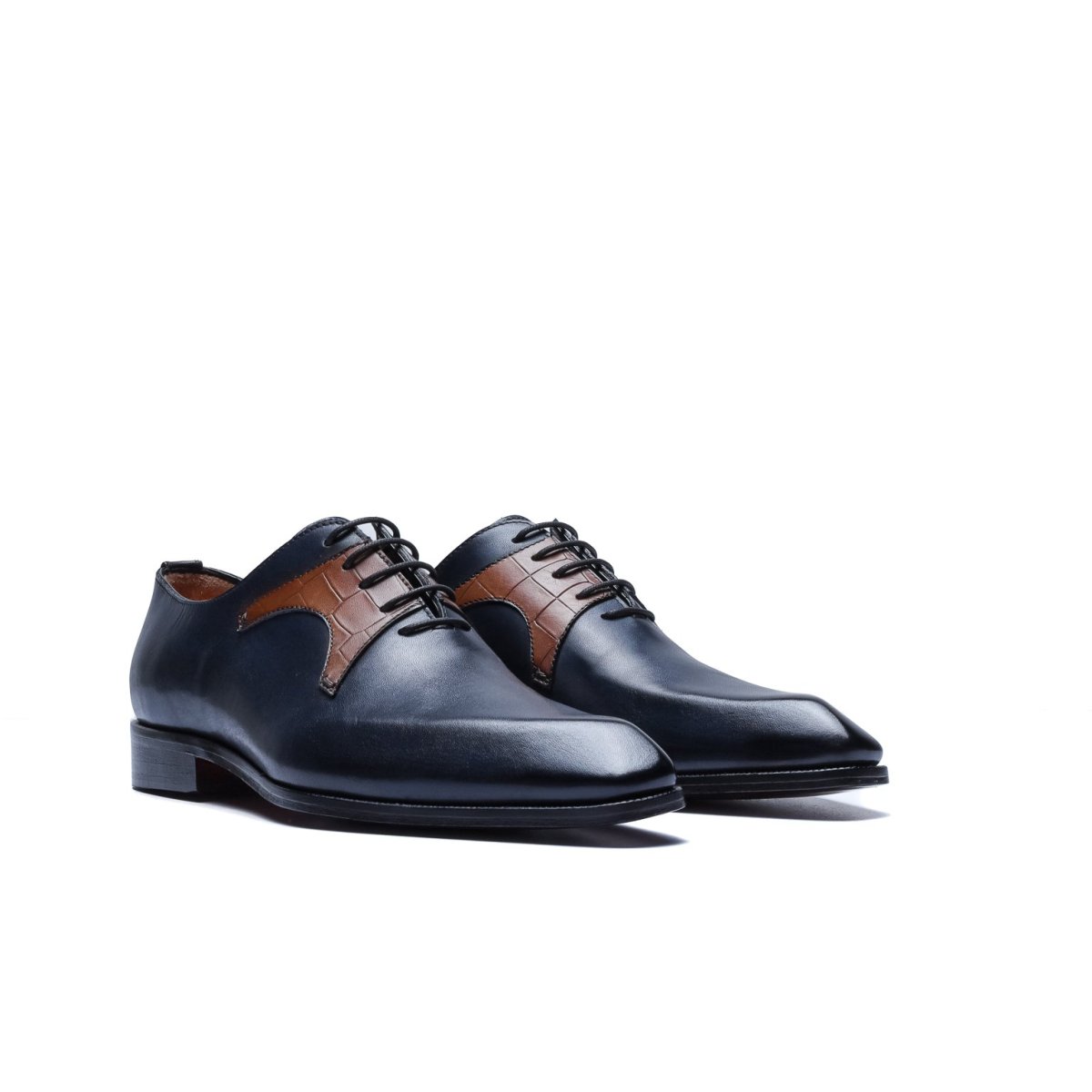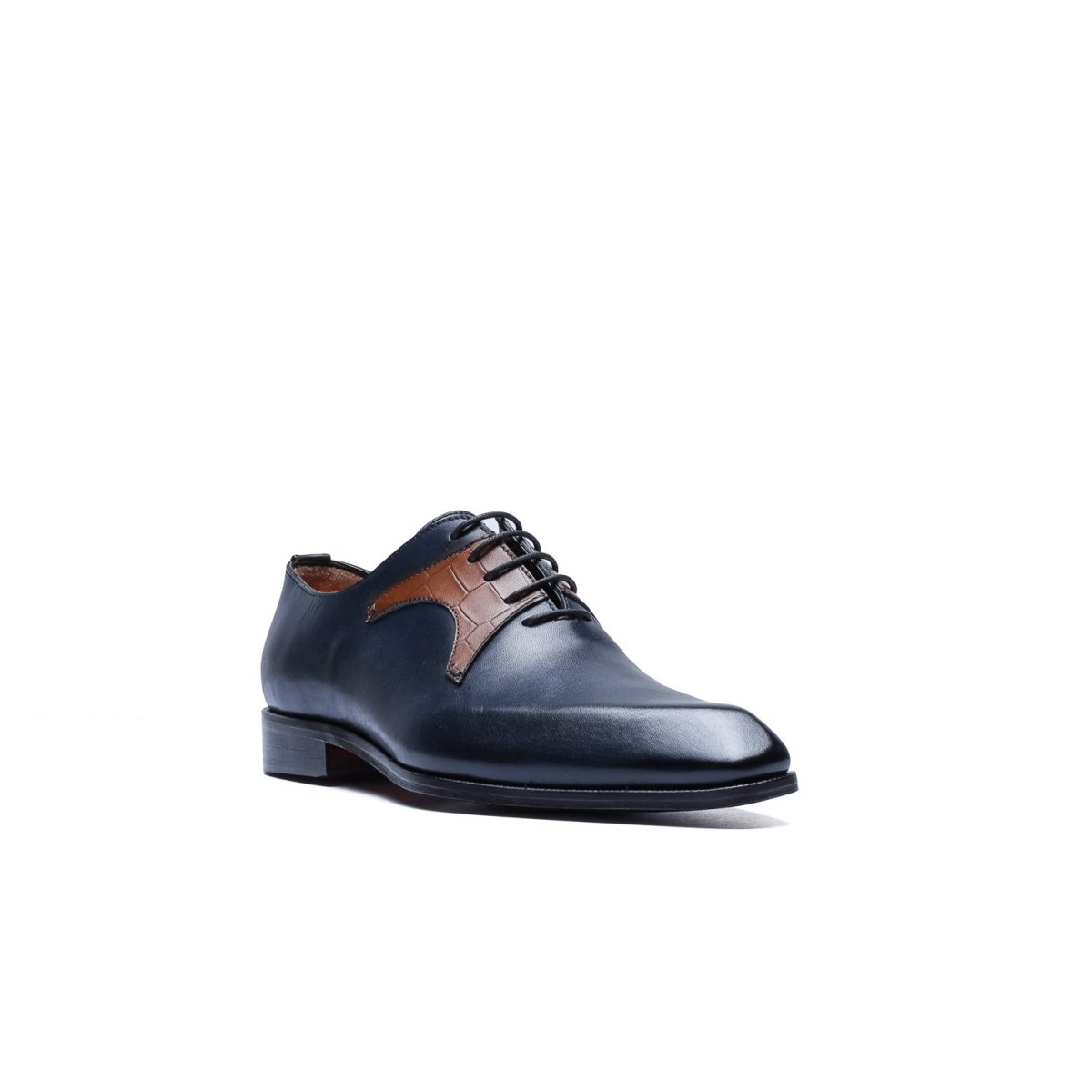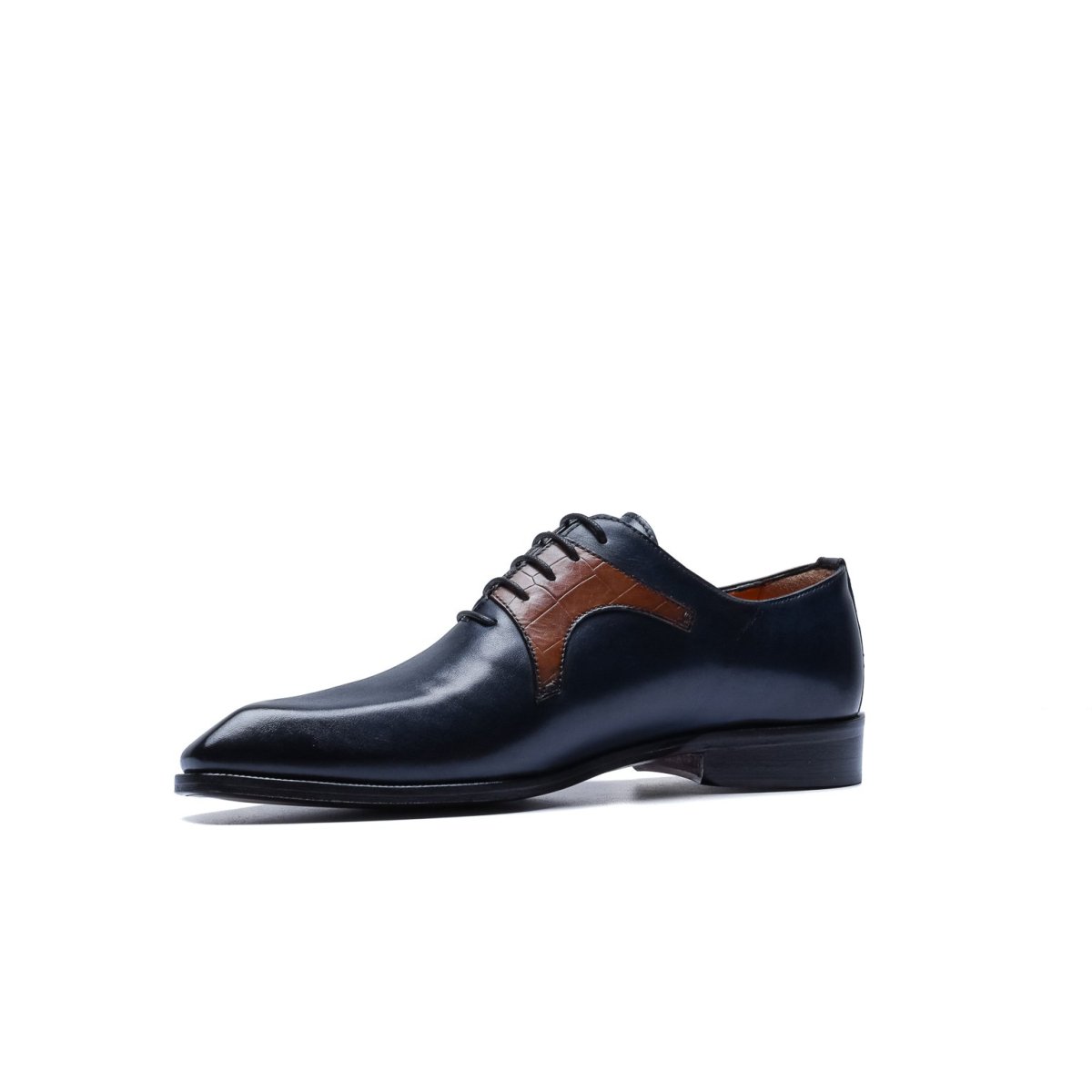 Calzature stringate artigianali Made in Italy modello Oxford o anche denominate “Francesine”. Realizzata in pelle di vitello tinta a mano con base di colore blu. Decorata con mascherina stampa coccodrillo color cuoio. Interno foderato in pelle beige con logo stampato nel colore oro. Suola in cuoio con lavorazione a increna, tinta a mano nel colore blood orange con sfumature nere e logo corsivo inciso. Calzatura ideale per outfit formali visti i particolari micro dettagli che rendono questa scarpa elegantissima e mai scontata. Questa calzatura realizzata a mano unisce storia, eleganza, comfort e robustezza tipici dei prodotti Made in Italy con…
