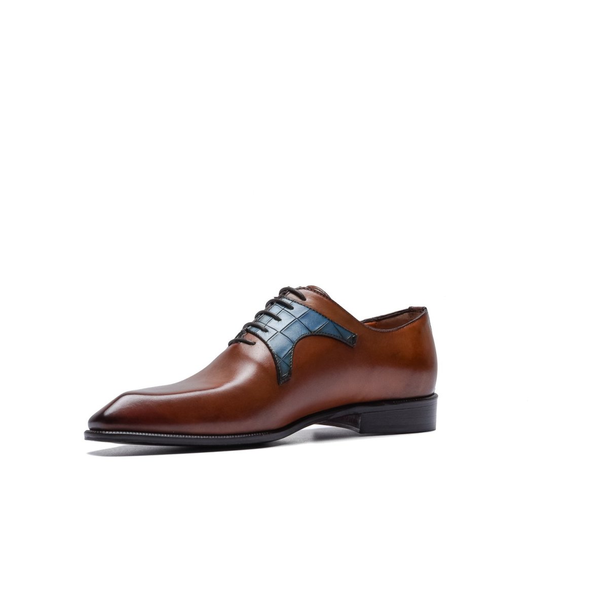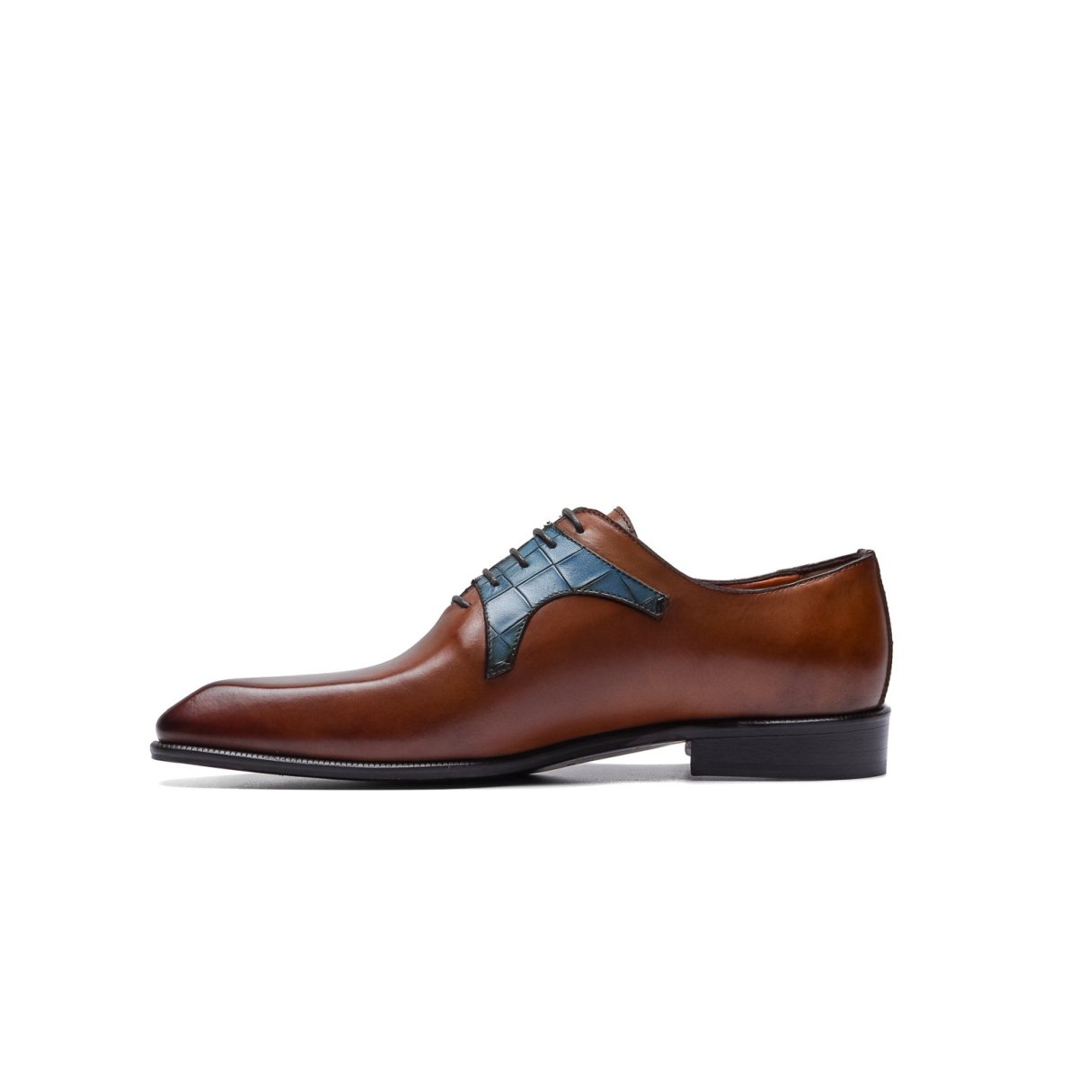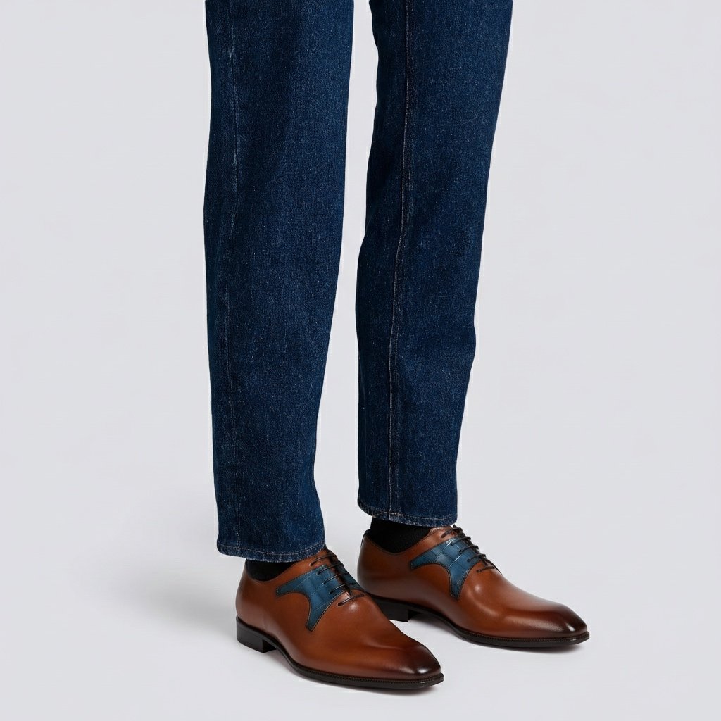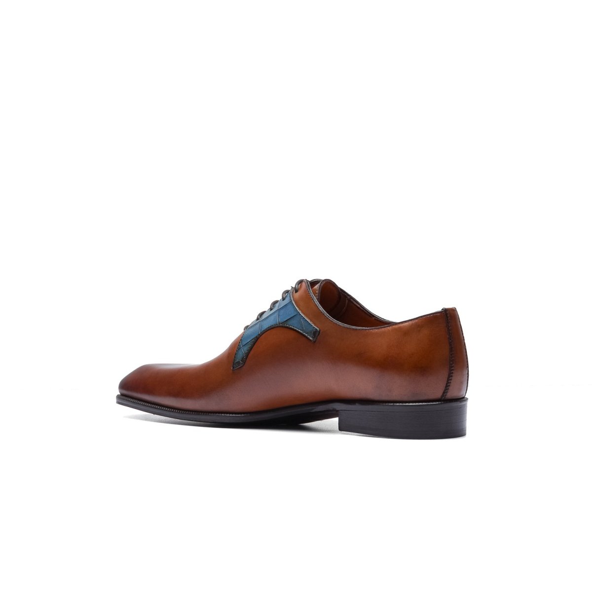 Calzature stringate artigianali Made in Italy modello Oxford o anche denominate “Francesine”. Realizzata in pelle di vitello tinta a mano con base di colore cuoio. Decorata con mascherina stampa coccodrillo color blue jeans. Interno foderato in pelle beige con logo stampato nel colore oro. Suola in cuoio con lavorazione a increna, tinta a mano nel colore blood orange con sfumature nere e logo corsivo inciso. Calzatura ideale per outfit formali visti i particolari micro dettagli che rendono questa scarpa elegantissima e mai scontata. Questa calzatura realizzata a mano unisce storia, eleganza, comfort e robustezza tipici dei prodotti Made in Italy…