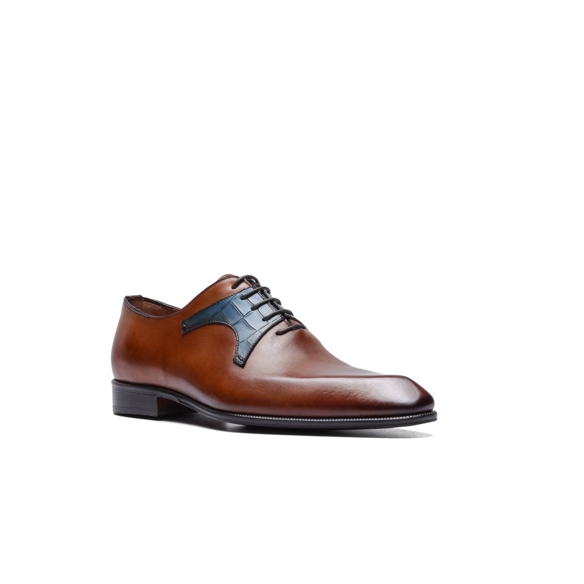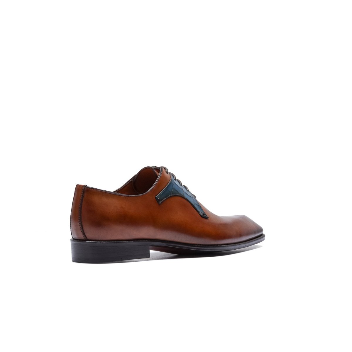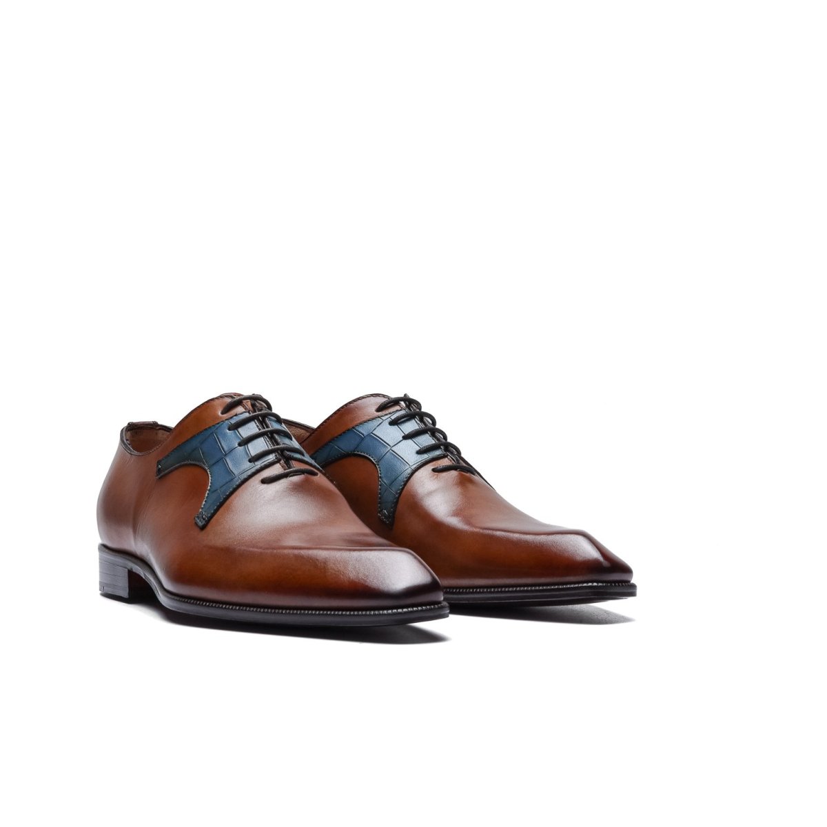 Calzature stringate artigianali Made in Italy modello Oxford o anche denominate “Francesine”. Realizzata in pelle di vitello tinta a mano con base di colore cuoio. Decorata con mascherina stampa coccodrillo color blue jeans. Interno foderato in pelle beige con logo stampato nel colore oro. Suola in cuoio con lavorazione a increna, tinta a mano nel colore blood orange con sfumature nere e logo corsivo inciso. Calzatura ideale per outfit formali visti i particolari micro dettagli che rendono questa scarpa elegantissima e mai scontata. Questa calzatura realizzata a mano unisce storia, eleganza, comfort e robustezza tipici dei prodotti Made in Italy…