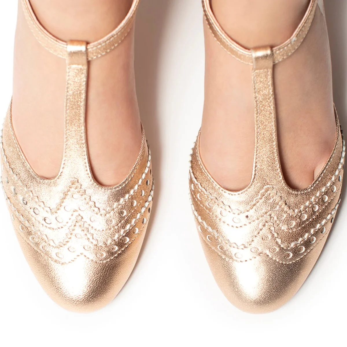 Scarpa in pelle a punta tonda con T-strap e cinturino raccordato e regolabile alla caviglia.