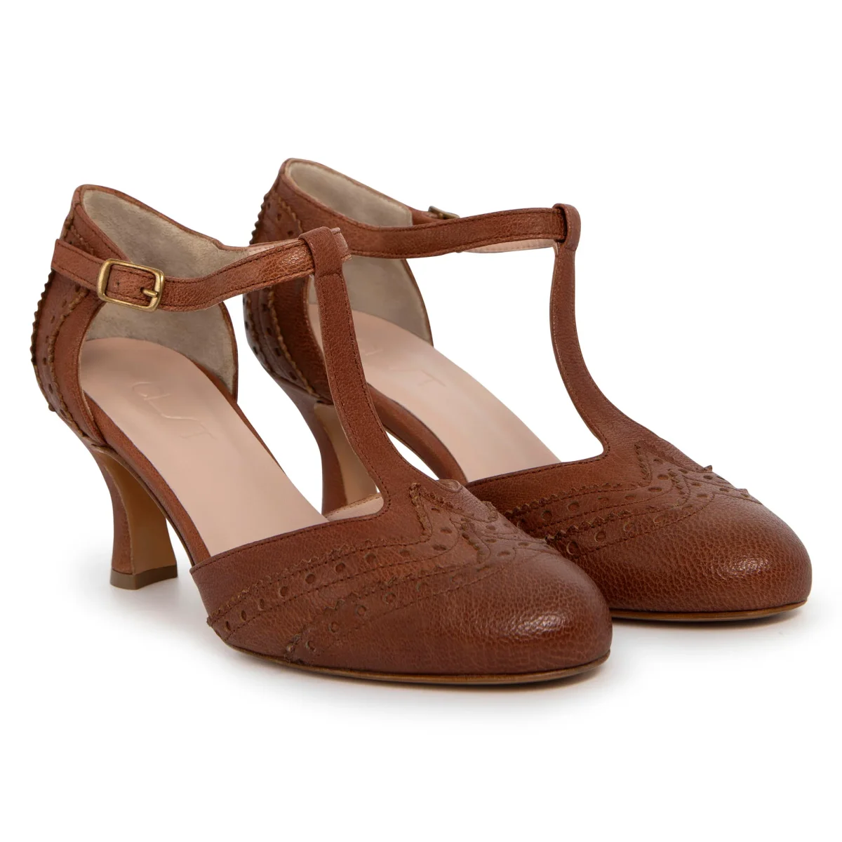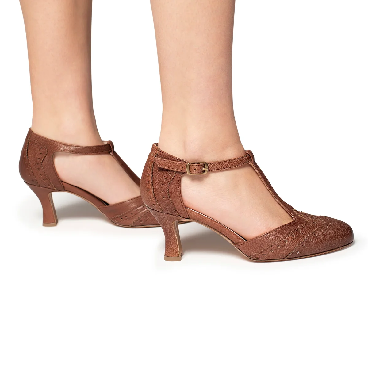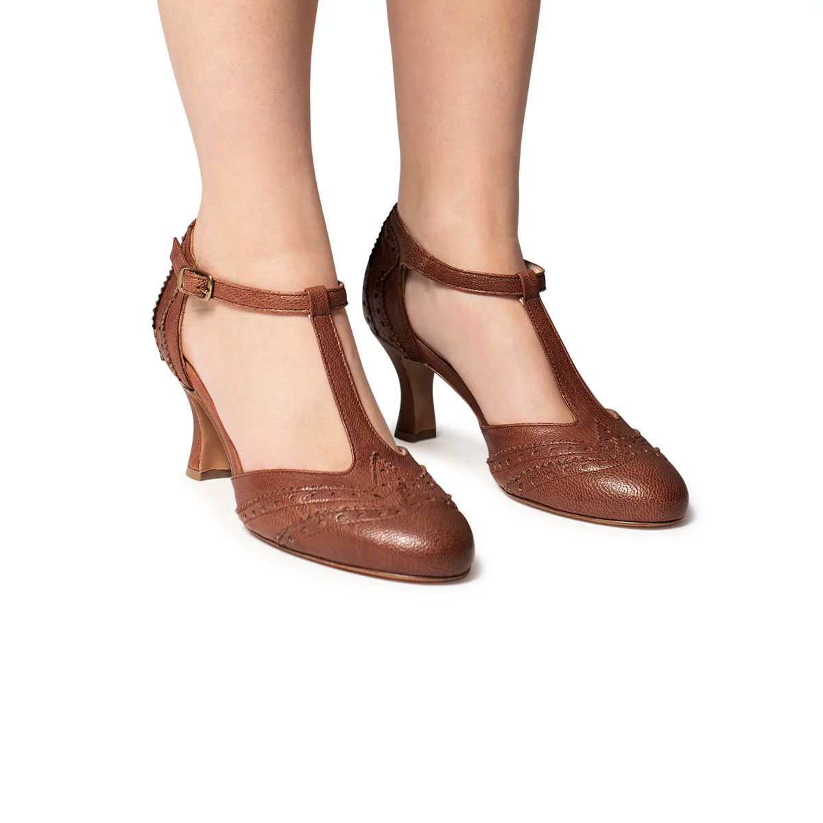Scarpa in pelle a punta tonda con T-strap e cinturino raccordato e regolabile alla caviglia. Sottopiede in pelle, suolo in cuoio e tacco rivestito di 7cm