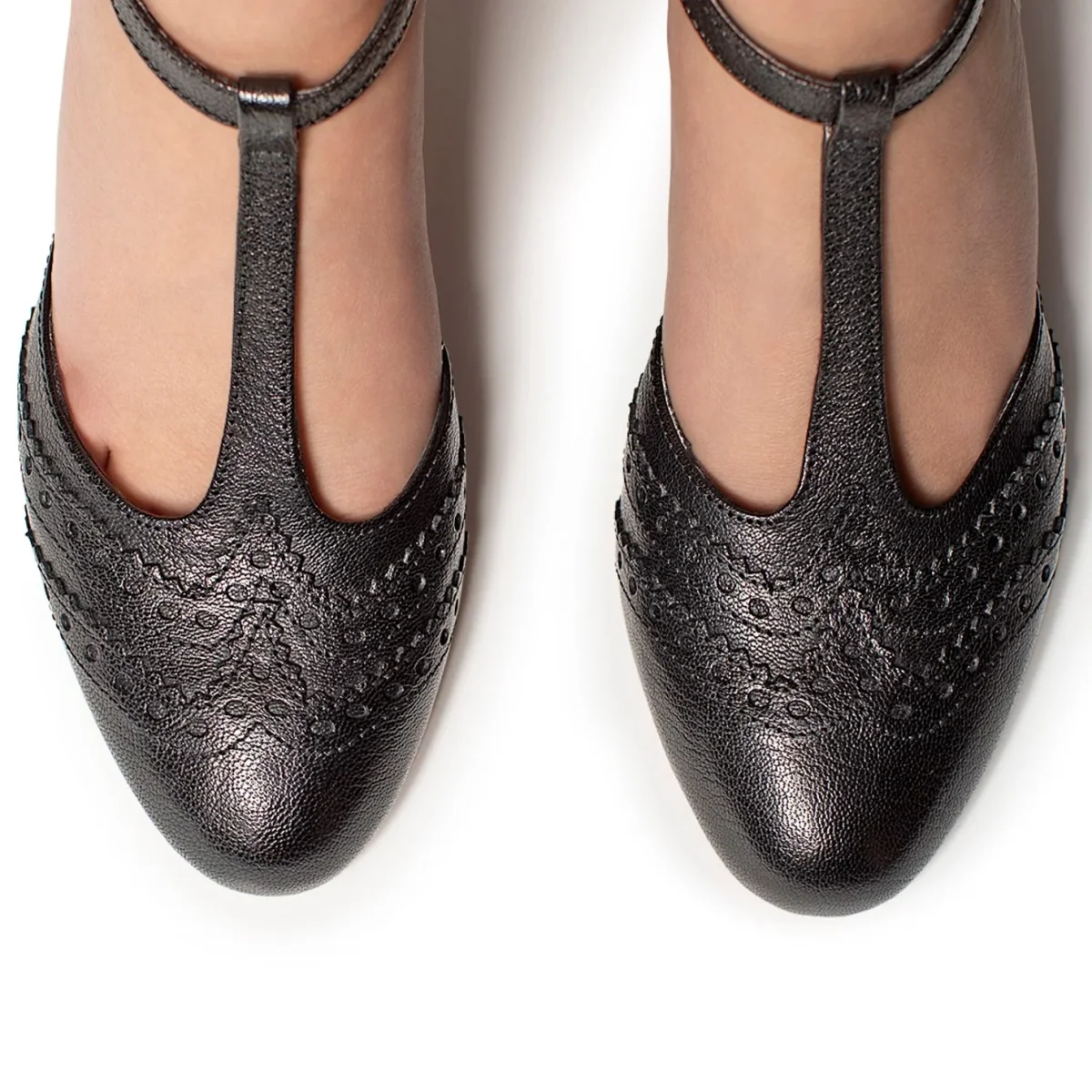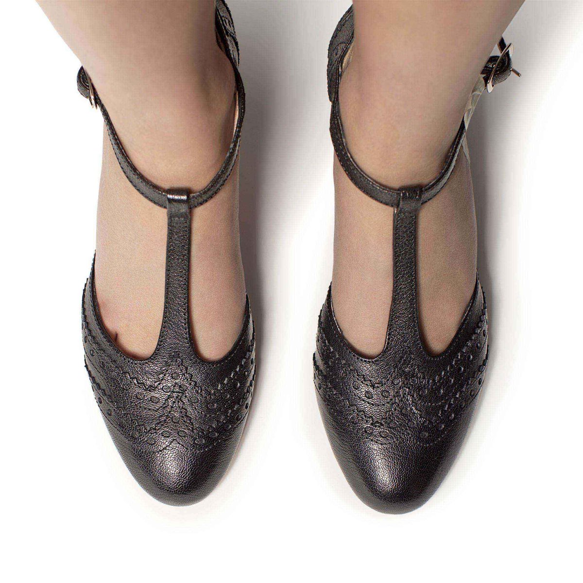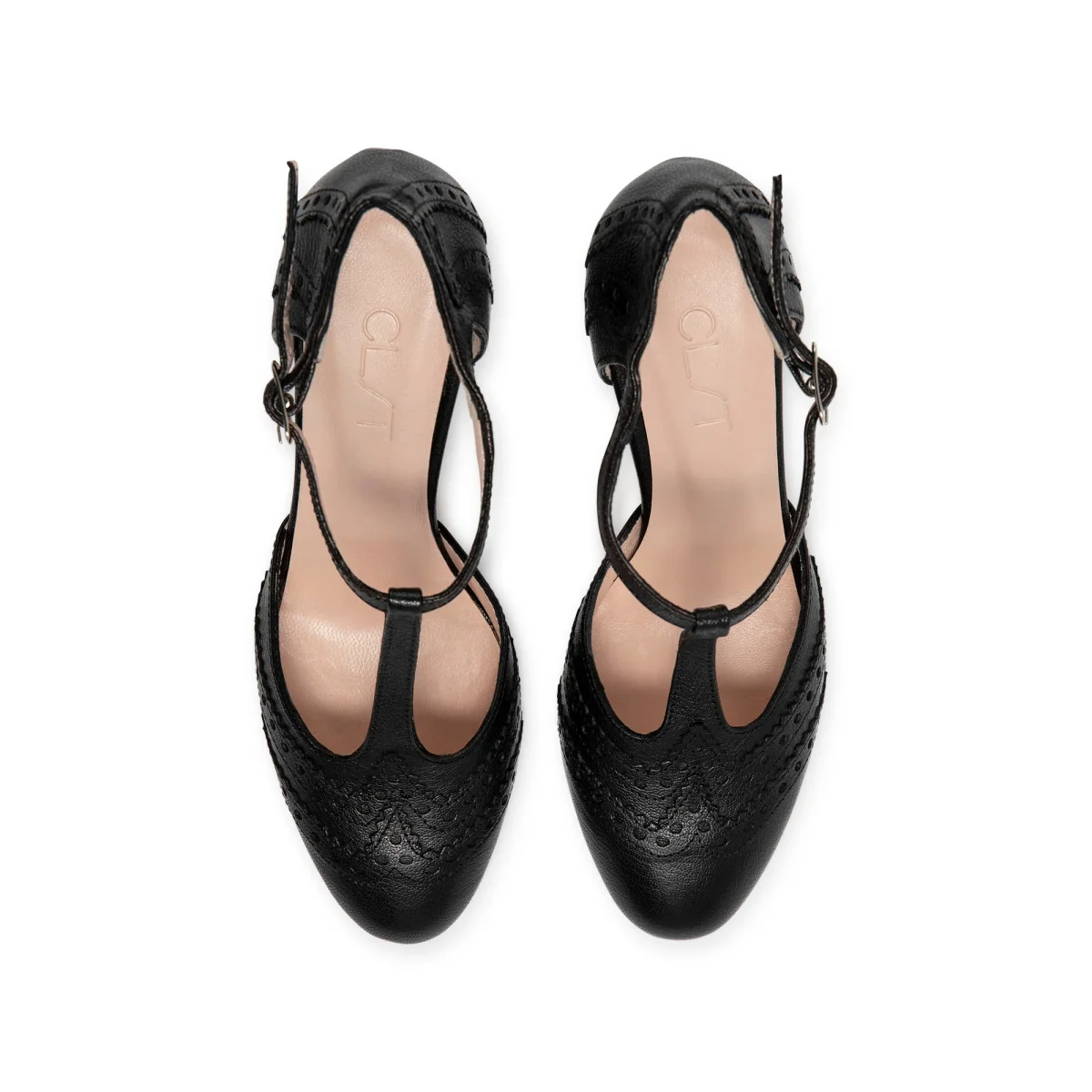 Scarpa in pelle a punta tonda con T-strap e cinturino raccordato e regolabile alla caviglia.