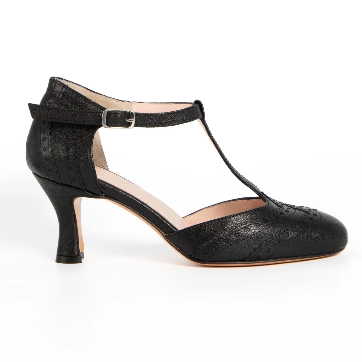 Scarpa in pelle a punta tonda con T-strap e cinturino raccordato e regolabile alla caviglia. Sottopiede in pelle, suolo in cuoio e tacco rivestito di 7cm