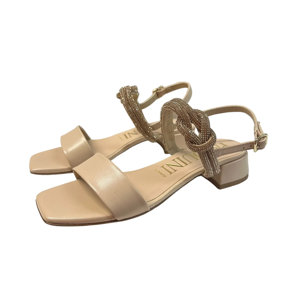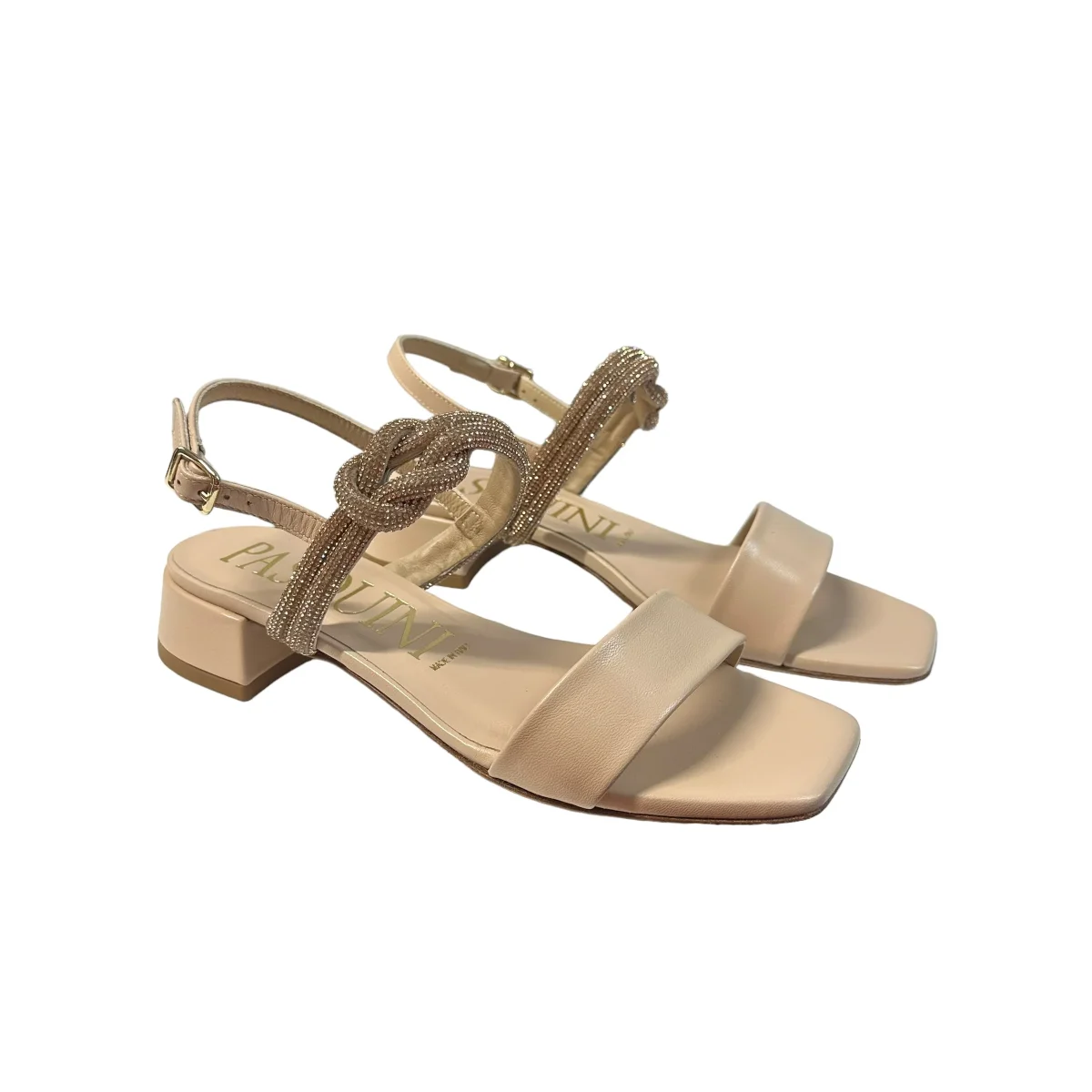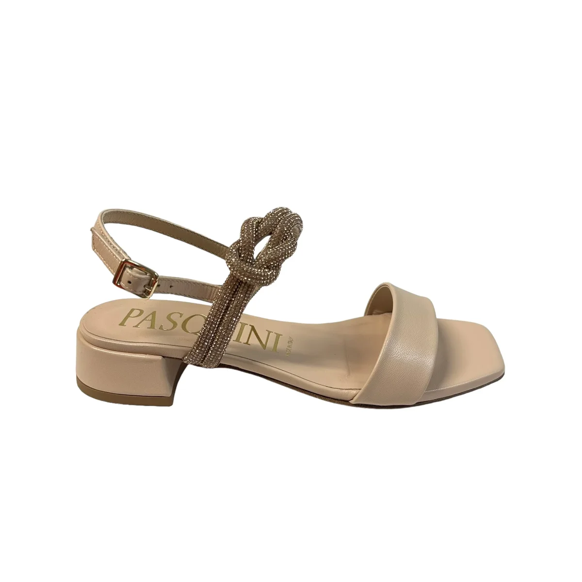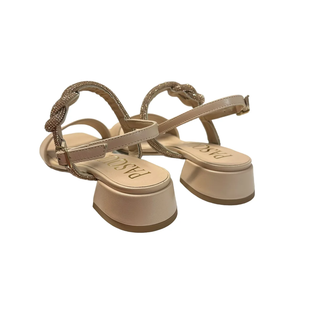 Sandalo in pelle con nodo strass e cinturino alla caviglia, fondo cuoio tacco 3cm