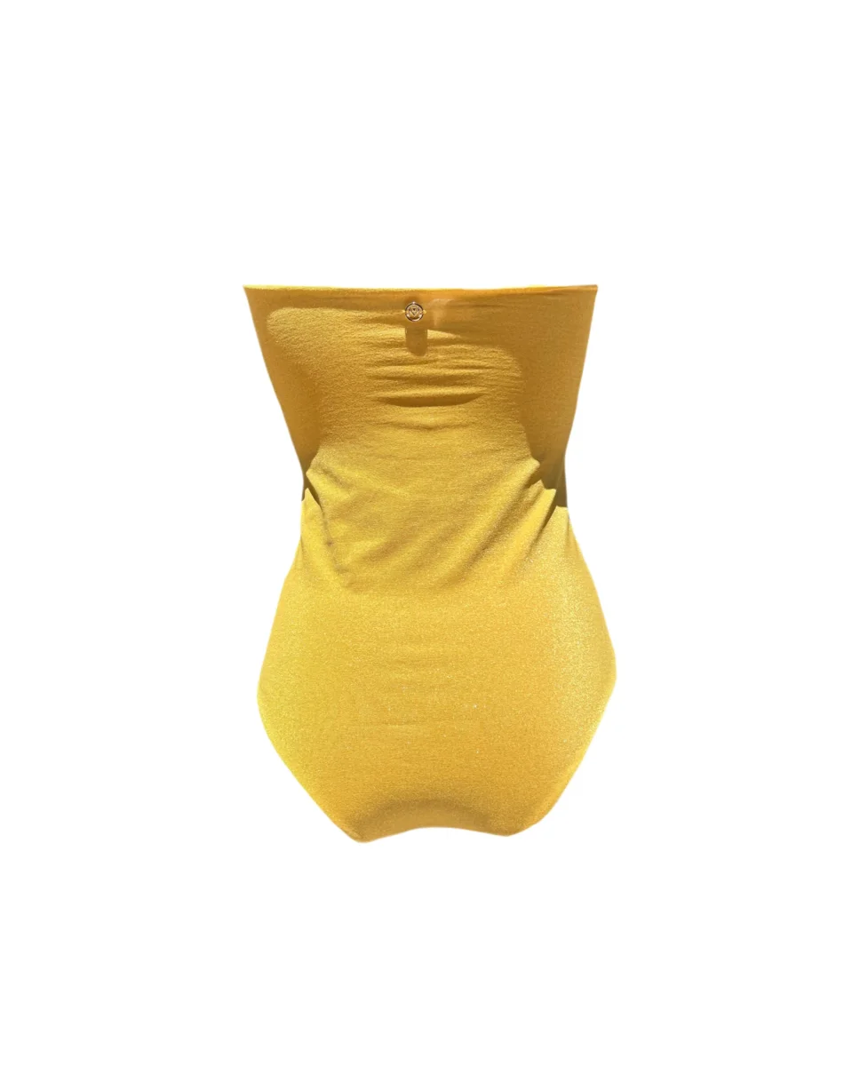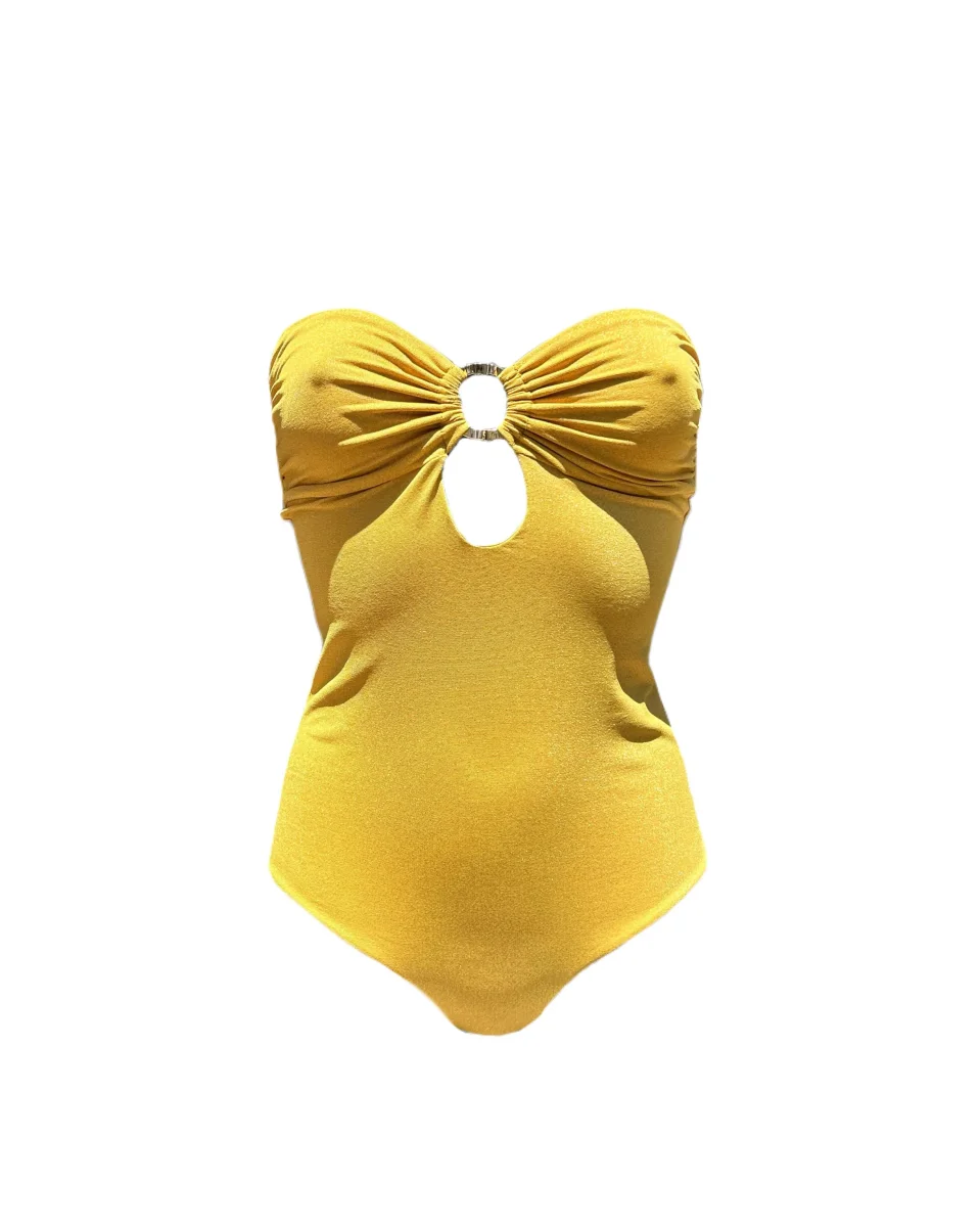 - Costume da bagno intero con anello dorato centrale ferretto laterale per modellare e sostenere il seno.