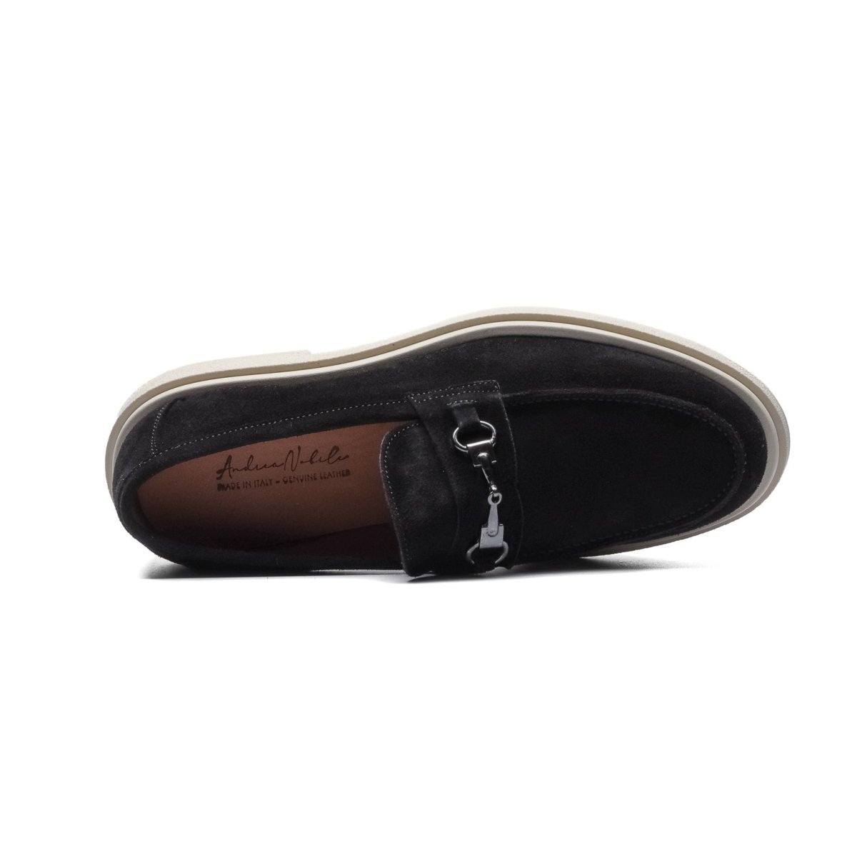 Calzatura artigianale made in Italy modello Penny Loafer Horsebit. Realizzata in pelle scamosciata tinta nel colore nero con mascherina tono su tono e applicazione di morsetto in metallo imbrunito. Interno foderato in pelle nel colore beige con logo stampato nel colore nero. Suola in gomma ultra-leggera, nel colore bianco naturale, per offrire maggior comfort alle lunghe passeggiate. Un classico dalla struttura innovativa, indossale con dei pantaloni sartoriali o chinos slim fit. Questa calzatura realizzata a mano unisce storia, eleganza, comfort e robustezza tipici dei prodotti Made in Italy con lo stile unico di Andrea Nobile.