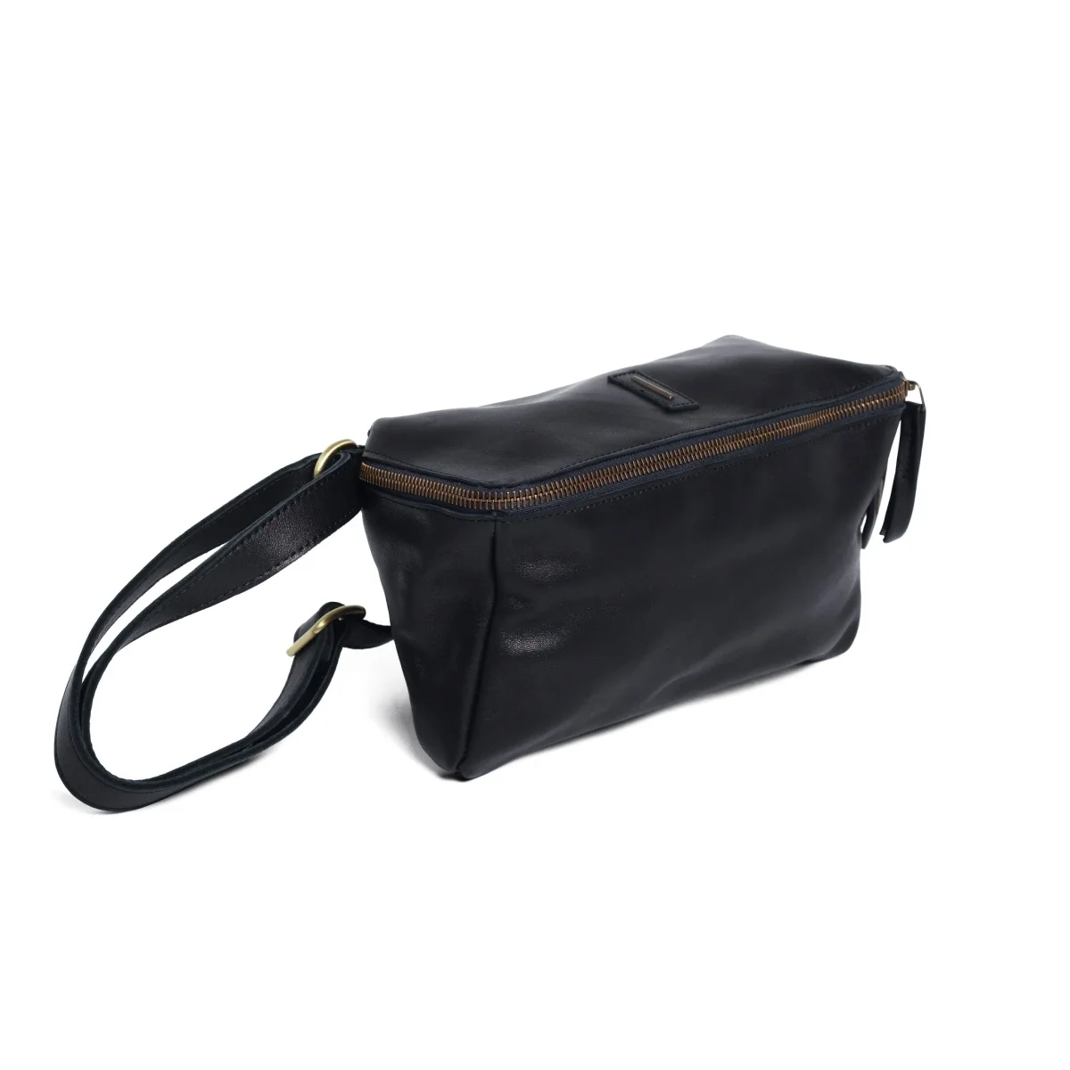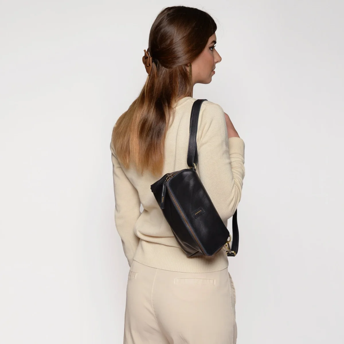 Un comodo marsupio con cinta regolabile dall’accattivante forma geometrica.