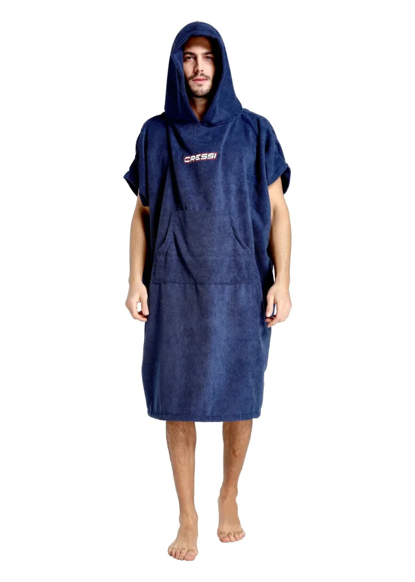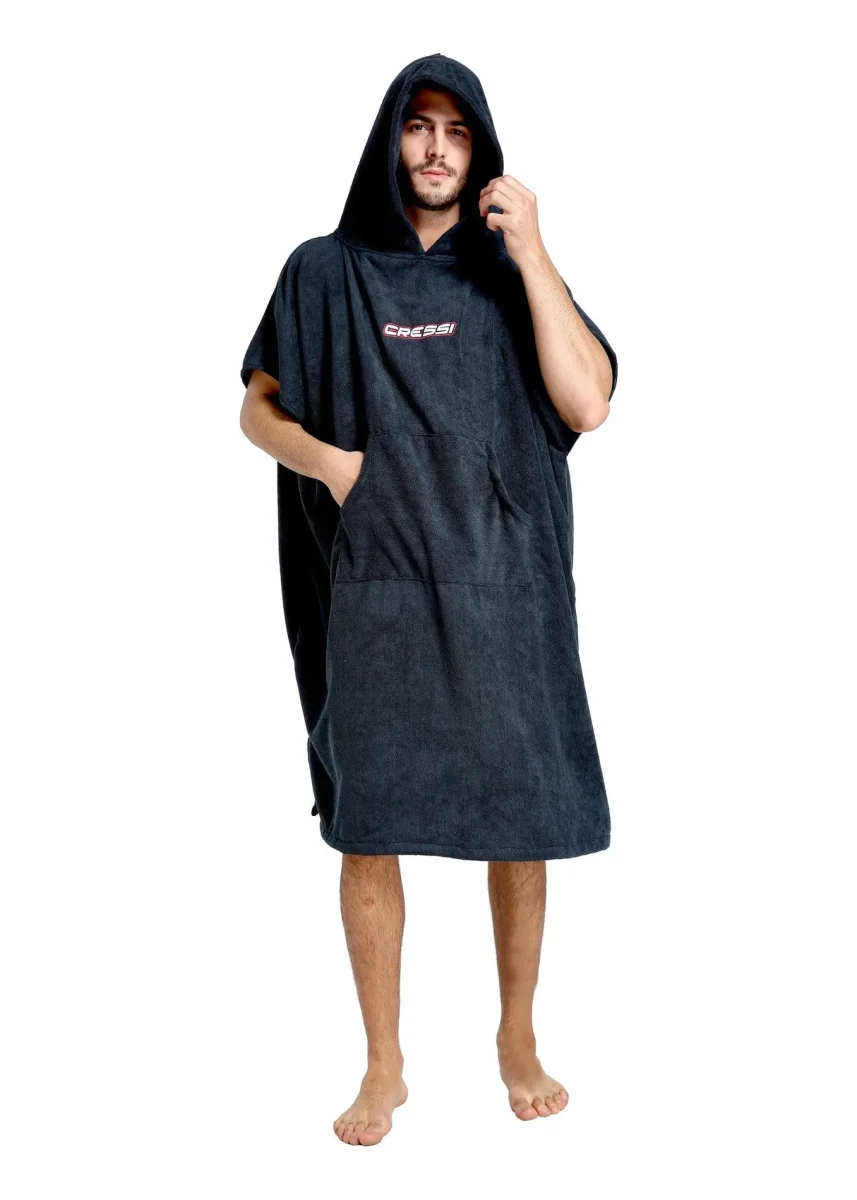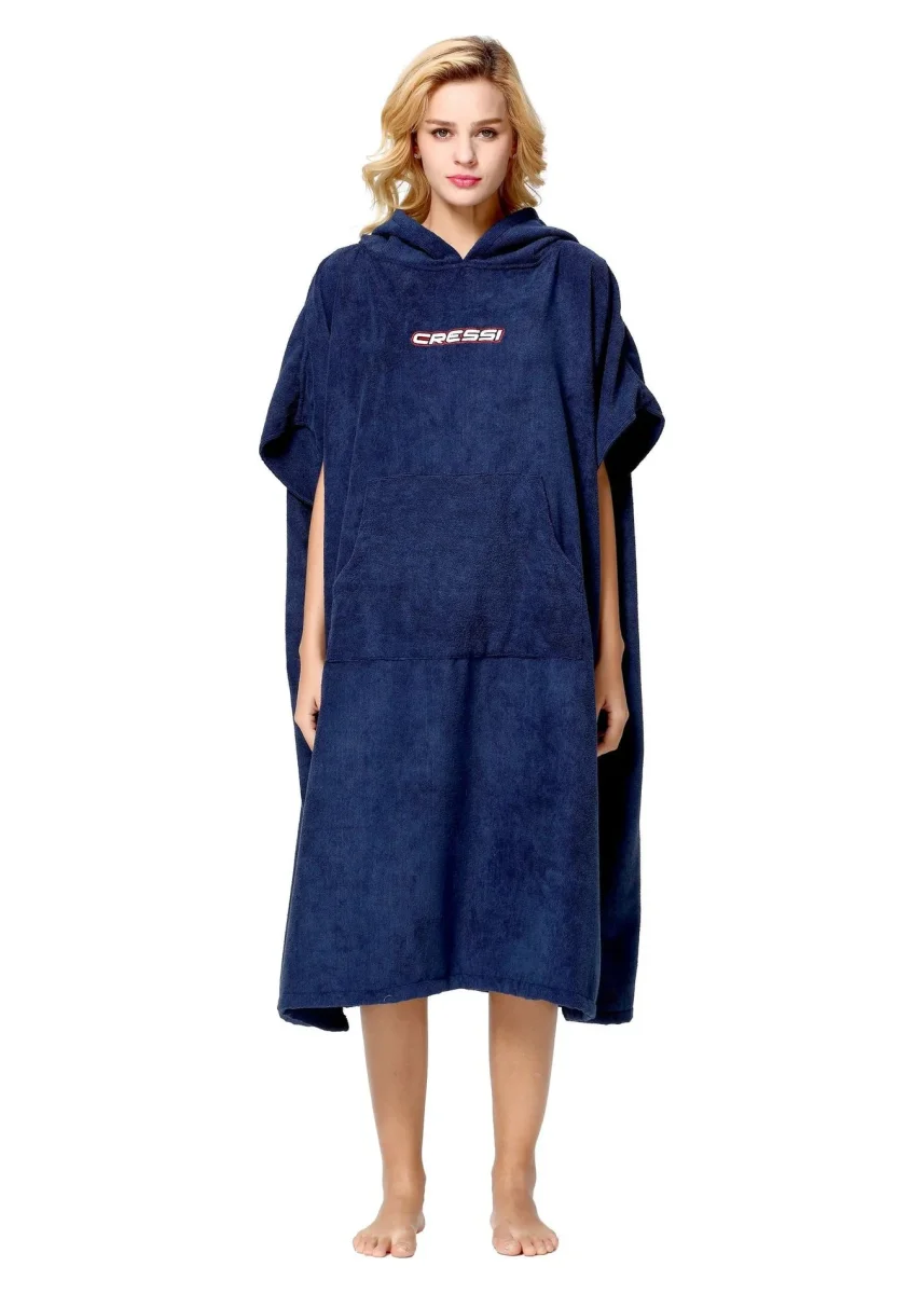 Cressi poncho è un accappatoio in microfibra ad asciugatura rapida per il nuoto e gli sport all’aperto. Sufficientemente grande per coprirsi e cambiare la muta o il costume da bagno dopo le attività.