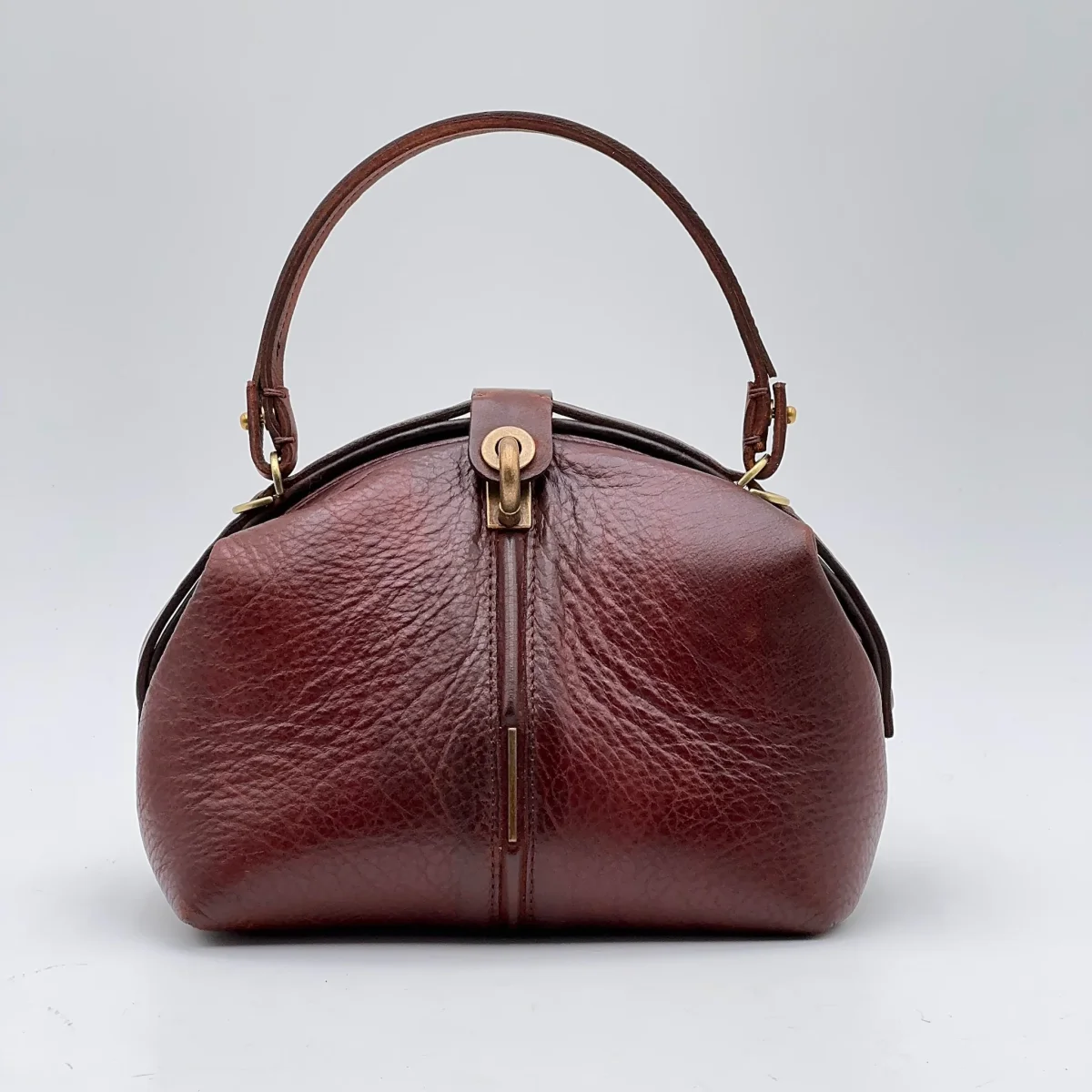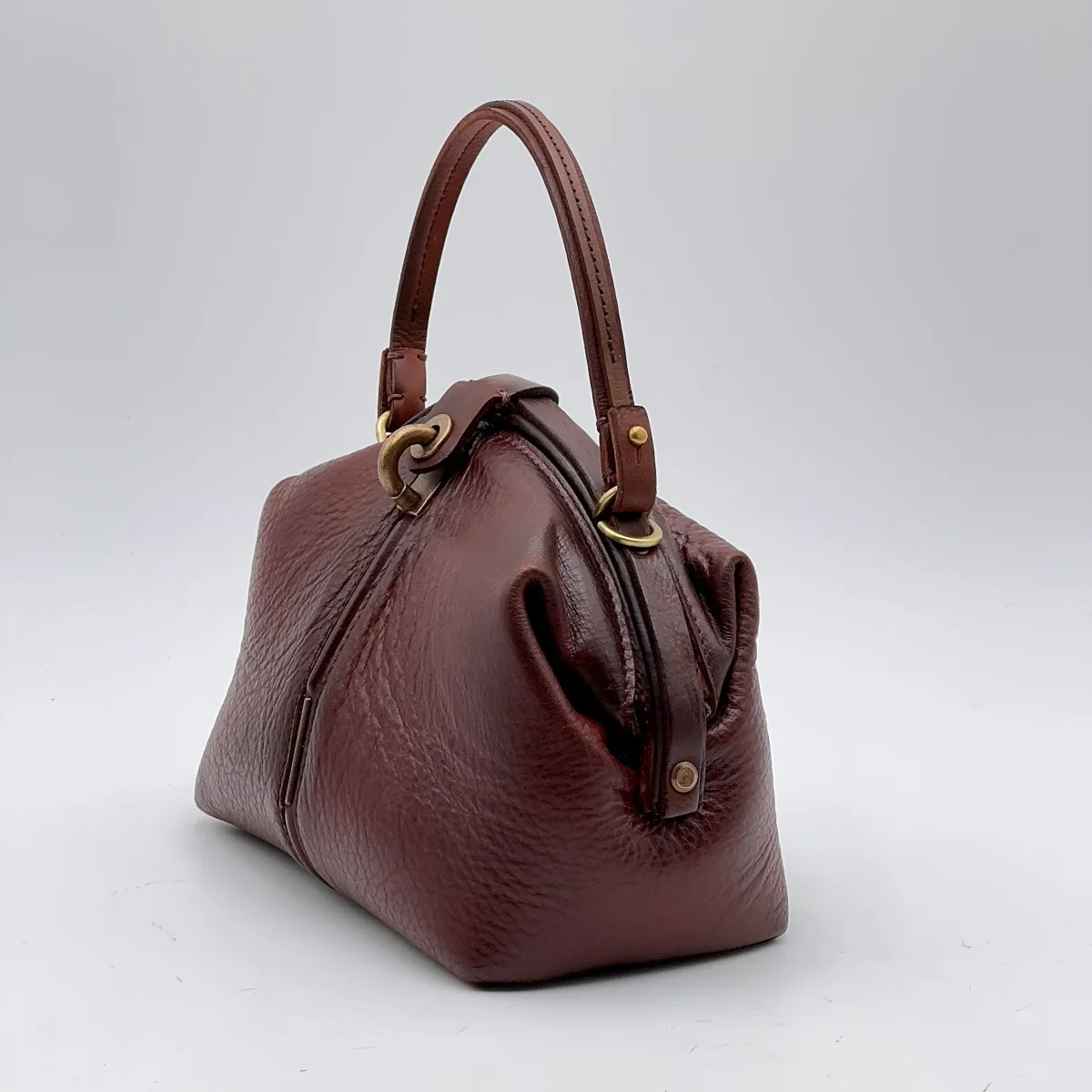 Pouf Medium tinta in capo color corteccia, spazzolata a mano per darle effetto vintage. Questa borsa è pensata per chi cede al fascino della semplicità.