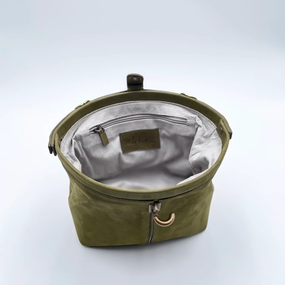 Pouf è una borsa dalla morbidezza eccezionale e dalla armoniosa forma a mezza luna, realizzata in pelle nabuk Long Beach nel colore carciofo, che fonde sapientemente la tradizione artigianale con la funzionalità contemporanea. La sua struttura, caratterizzata da un’apertura ampia e pratica in stile doctor bag, permette di avere tutto l’essenziale immediatamente a portata di mano, mentre la chiusura con perno a scatto e linguetta in pelle coordinata conferisce un tocco di carattere esclusivo.