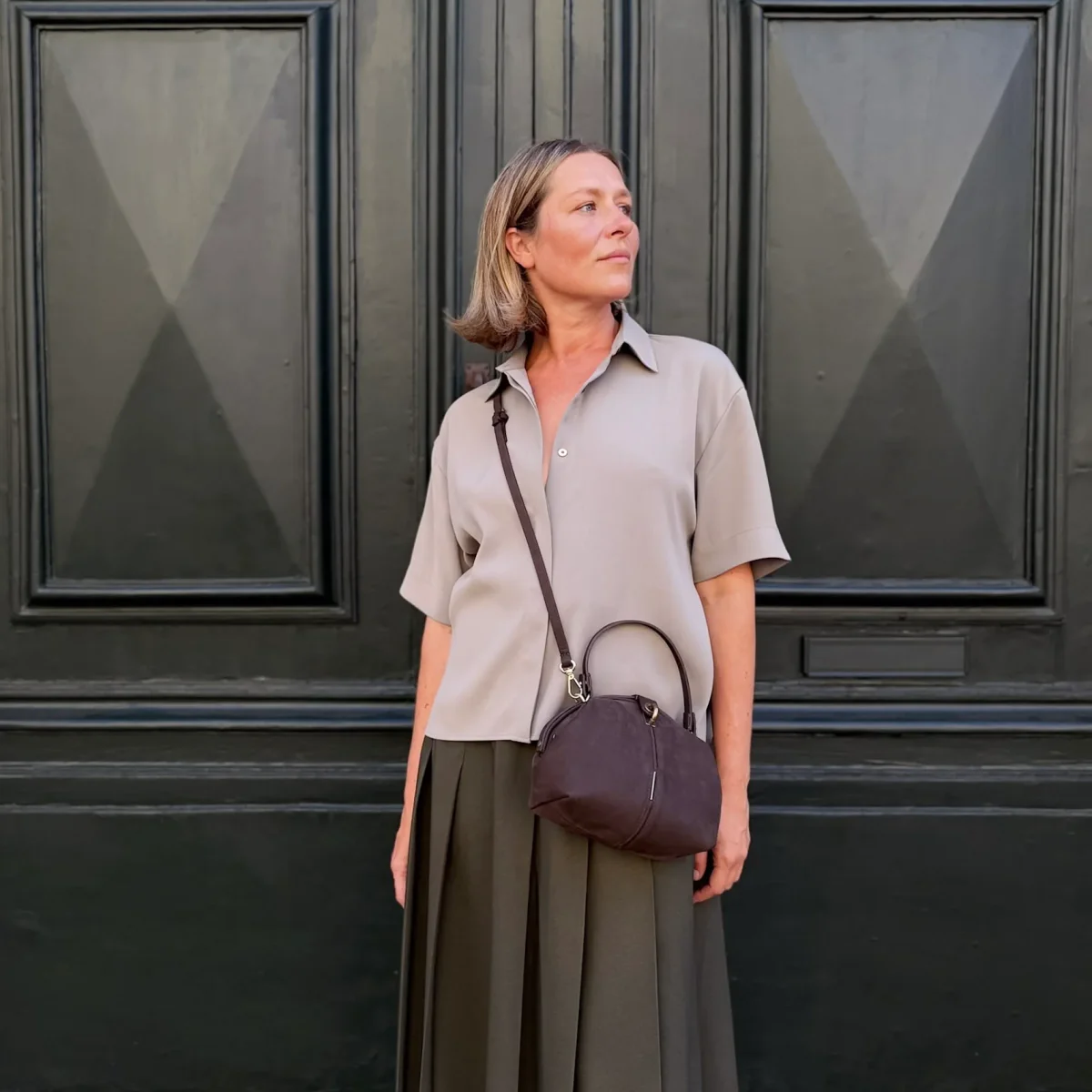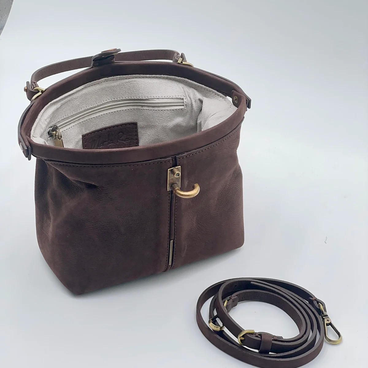 Pouf Medium è una borsa a mano morbida e armoniosa, dalla forma a mezza luna. L’ampia apertura stile doctor bag consente un accesso pratico e veloce, mentre la chiusura con perno e linguetta in tinta aggiunge un dettaglio elegante. Può essere portata a mano oppure a spalla grazie alla tracolla regolabile in cuoio doppiato.