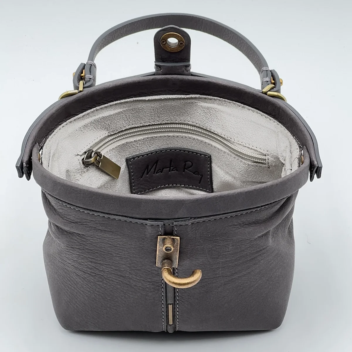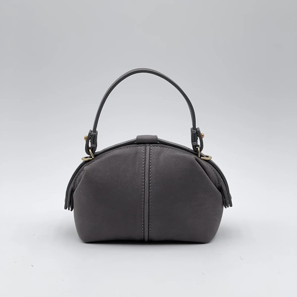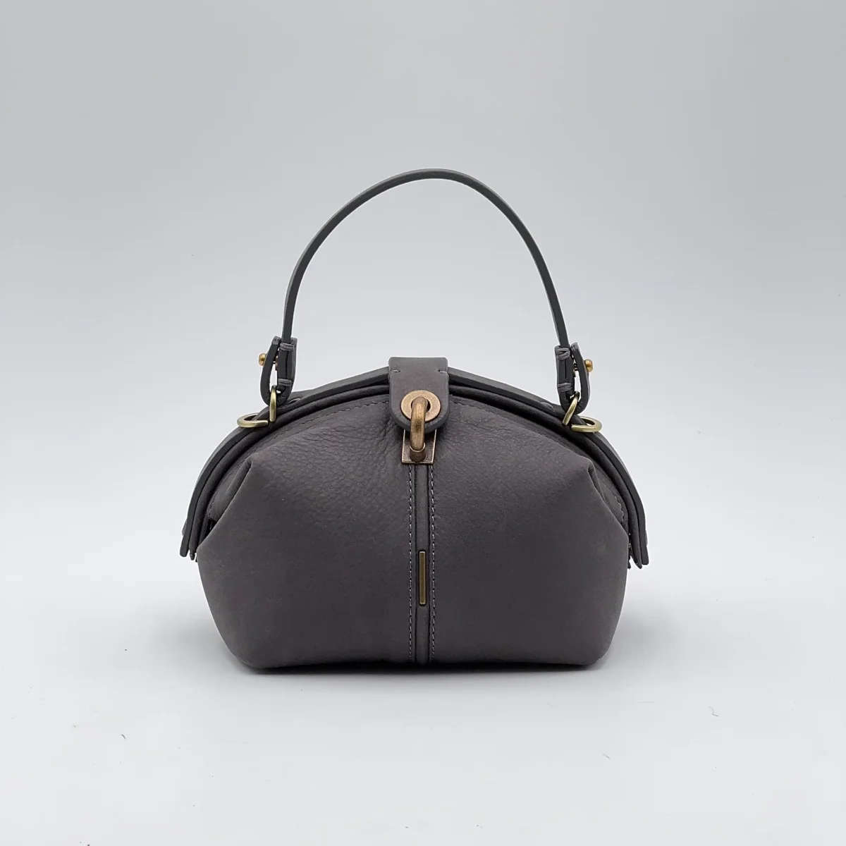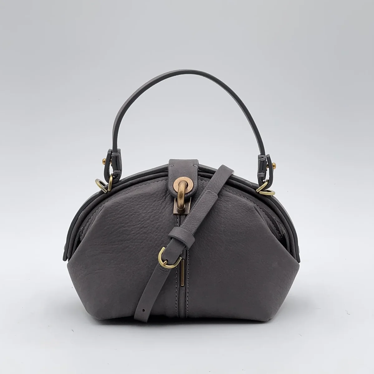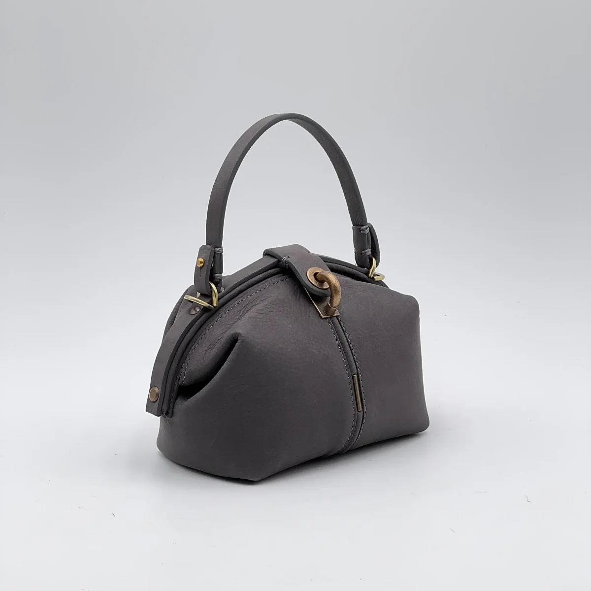 La Pouf Small in pelle Long Beach color fumo conserva il carattere della nostra borsa a mezza luna, ma in una versione più leggera e maneggevole. Si apre ampiamente come una classica doctor bag e si chiude con un perno a scatto, mentre la linguetta coordinata aggiunge un tocco di eleganza.