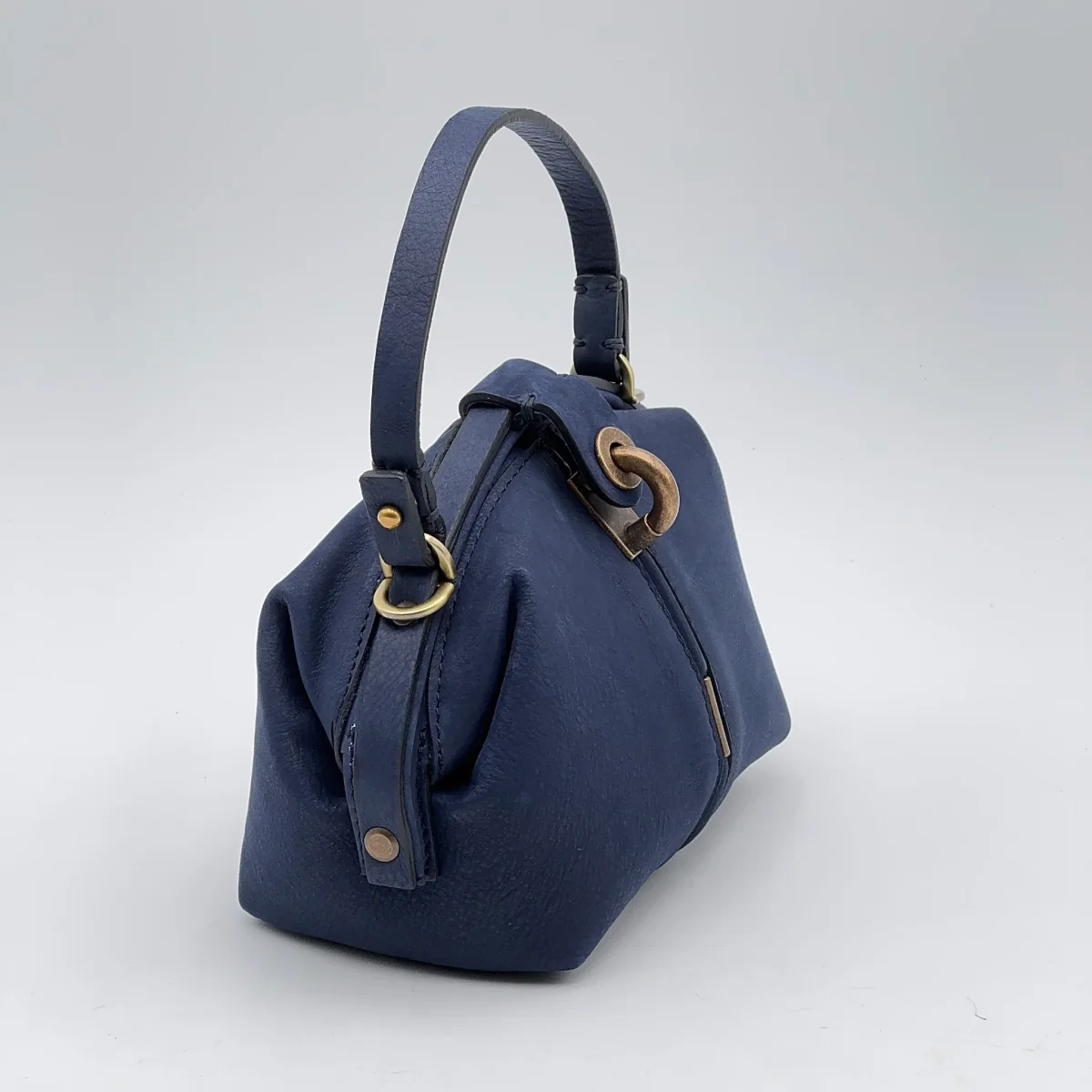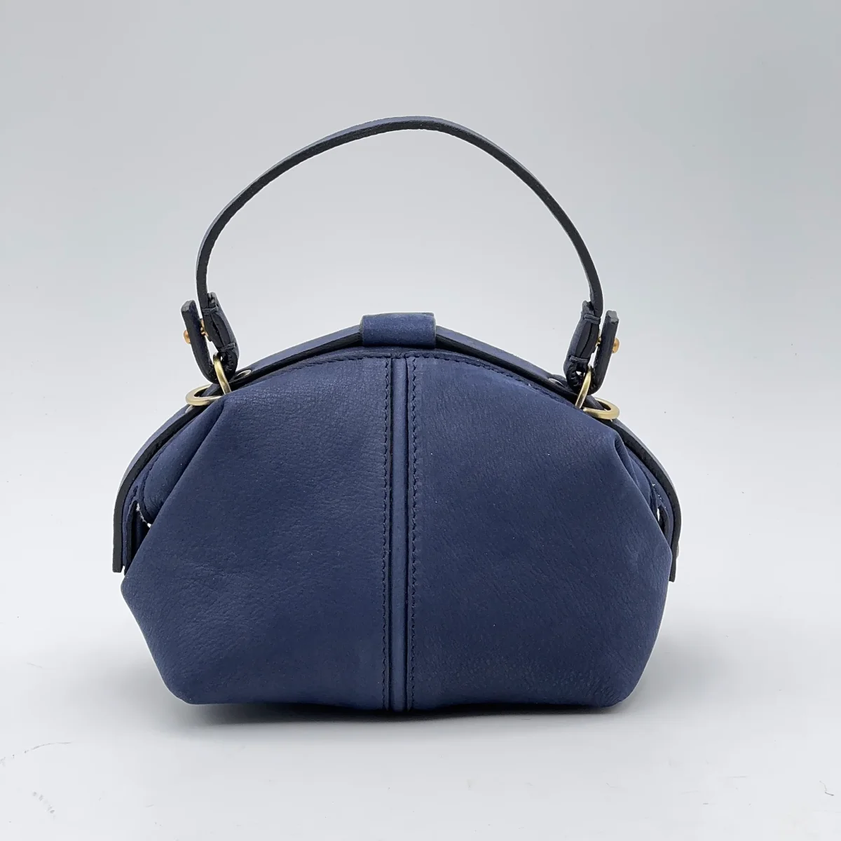 La Pouf Small in pelle Long Beach color blu nautica conserva il carattere della nostra borsa a mezza luna, ma in una versione più leggera e maneggevole. Si apre ampiamente come una classica doctor bag e si chiude con un perno a scatto, mentre la linguetta coordinata aggiunge un tocco di eleganza.