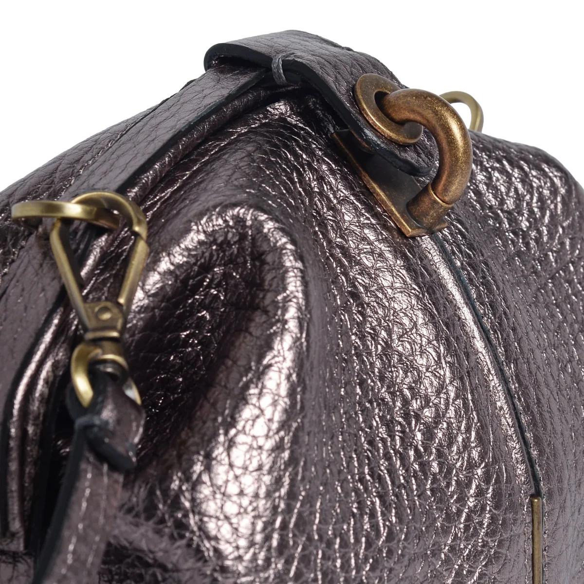 Apertura comoda come una doctor bag. La chiusura invece è con un perno a scatto corredato di linguetta in tinta.
