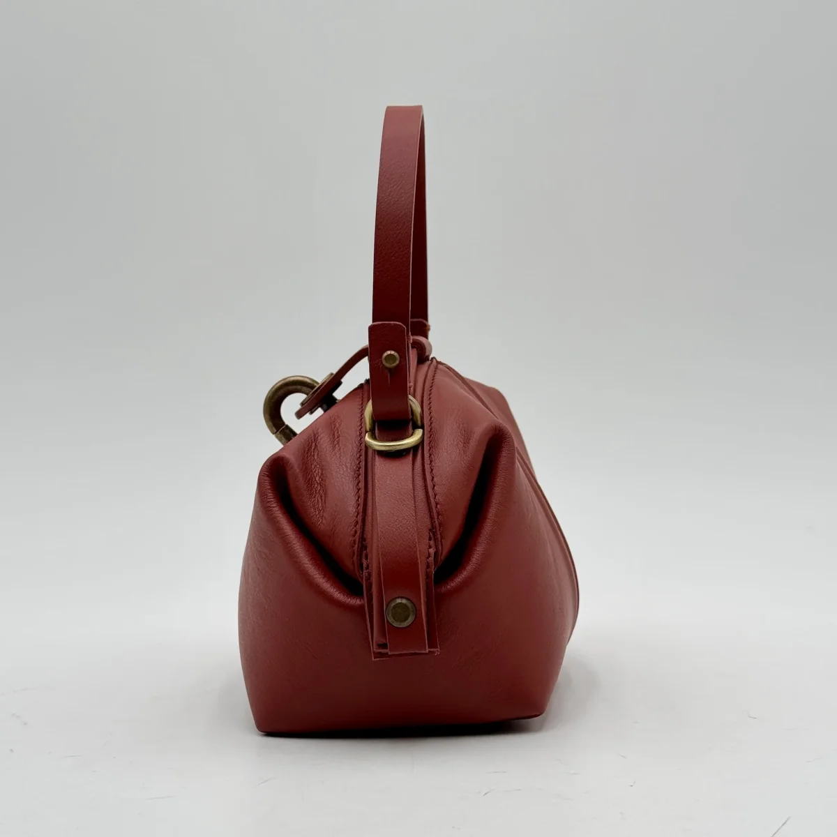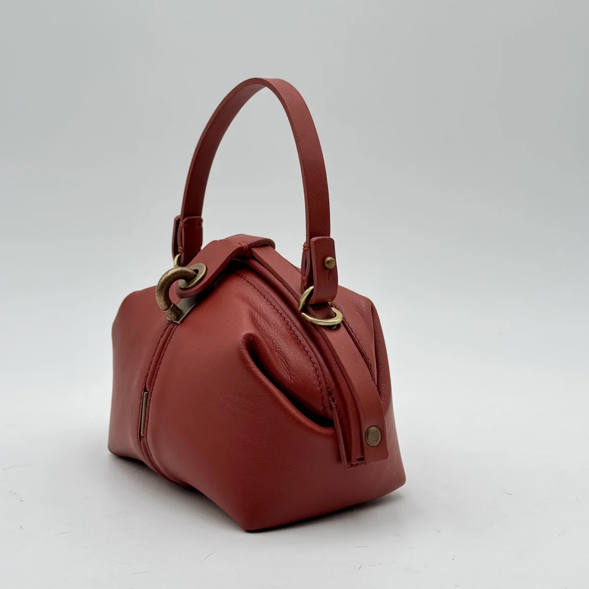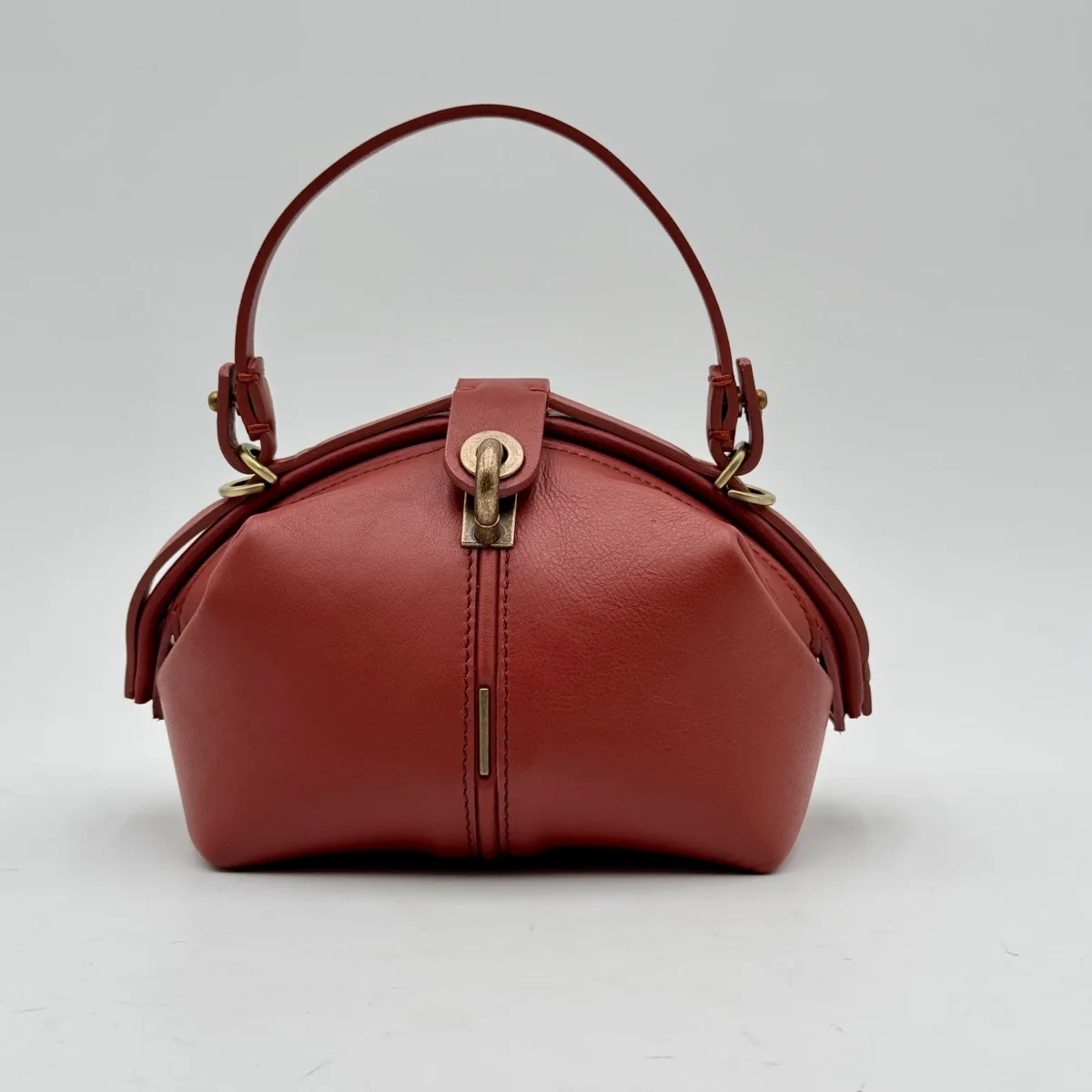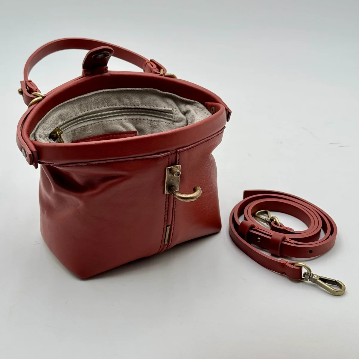 Apertura comoda come una doctor bag. La chiusura invece è con un perno a scatto corredato di linguetta in tinta.