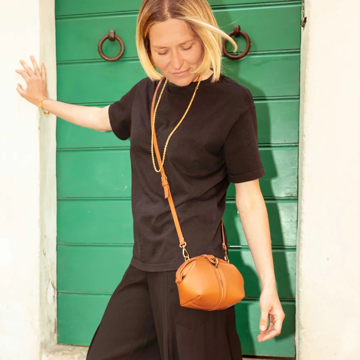 Apertura comoda come una doctor bag. La chiusura invece è con un perno a scatto corredato di linguetta in tinta.