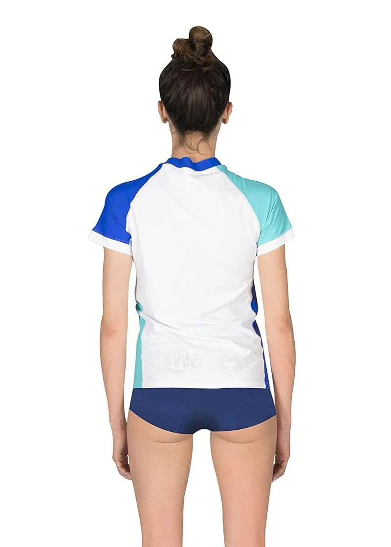 La Rash Guard Shield è una maglietta protettiva a manica corta da donna. Questa Rash Guard è realizzata in tessuto elasticizzato R-PET (PET riciclato) e Spandex.