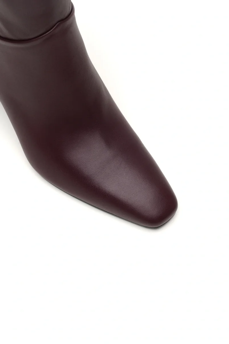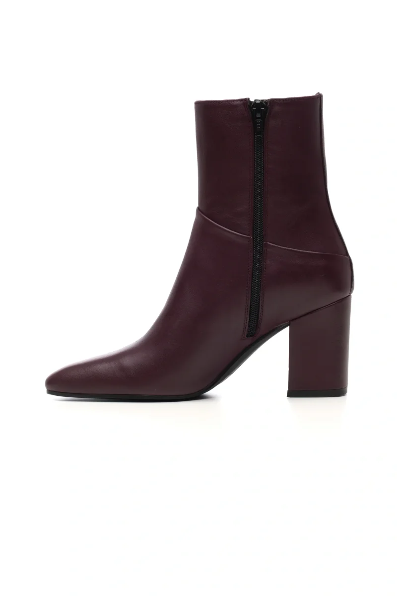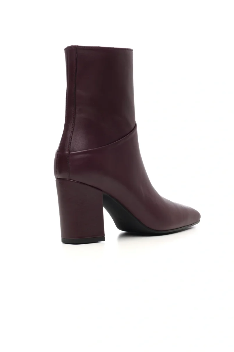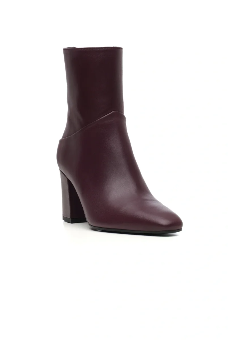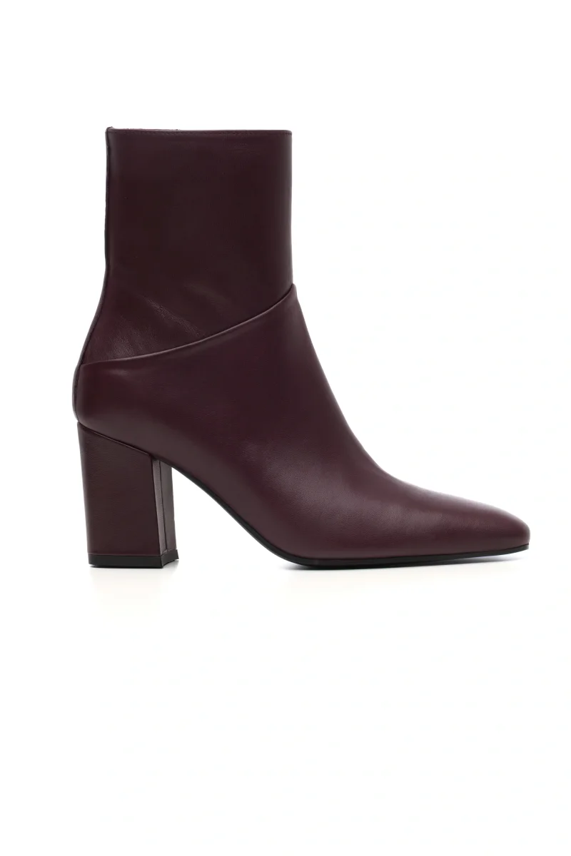 Un modello contemporaneo e versatile, questo tronchetto in morbida nappa vino si distingue per la sua linea moderna e decisa. Il design presenta una punta quadrata e un tacco largo che garantisce stabilità e comfort per tutto il giorno. Il dettaglio del taglio diagonale sulla parte posteriore della tomaia dona movimento e carattere alla silhouette, rendendolo perfetto per look eleganti o dal tocco urban.