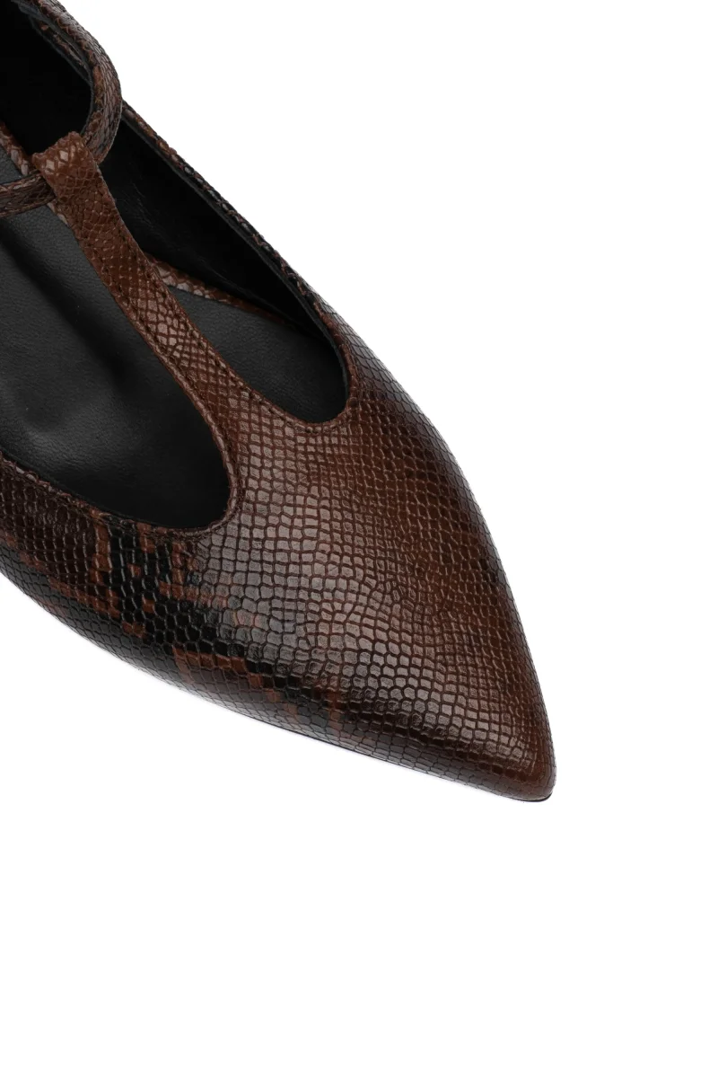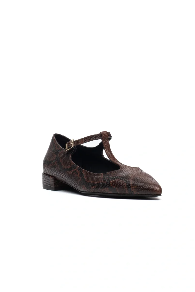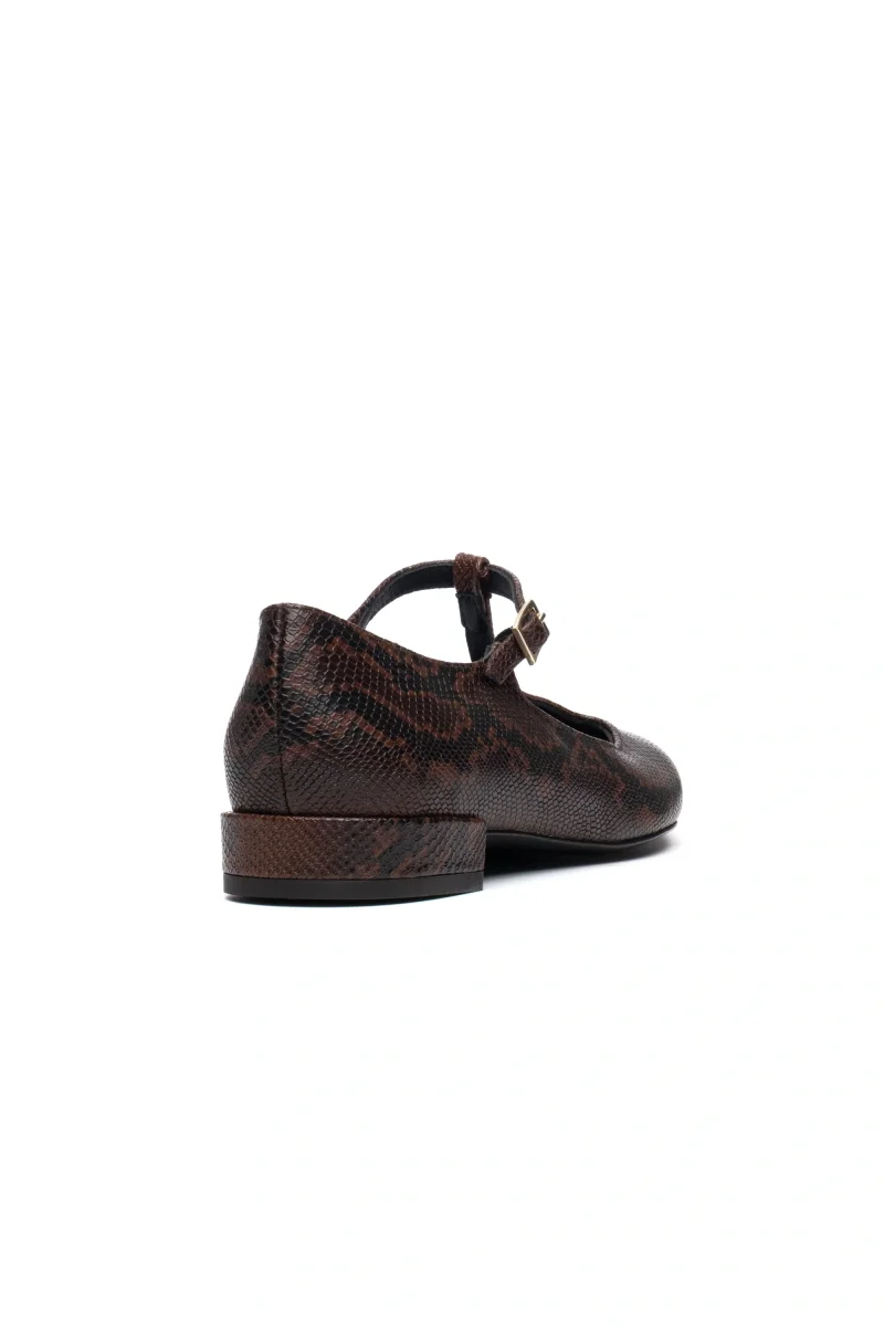 Eleganza esotica e comfort quotidiano si incontrano in questa ballerina flat in pelle con stampa pitone marrone, pensata per aggiungere un tocco sofisticato e deciso a ogni look. La punta affusolata slancia la silhouette e dona un’eleganza discreta, mentre i due occhielli sul collo piede, uniti alla fibbia regolabile, aggiungono carattere e una nota contemporanea.Realizzata con cura artigianale, questa ballerina combina la morbidezza della pelle con la grinta del motivo animalier, perfetta da abbinare a outfit minimal, jeans cropped o abiti midi.