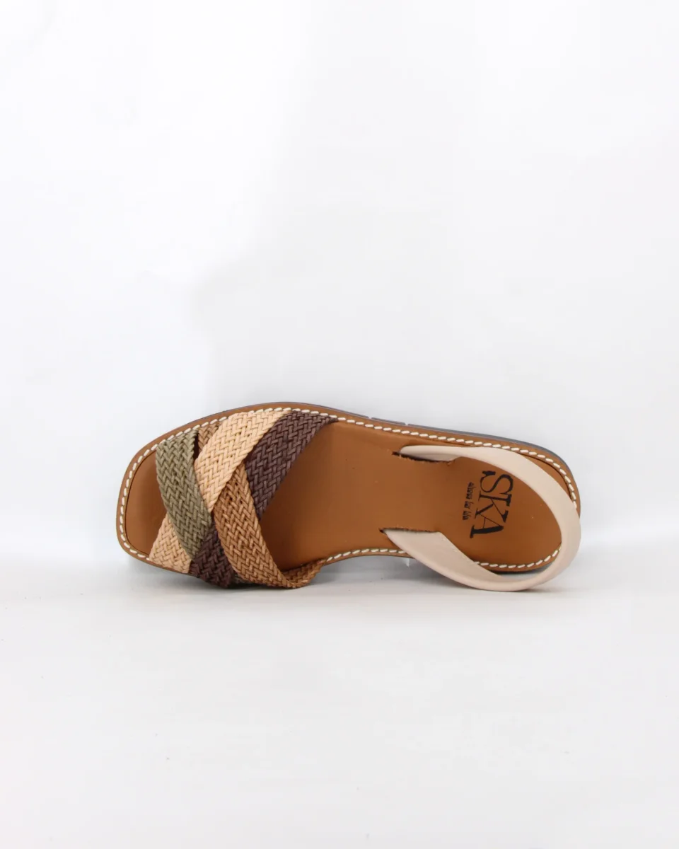 RON Minorchina con tomaia intrecciata e tallone in nappa. Suola in gomma. RON è una rivisitazione del sandalo tipico dell’isola di Minorca, con tomaia intrecciata. Il tallone è in nappa mentre la suola in gomma riproduce invece gli pneumatici, proprio come vuole la tradizione.