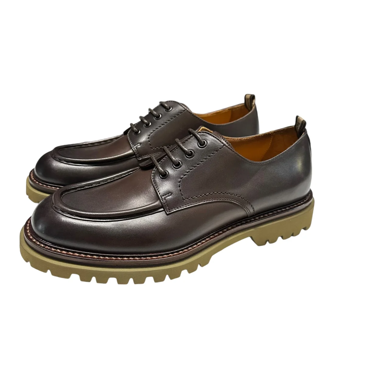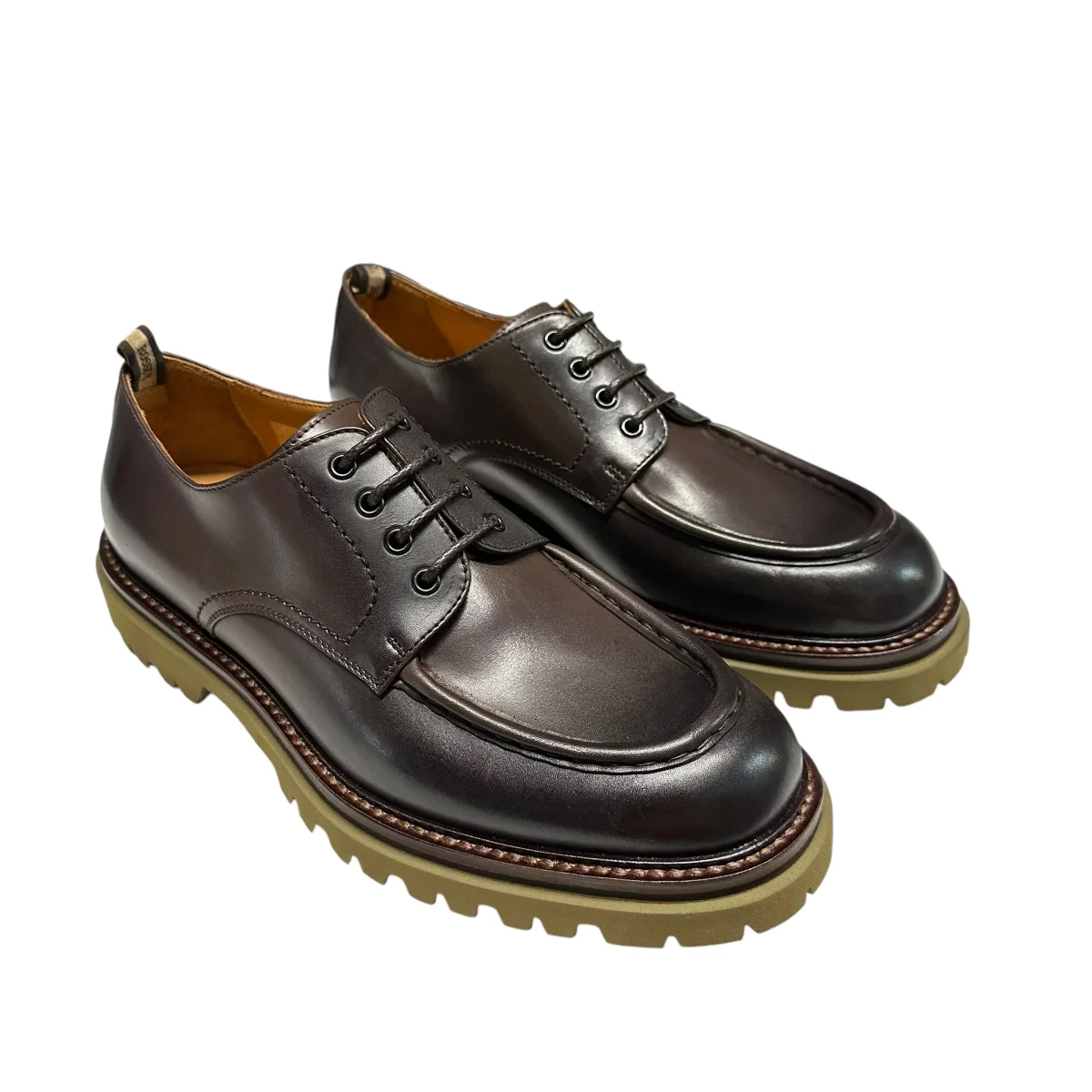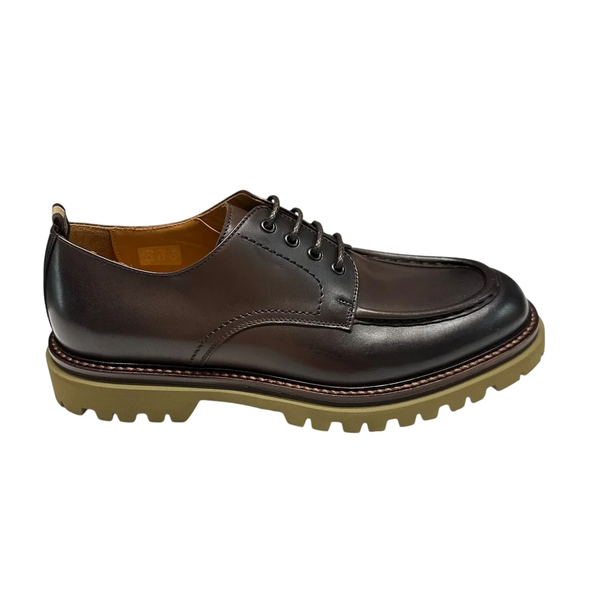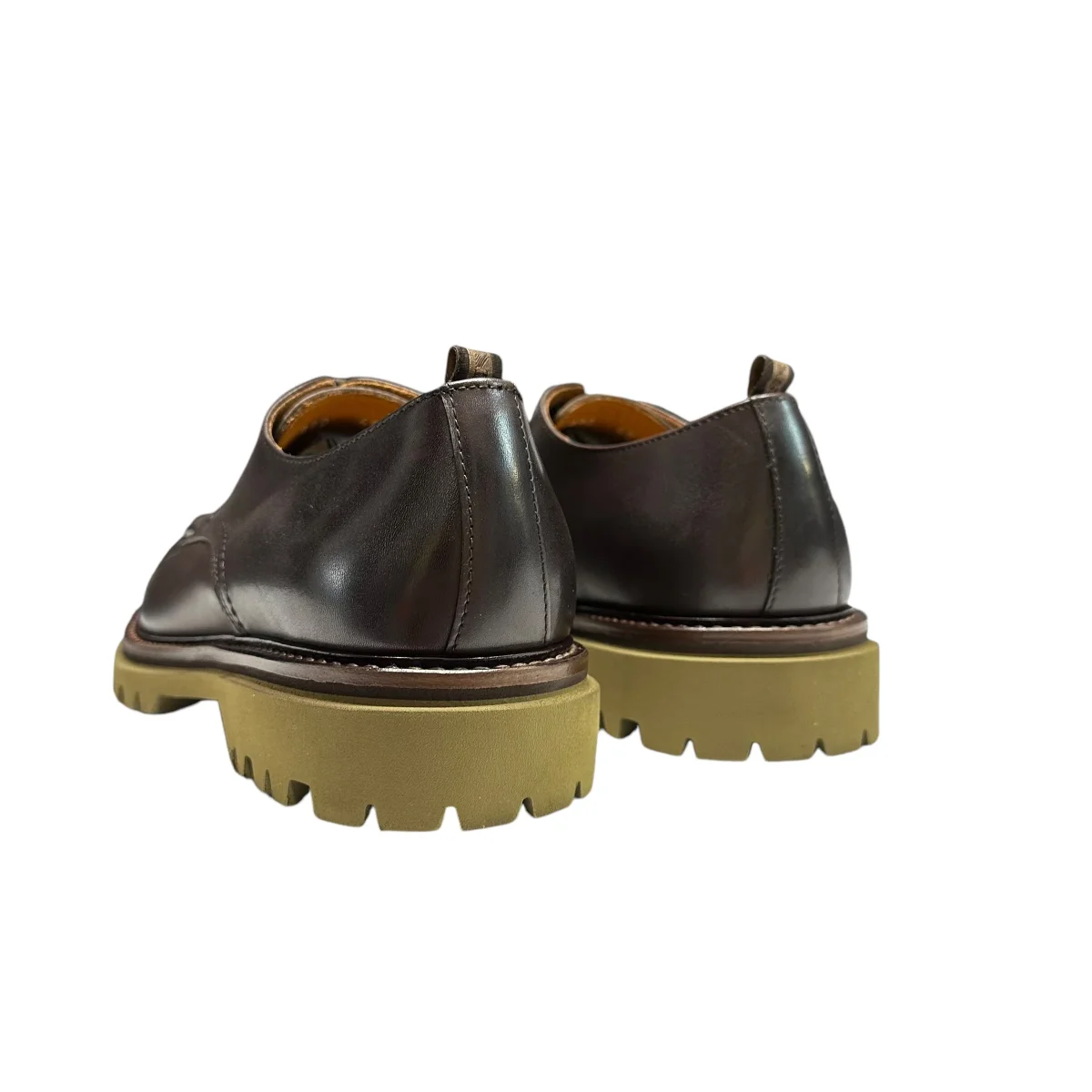 stringata in pelle testa di moro con cuciture in punta, fondo gomma verde