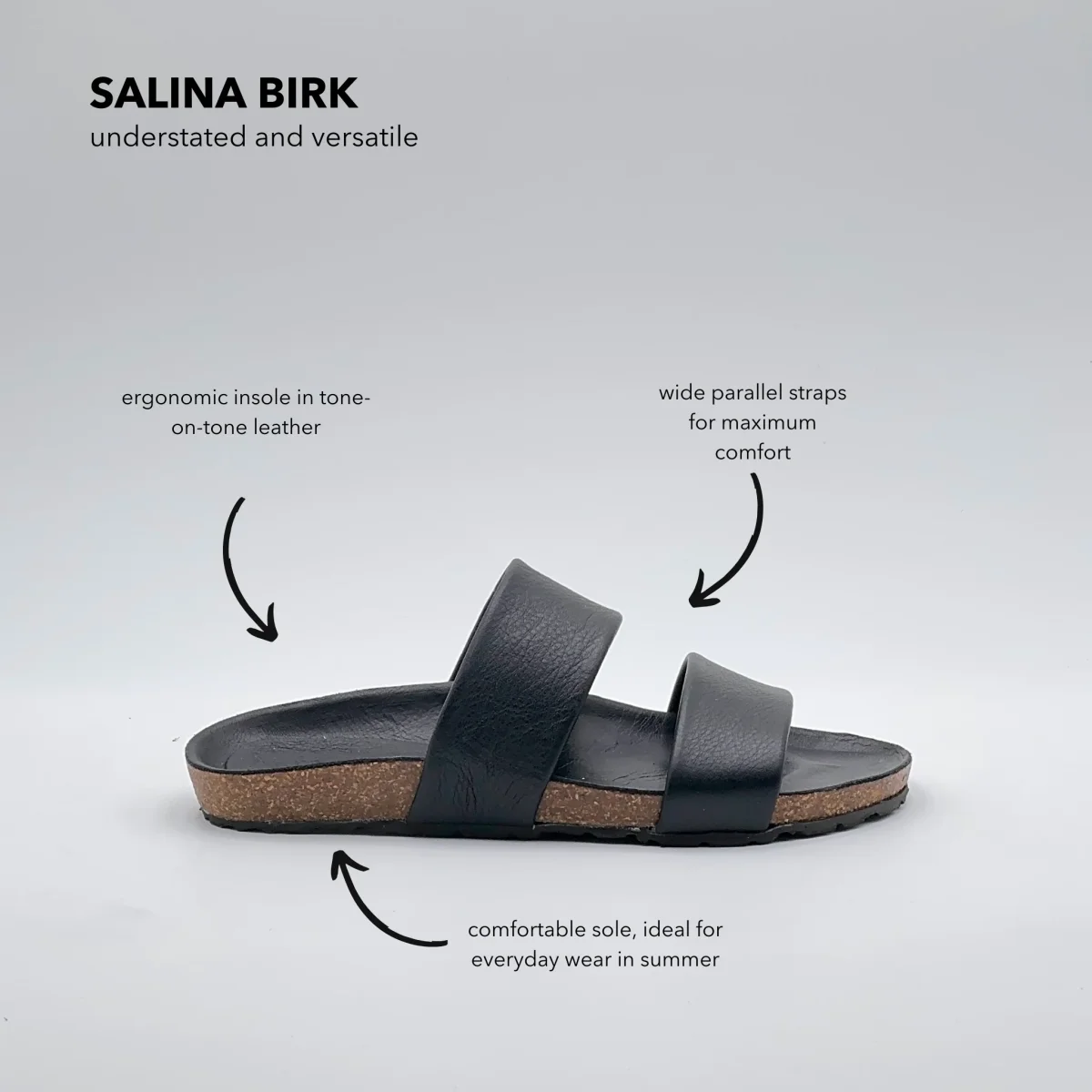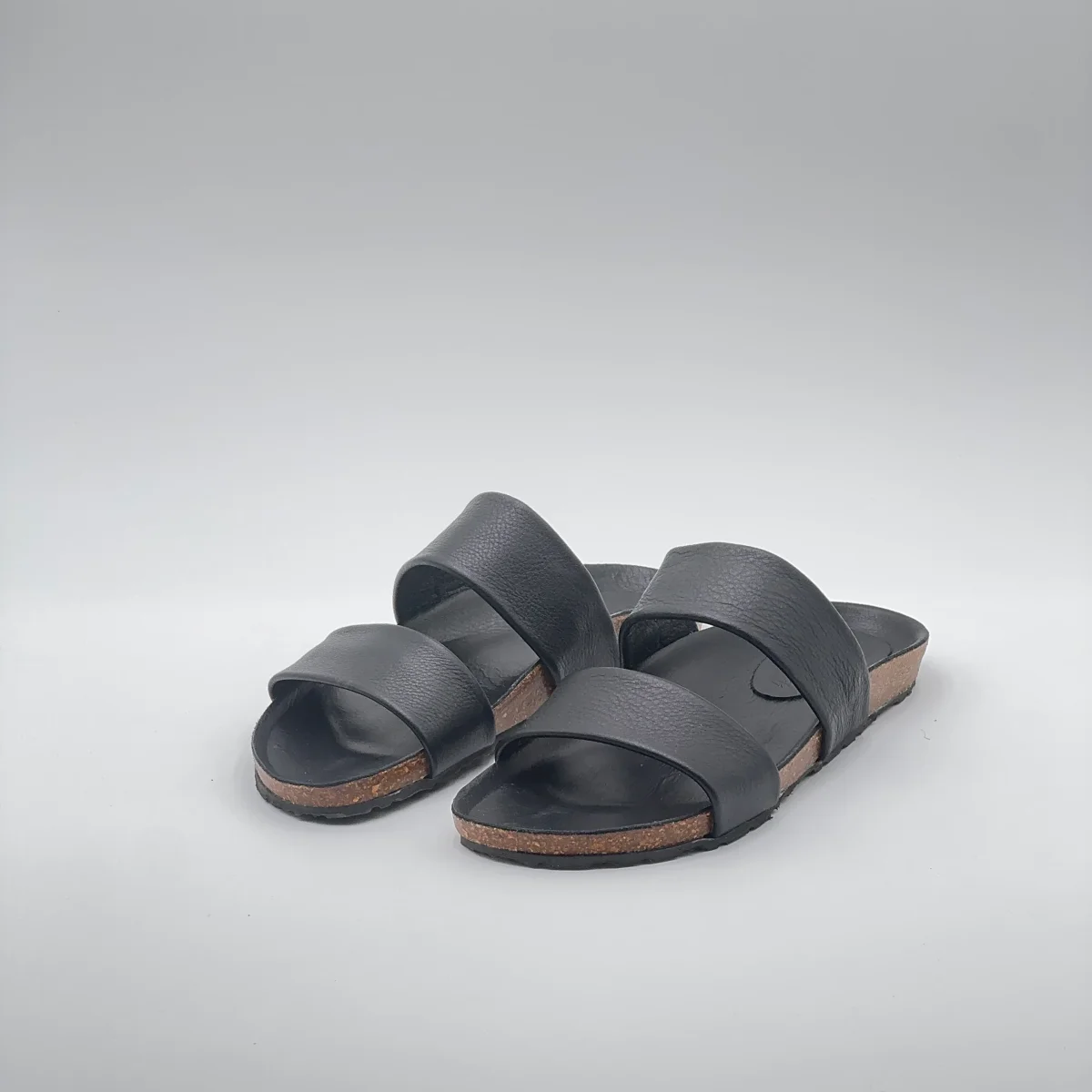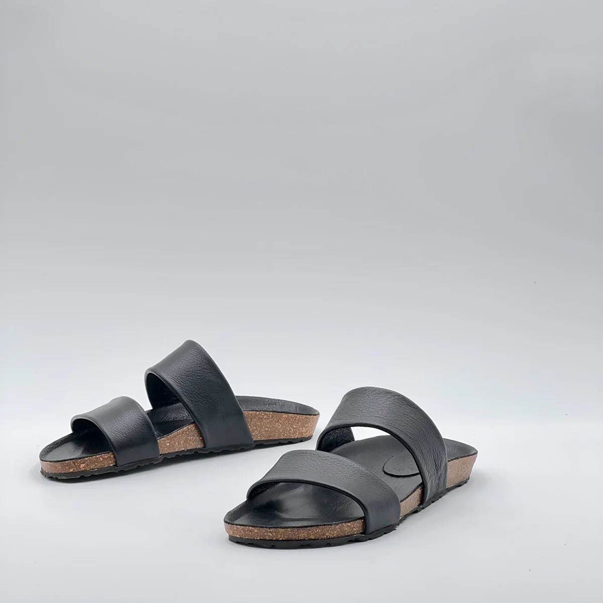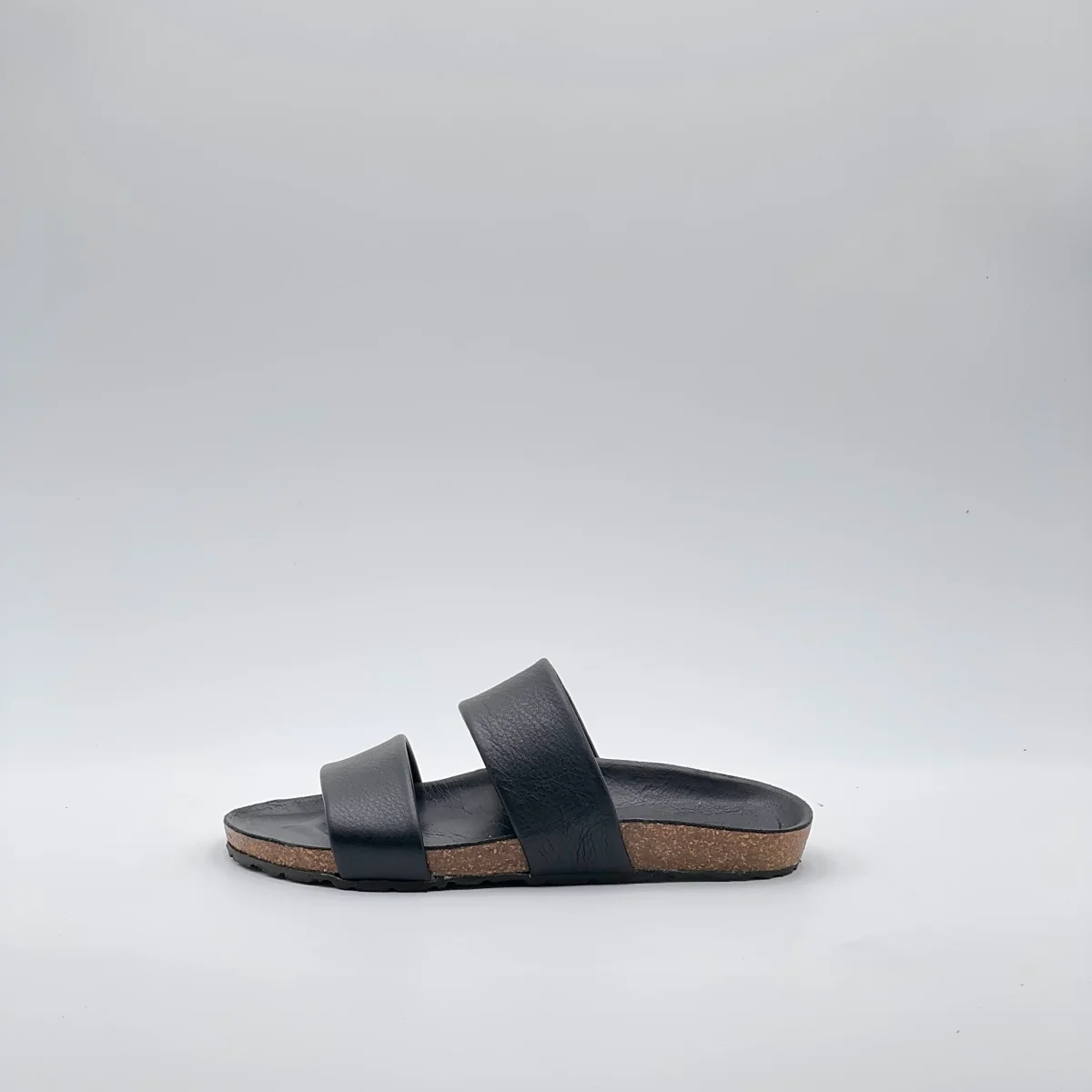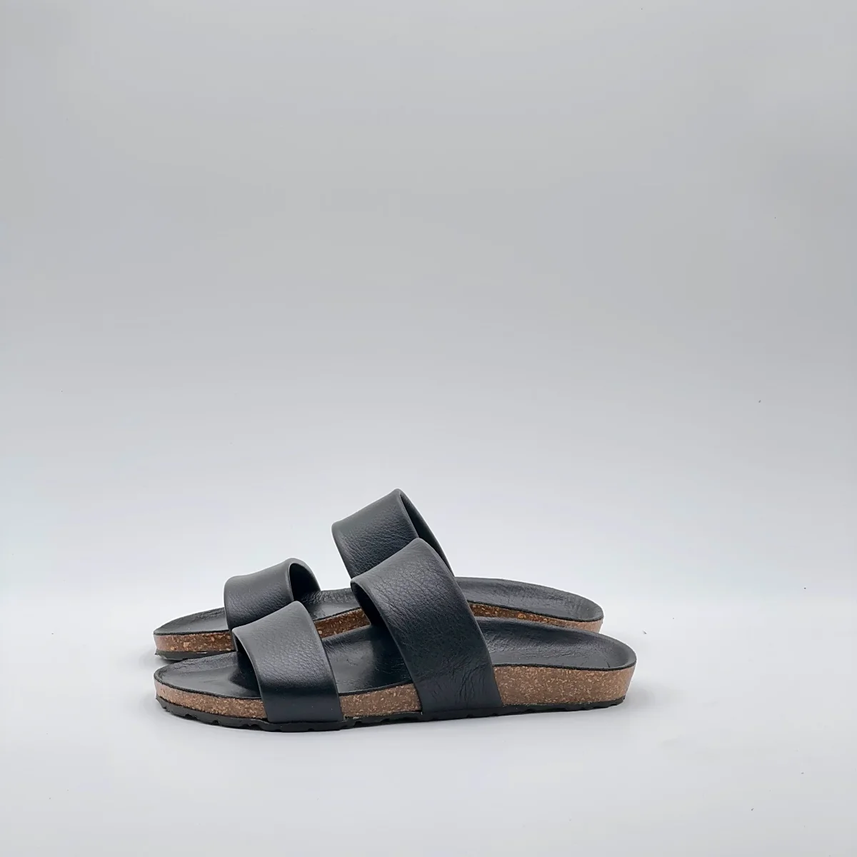 Sandalo flat in pelle Mousse nera con suola ergonomica rivestita nello stesso materiale. Due fasce parallele dal taglio pulito avvolgono il piede con equilibrio e comfort.Artigianale, essenziale, perfetto per tutti i giorni.