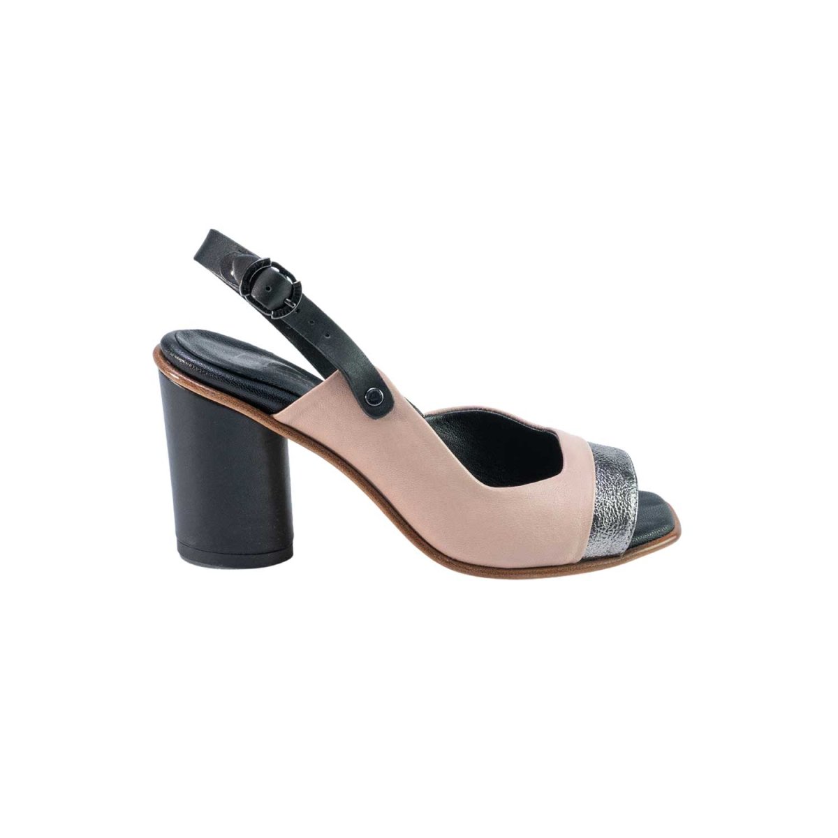 Sandali a punta aperta in pelle di vitellino lavorati e trattati a mano, il tacco misura 8cm e ha un punto d’appoggio piuttosto largo che garantisce comodità e stabilità. L asuola è in gomma antiscivolo.