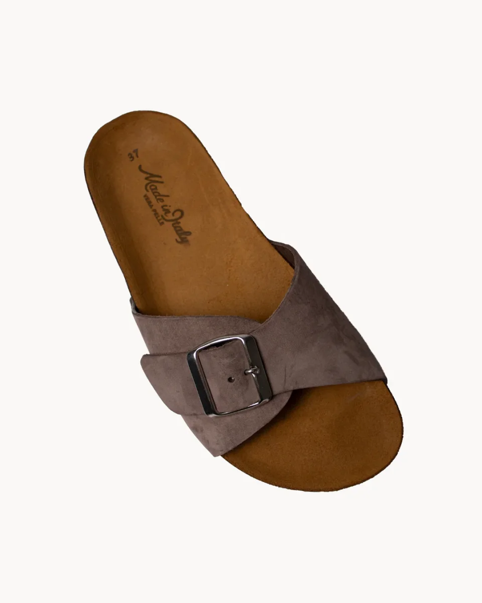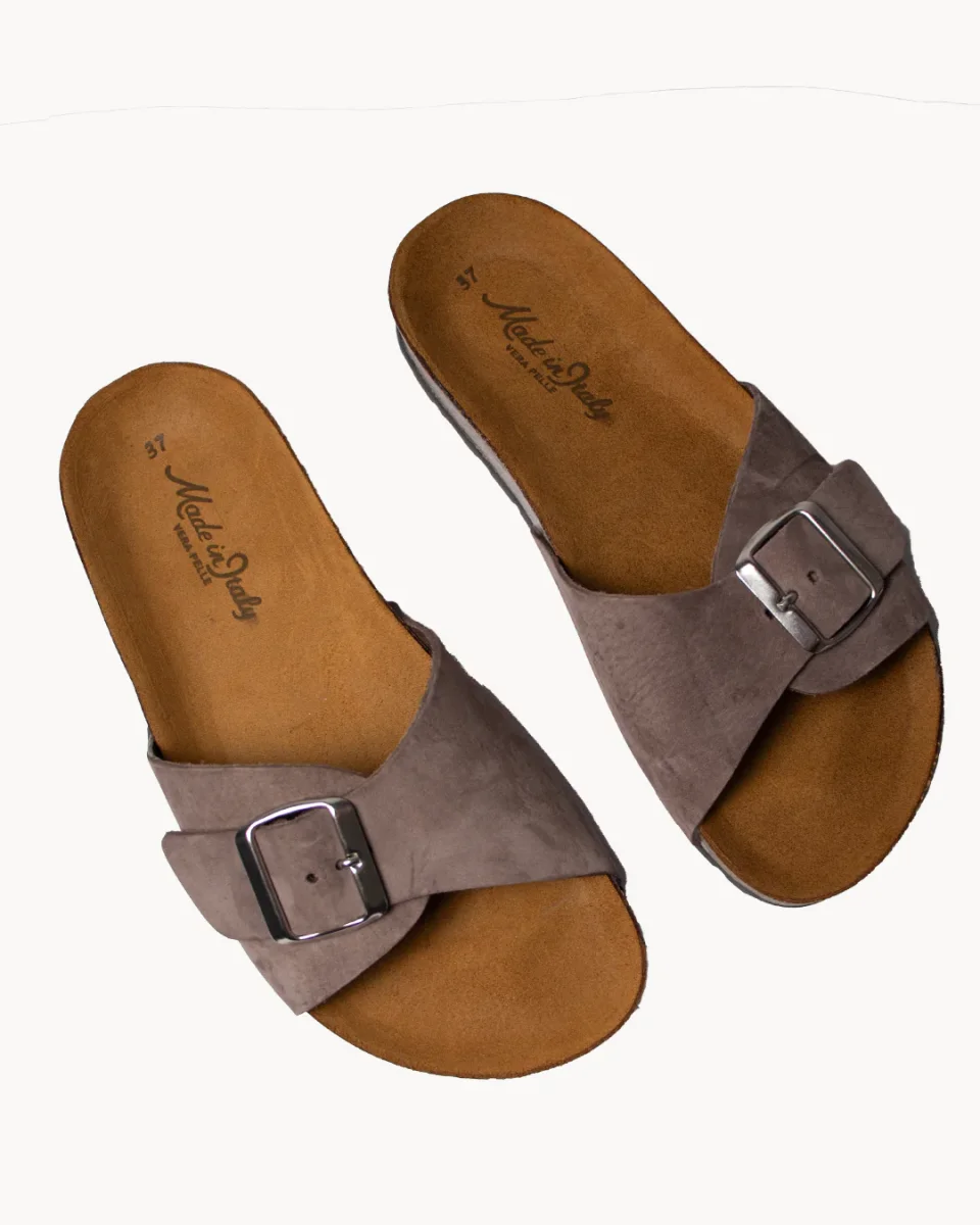 Colore articolo: TortoraTomaia in camoscioCinturino regolabile con fibbia in metalloIntersuola in sugheroSuola in gommaCalzata: acquista la tua solita tagliaMade in ItalyComposizione: Principale: 100% Vacchetta Dettagli: Sughero