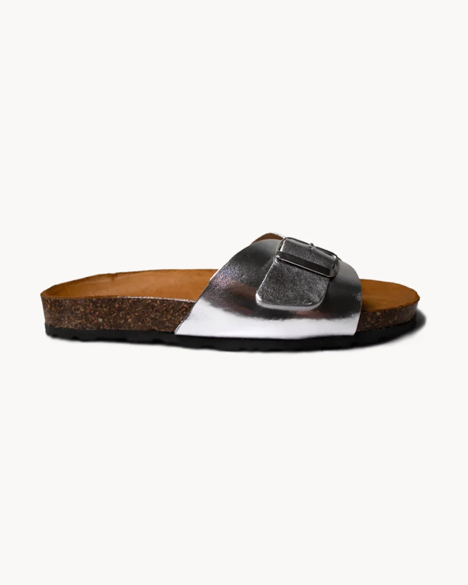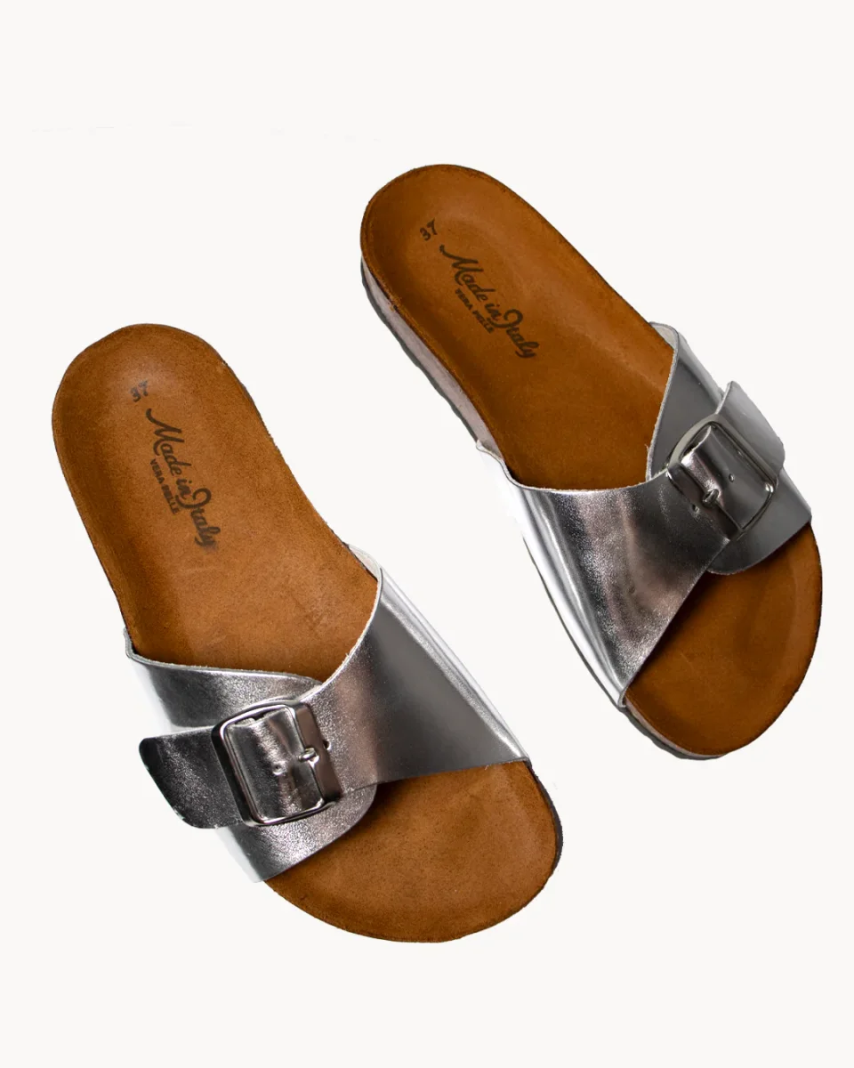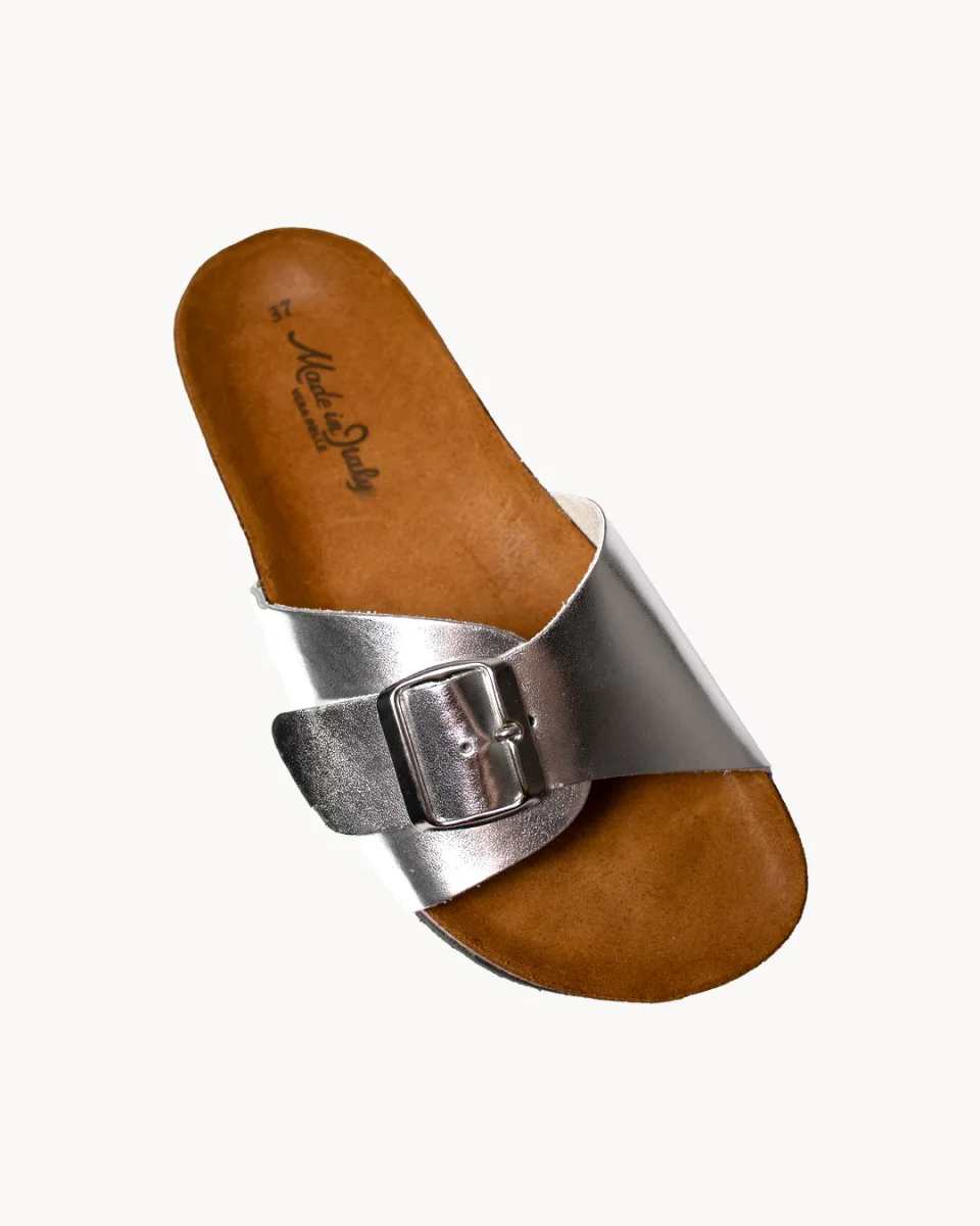 Colore articolo: ArgentoTomaia in pelle metallizzataCinturino regolabile con fibbia in metalloIntersuola in sugheroSuola in gommaCalzata: acquista la tua solita tagliaMade in ItalyComposizione: Principale: 100% Vacchetta Dettagli: Sughero